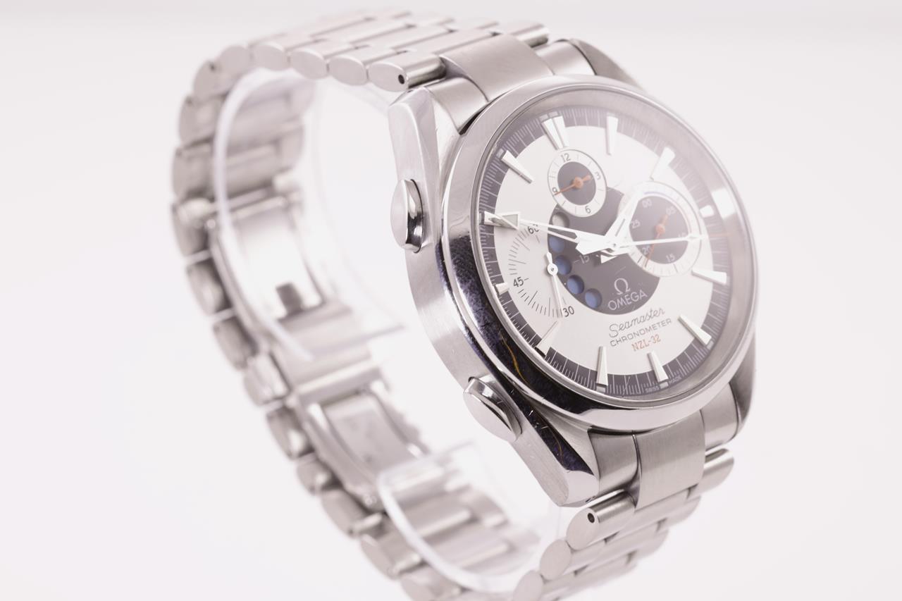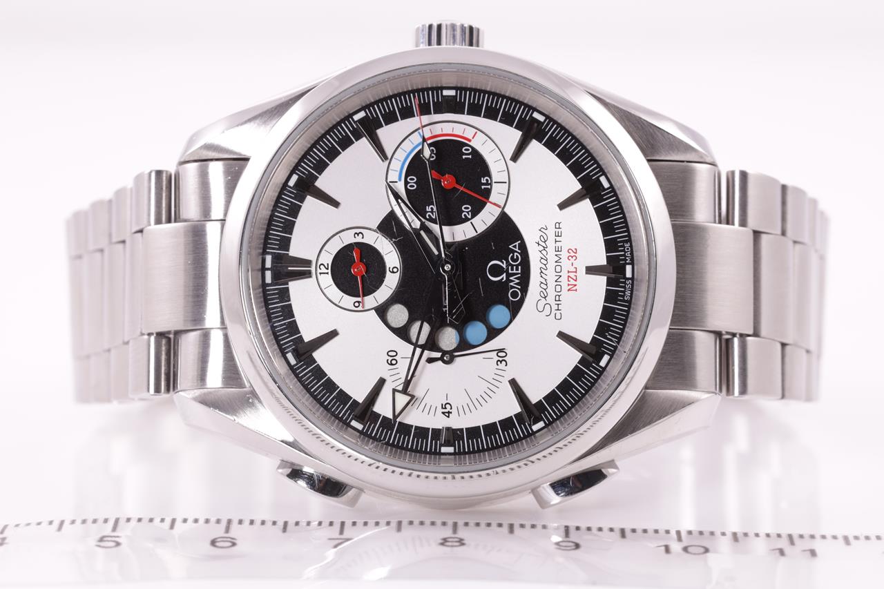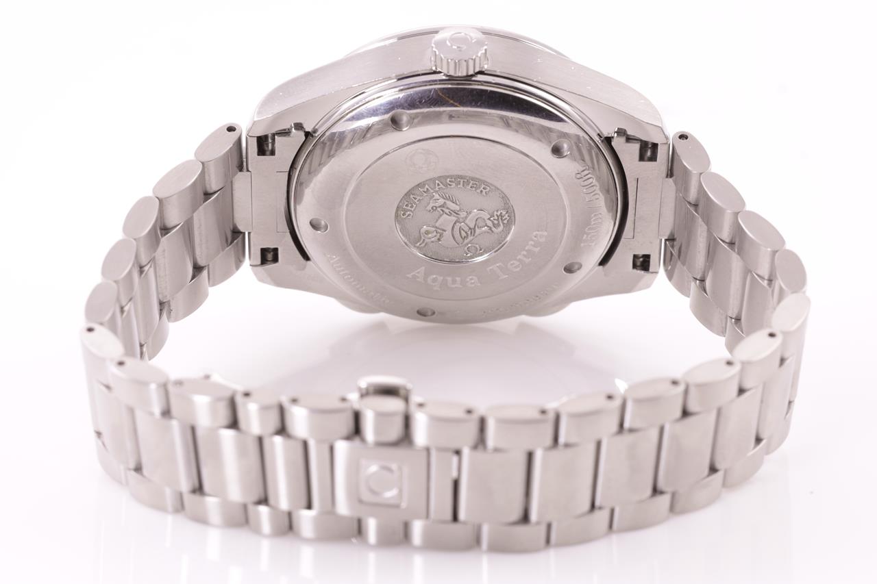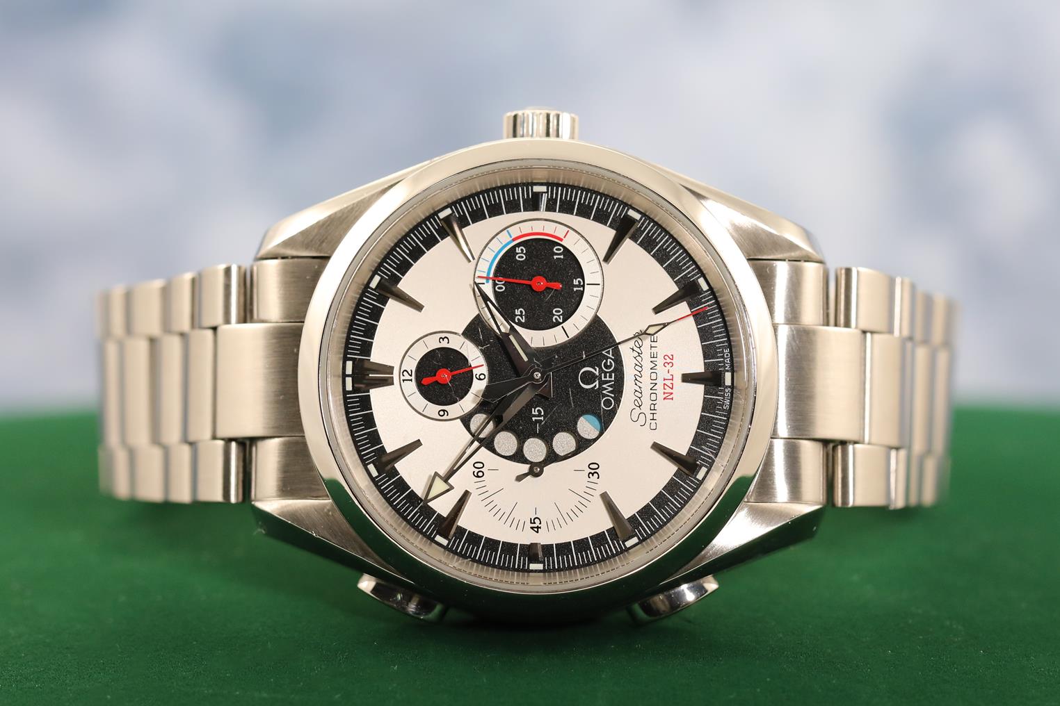 Omega Seamaster Aqua Terra NZL-32 stainless steel automatic mens watch. Silver/black chronograph dial, case diameter: 42.2mm, wrist size: 20cm, Swiss made. Ref# 2513.30. With Omega stainless steel bracelet and clasp. With Certificate of Authenticity, Omega International warranty card, pictograms, chronometer certificate card and Omega box. 3 month FSA warranty. (Pre-owned)