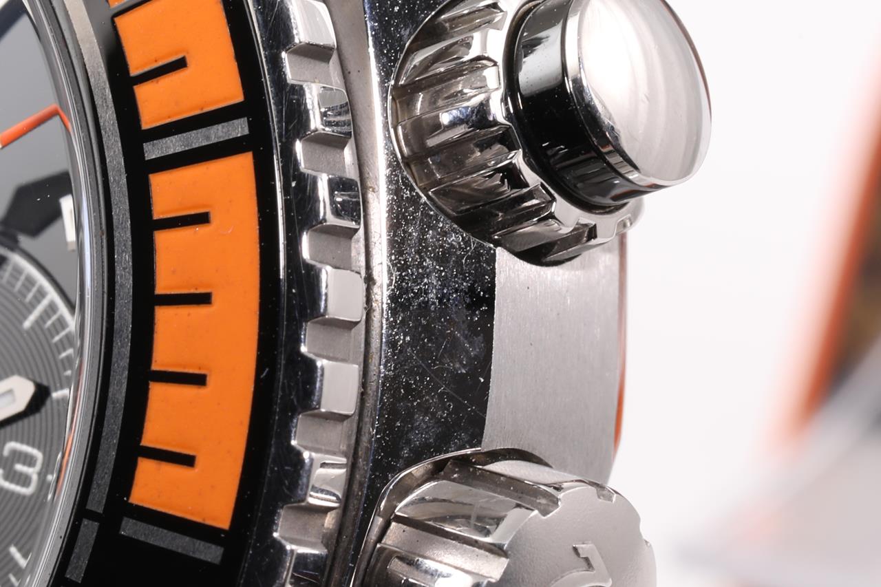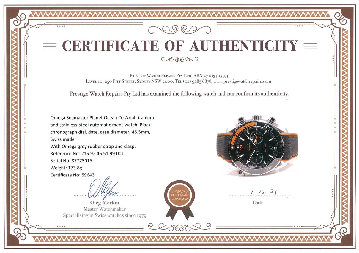 Omega Seamaster Planet Ocean Co-Axial titanium and stainless steel automatic mens watch. Black chronograph dial, date, case diameter: 45.5mm, wrist size: 18cm (adjustable), Swiss made. Ref #215.92.46.51.99.001. With Omega grey rubber strap and clasp. With Certificate of Authenticity. 3 month FSA warranty. (Pre-owned)