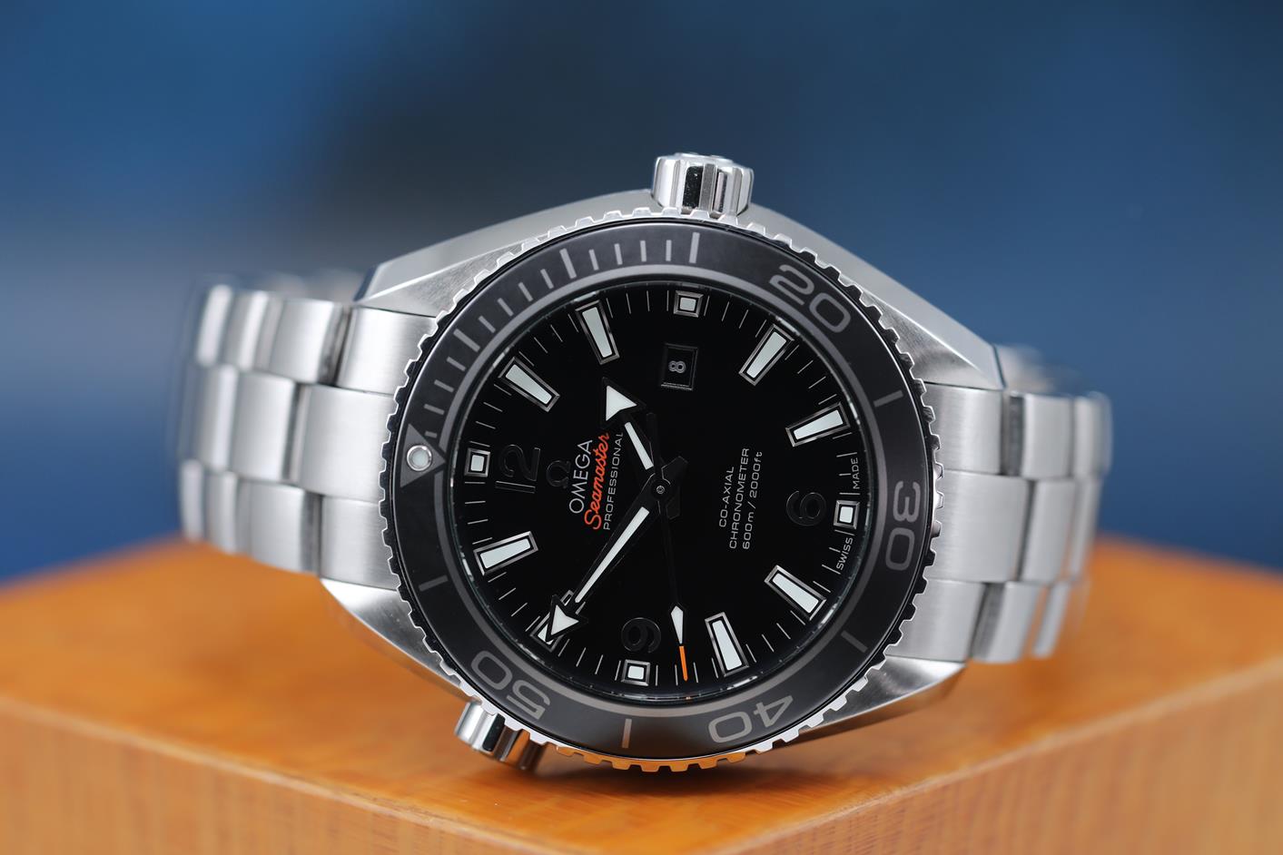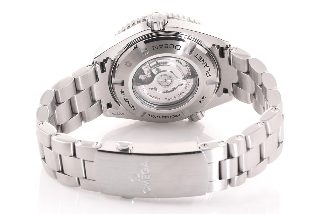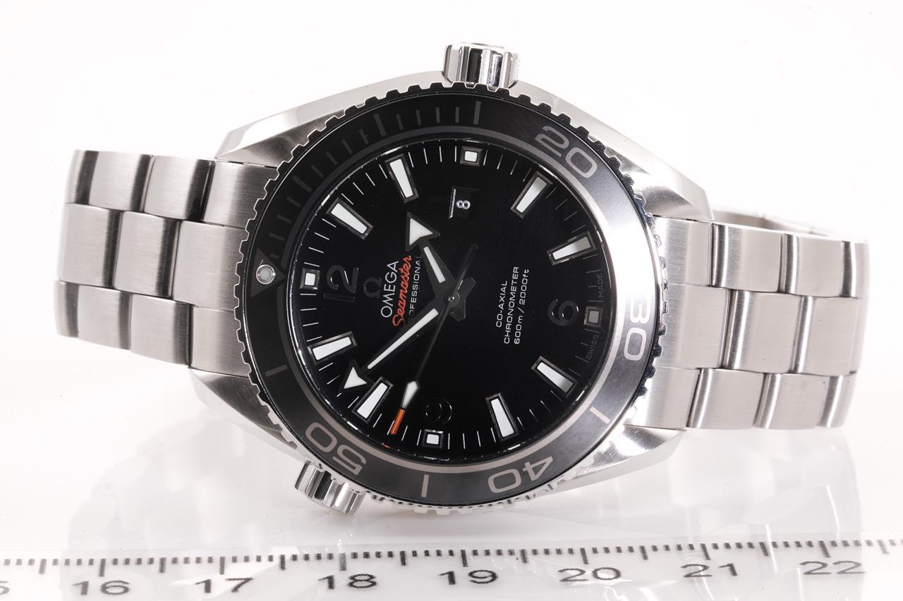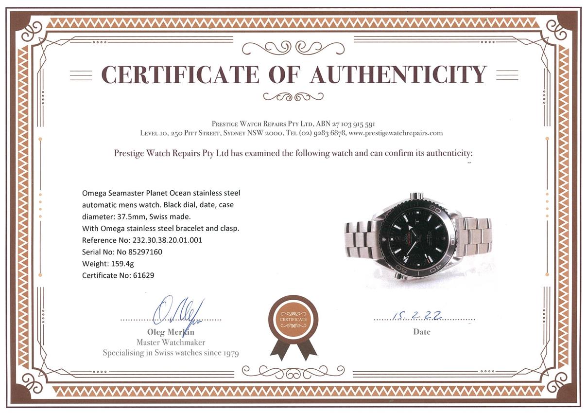 Omega Seamaster Planet Ocean stainless steel automatic mens watch. Black dial, date, case diameter: 37.5mm, wrist size: 17cm, Swiss made. Ref# 232.30.38.20.01.001. With Omega stainless steel bracelet and clasp. With Certificate of Authenticity, Omega International Warranty Card dated 30/5/2020 and Omega box. 3 month FSA warranty. (pre-owned)