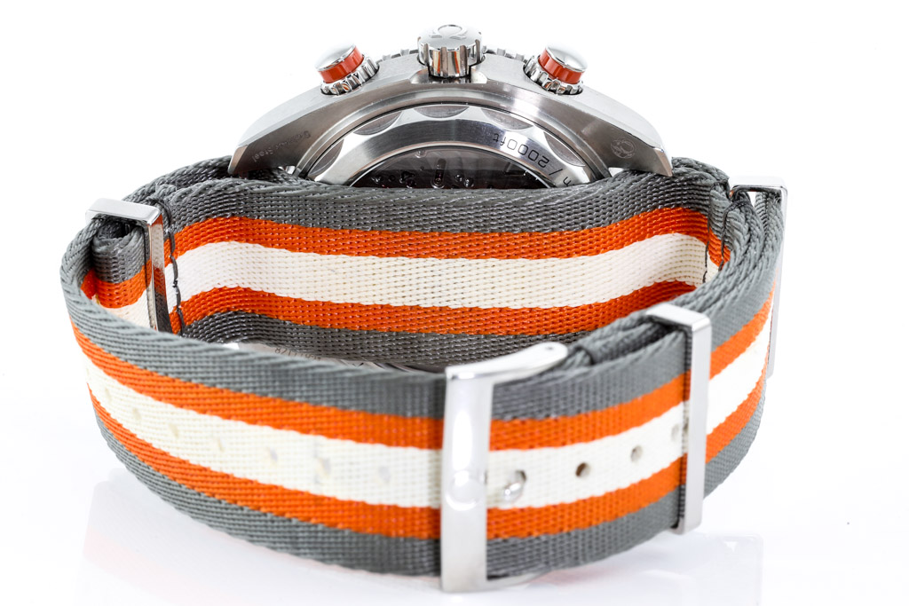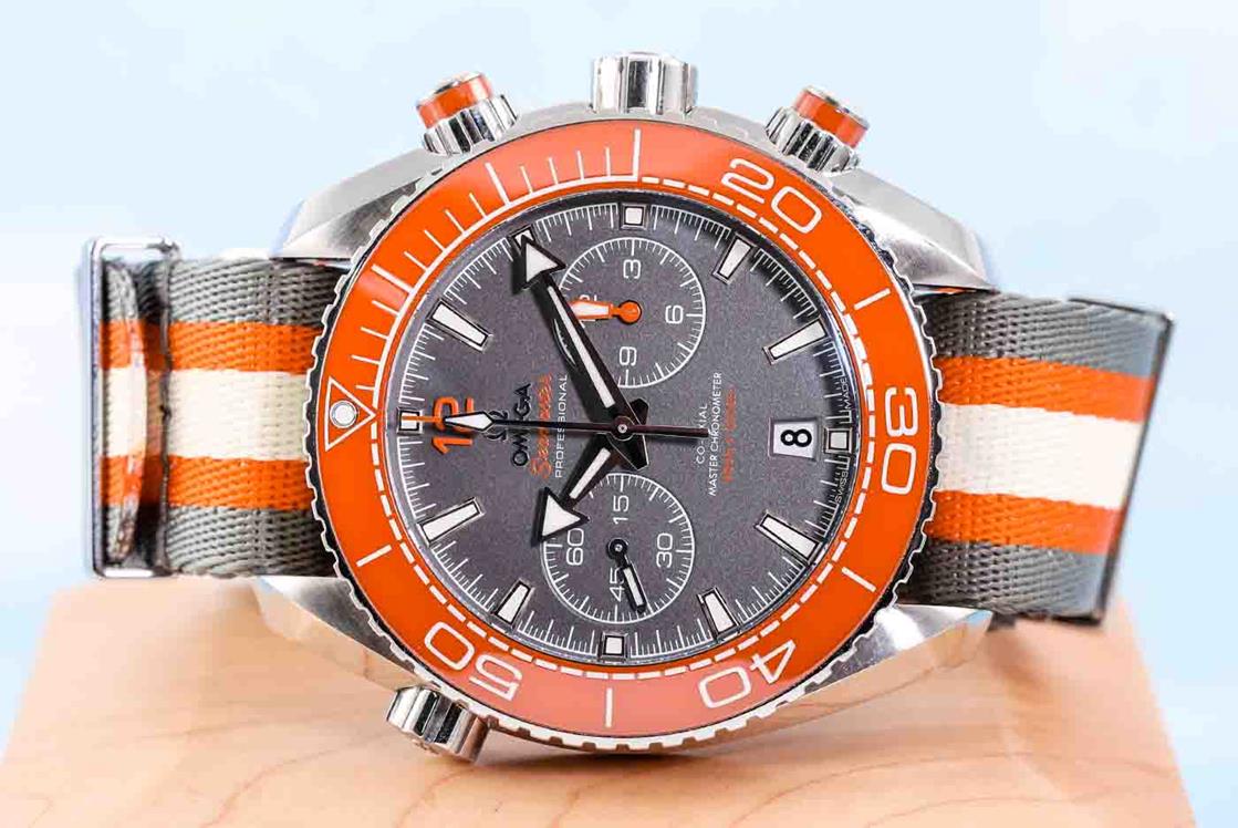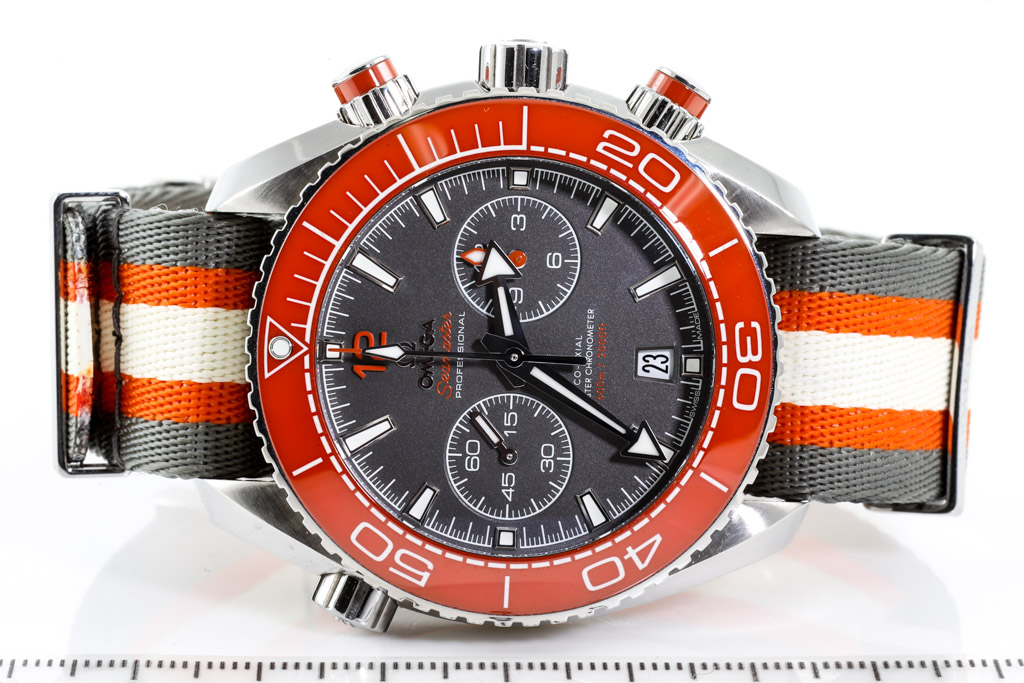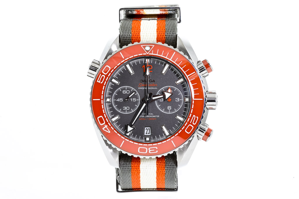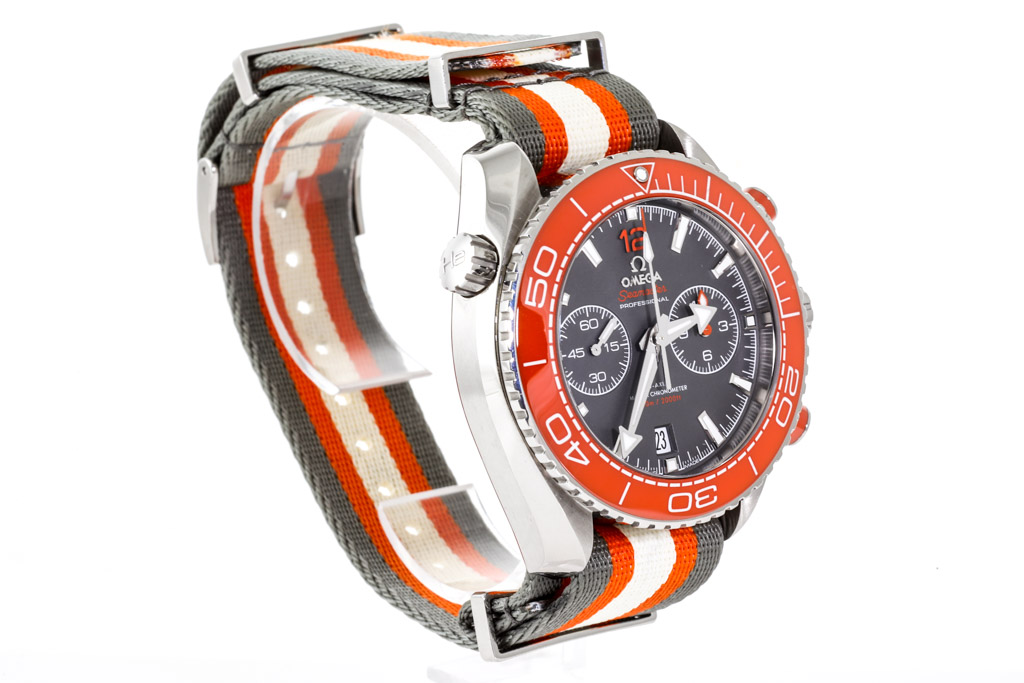 Omega Seamaster Planet Ocean stainless steel automatic mens watch. Grey chronograph dial, date, case diameter: 45.5mm, strap length: 25cm, Swiss made. Ref# 215.32.46.51.99.001. With Omega multi-colour NATO strap and buckle. With Certificate of Authenticity, Omega International warranty card dated 24/03/2020, Omega Master Chronometer card, Omega Pictograms card and Omega box. Balance of 5 year Omega warranty applies. (Pre-owned)