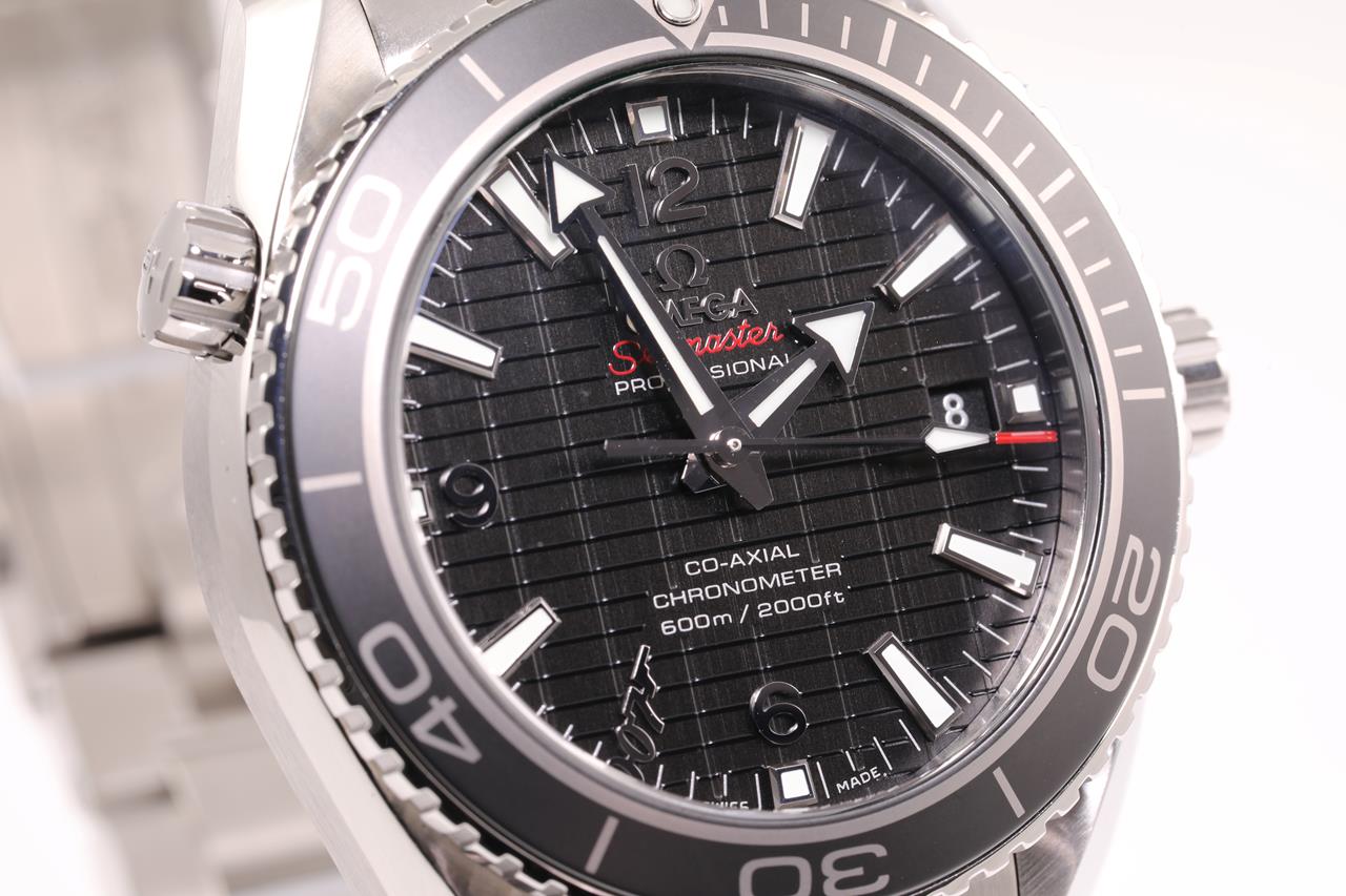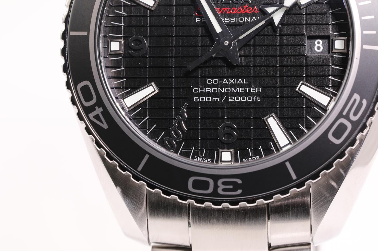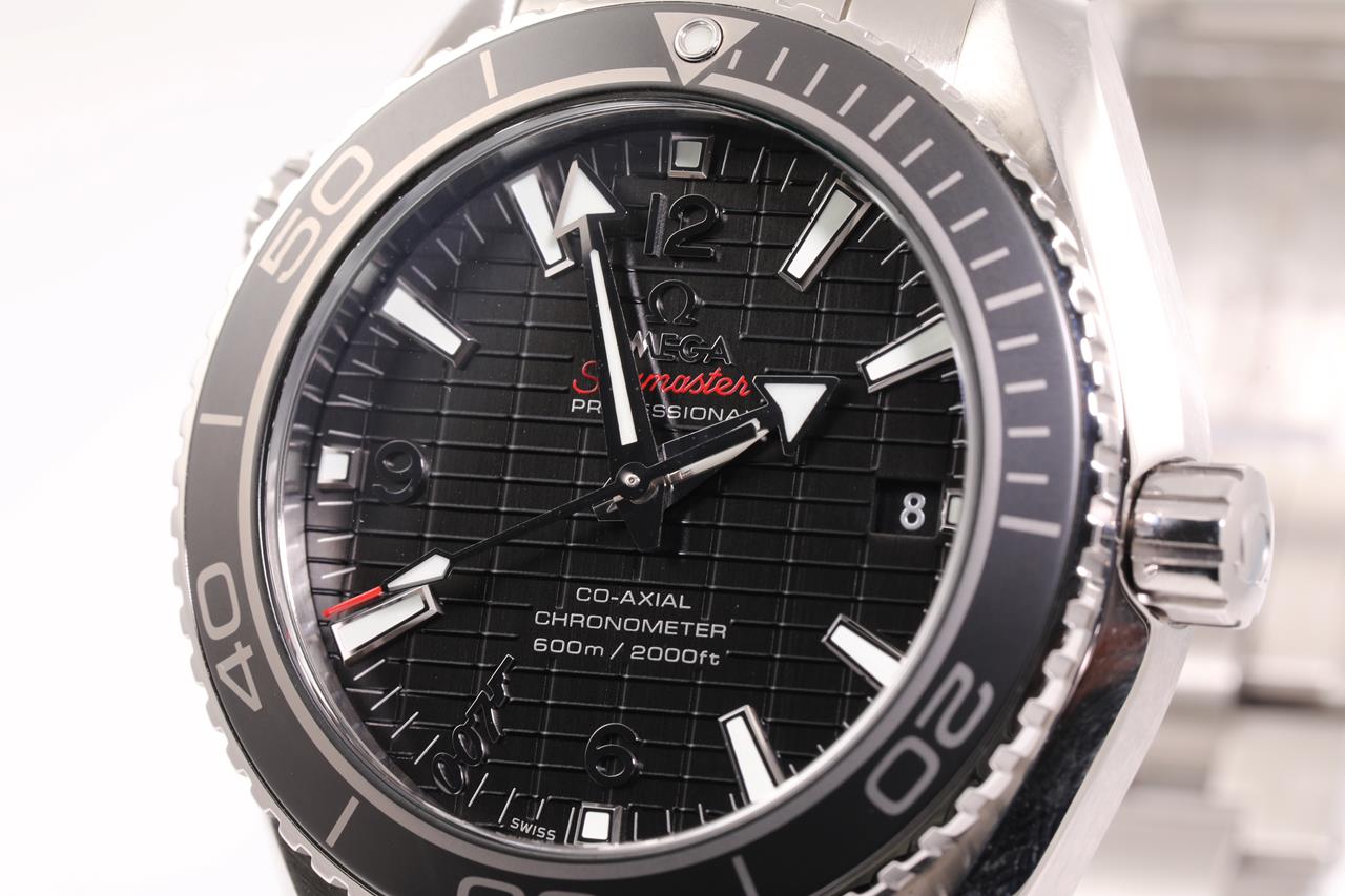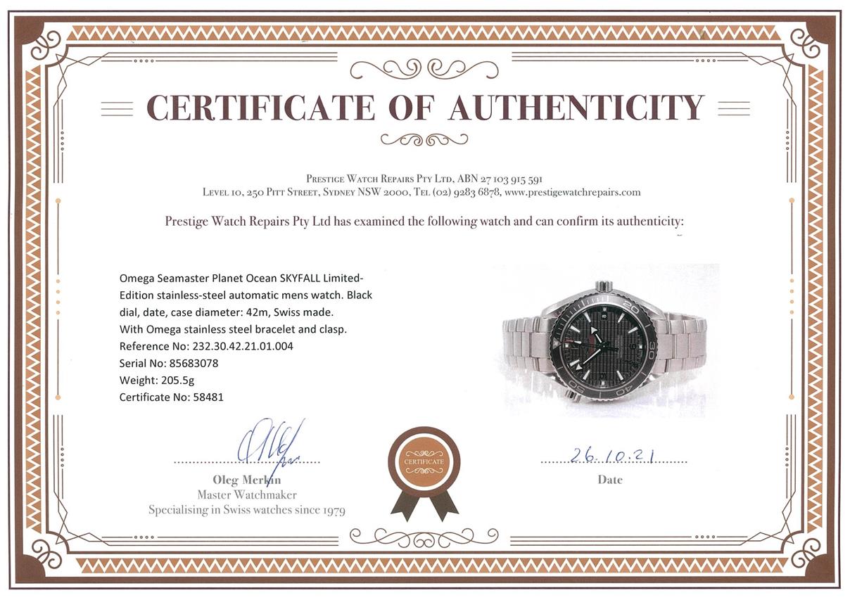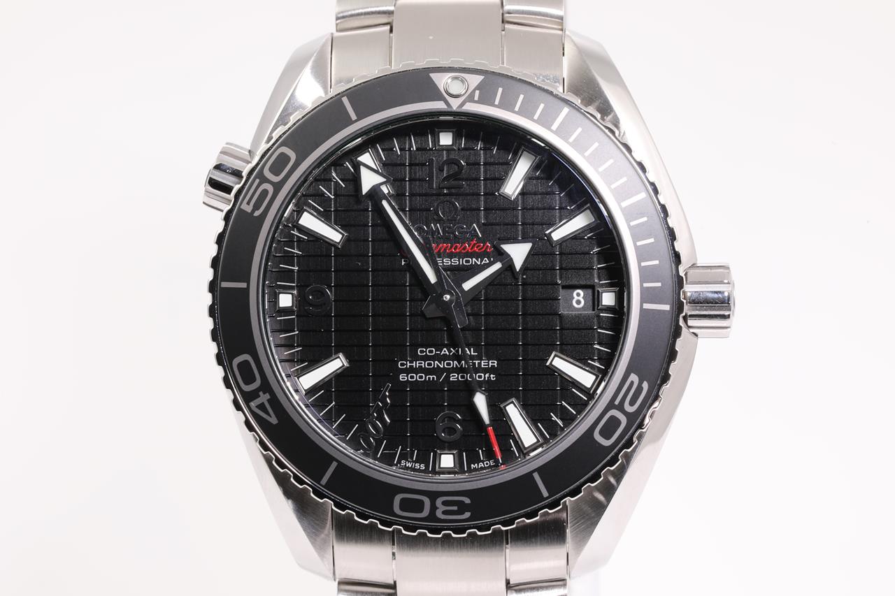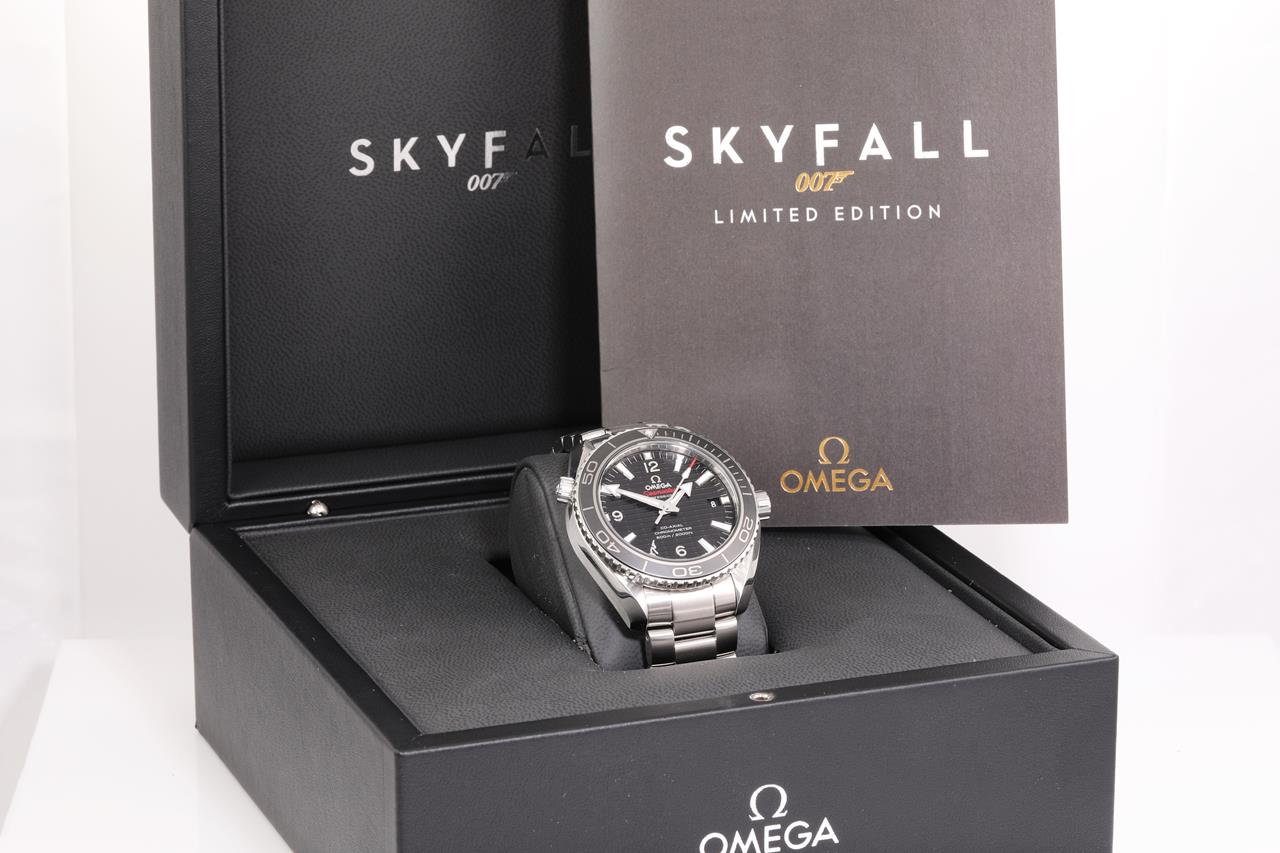 Omega Seamaster Planet Ocean SKYFALL Limited Edition of 5007 stainless steel automatic mens watch. Black dial, date, case diameter: 42m, wrist size: 21cm, Swiss made. Ref# 232.30.42.21.01.004. With Omega stainless steel bracelet and clasp. With certificate of authenticity, Omega international warranty card, pictograms, chronometer certificate card, limited series card, Omega pen, Cocktail shaker, notebook and Omega box. 3 month FSA warranty. (Pre-owned)