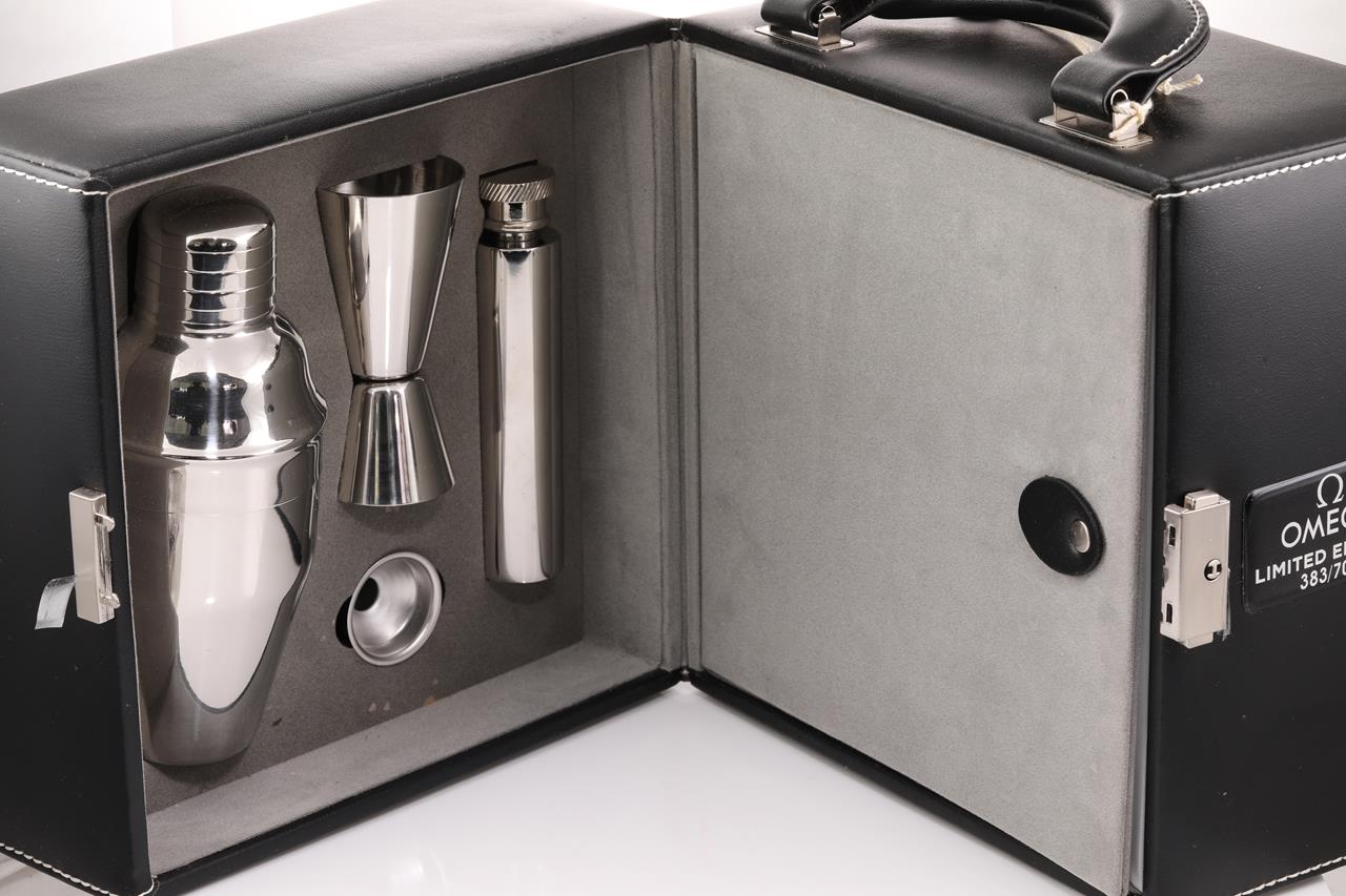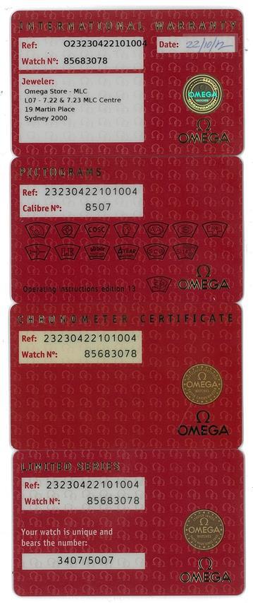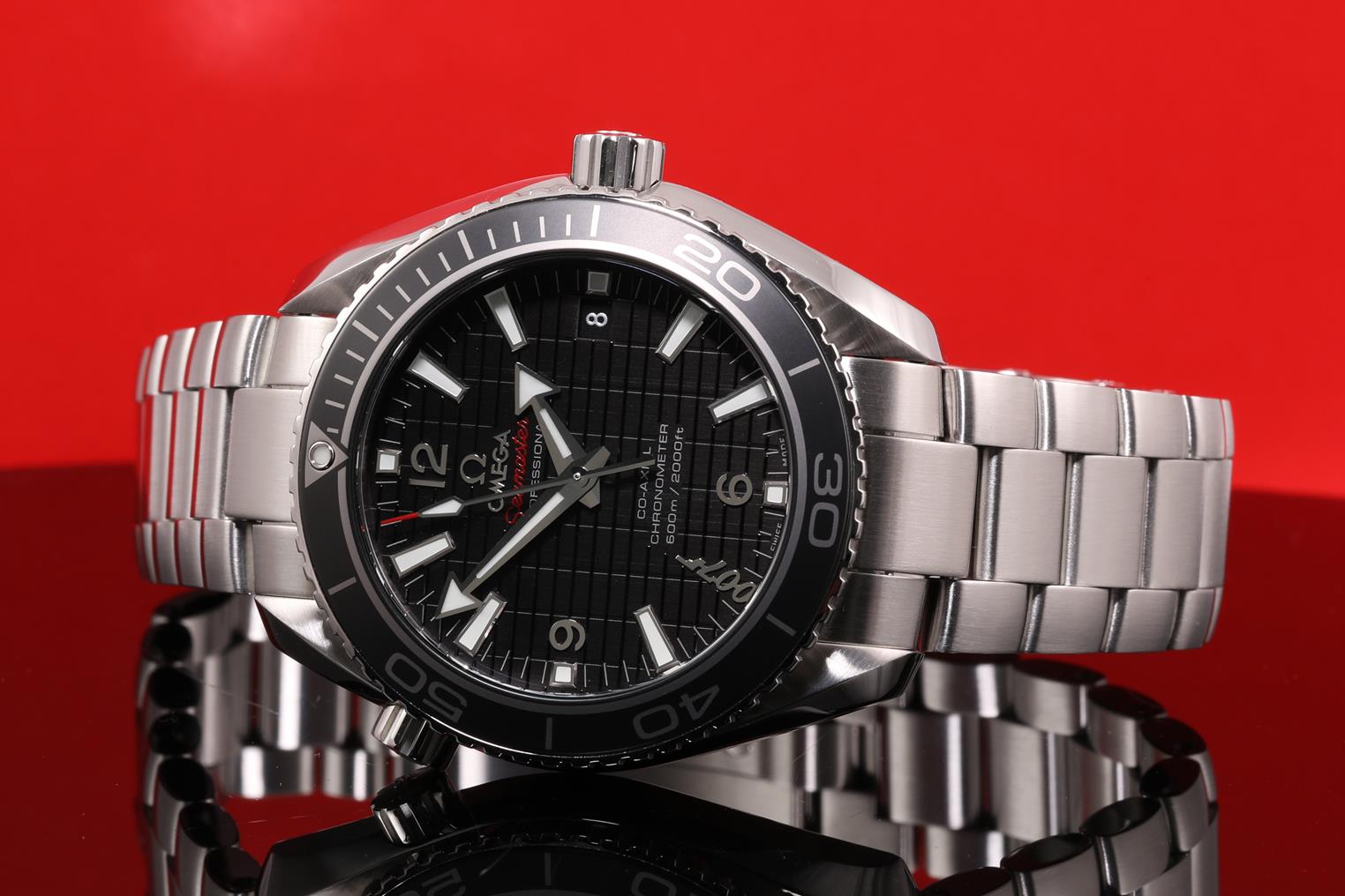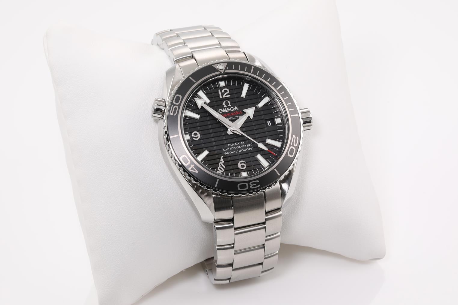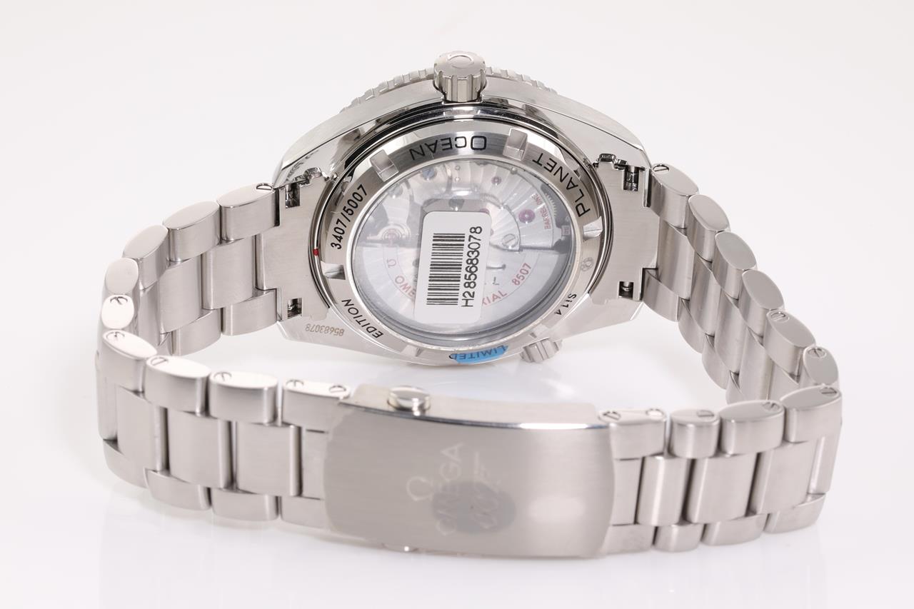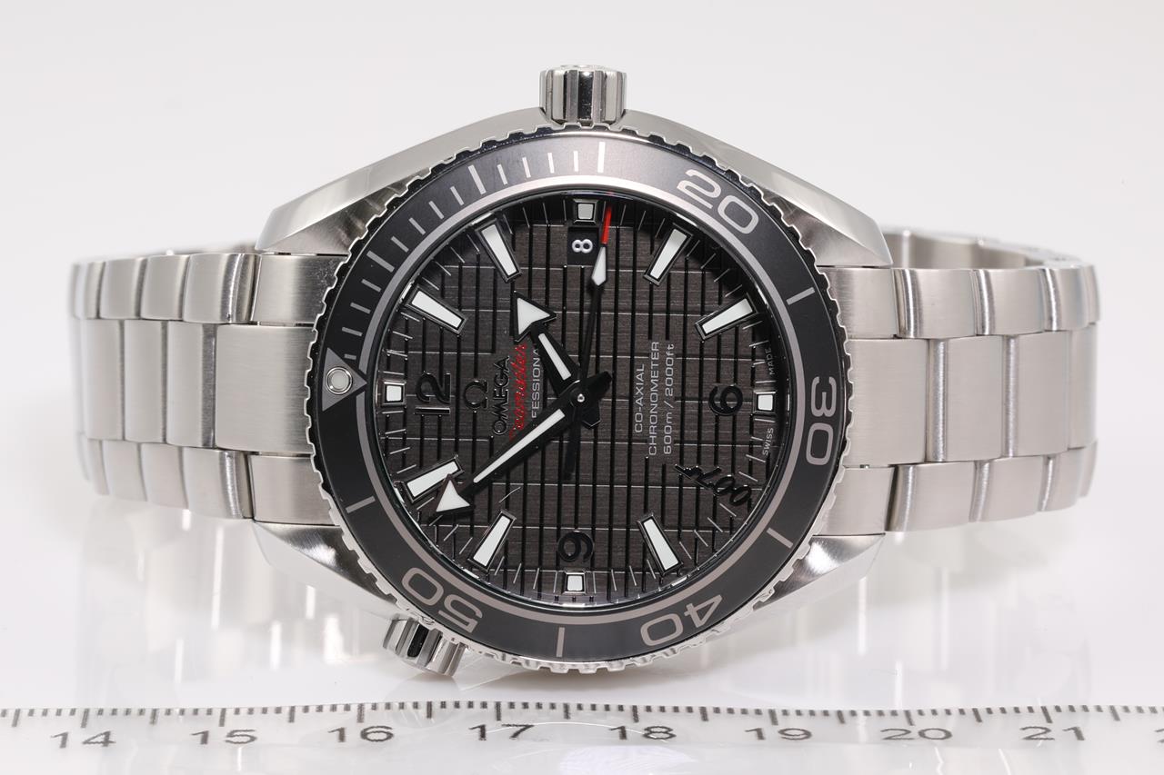 Omega Seamaster Planet Ocean SKYFALL Limited Edition of 5007 stainless steel automatic mens watch. Black dial, date, case diameter: 42m, wrist size: 21cm, Swiss made. Ref# 232.30.42.21.01.004. With Omega stainless steel bracelet and clasp. With certificate of authenticity, Omega international warranty card, pictograms, chronometer certificate card, limited series card, Omega pen, Cocktail shaker, notebook and Omega box. 3 month FSA warranty. (Pre-owned)