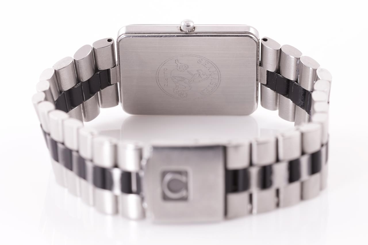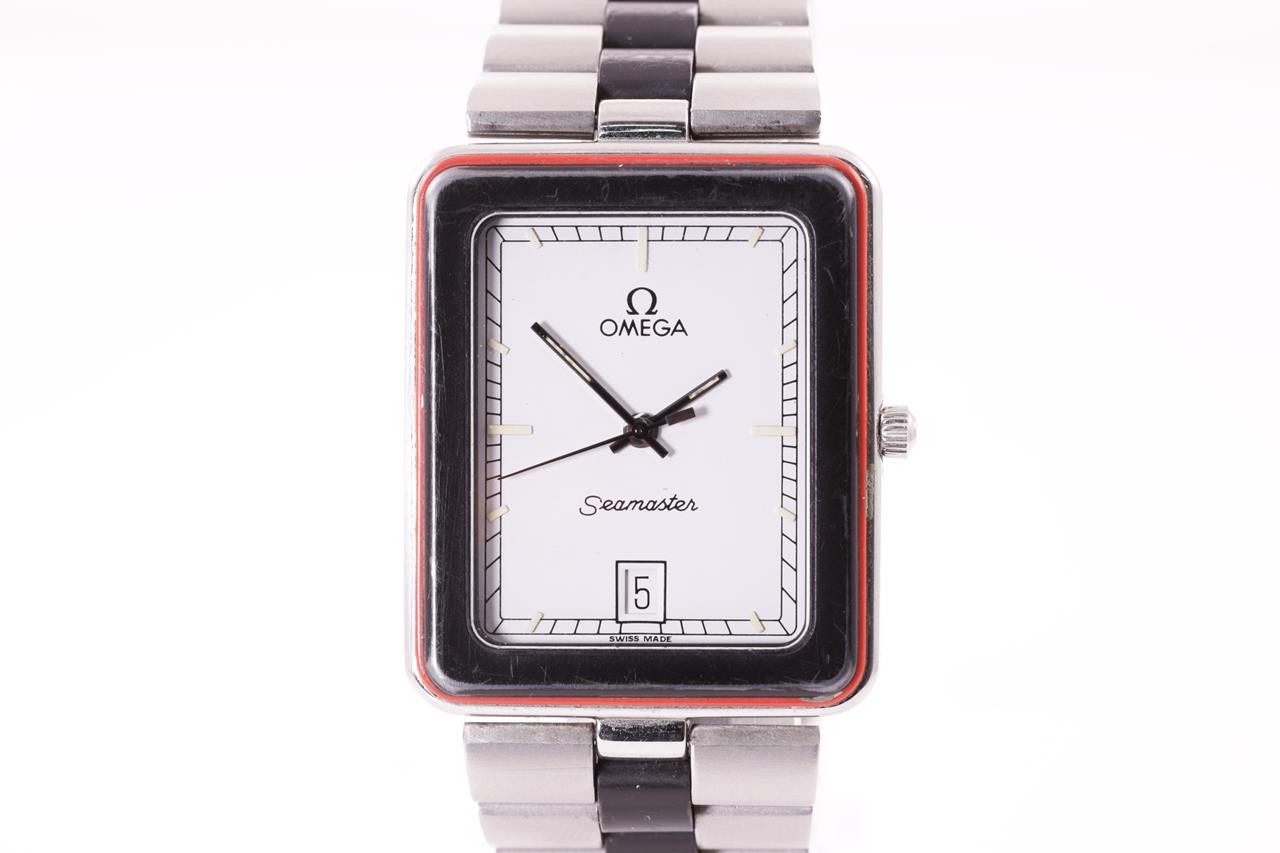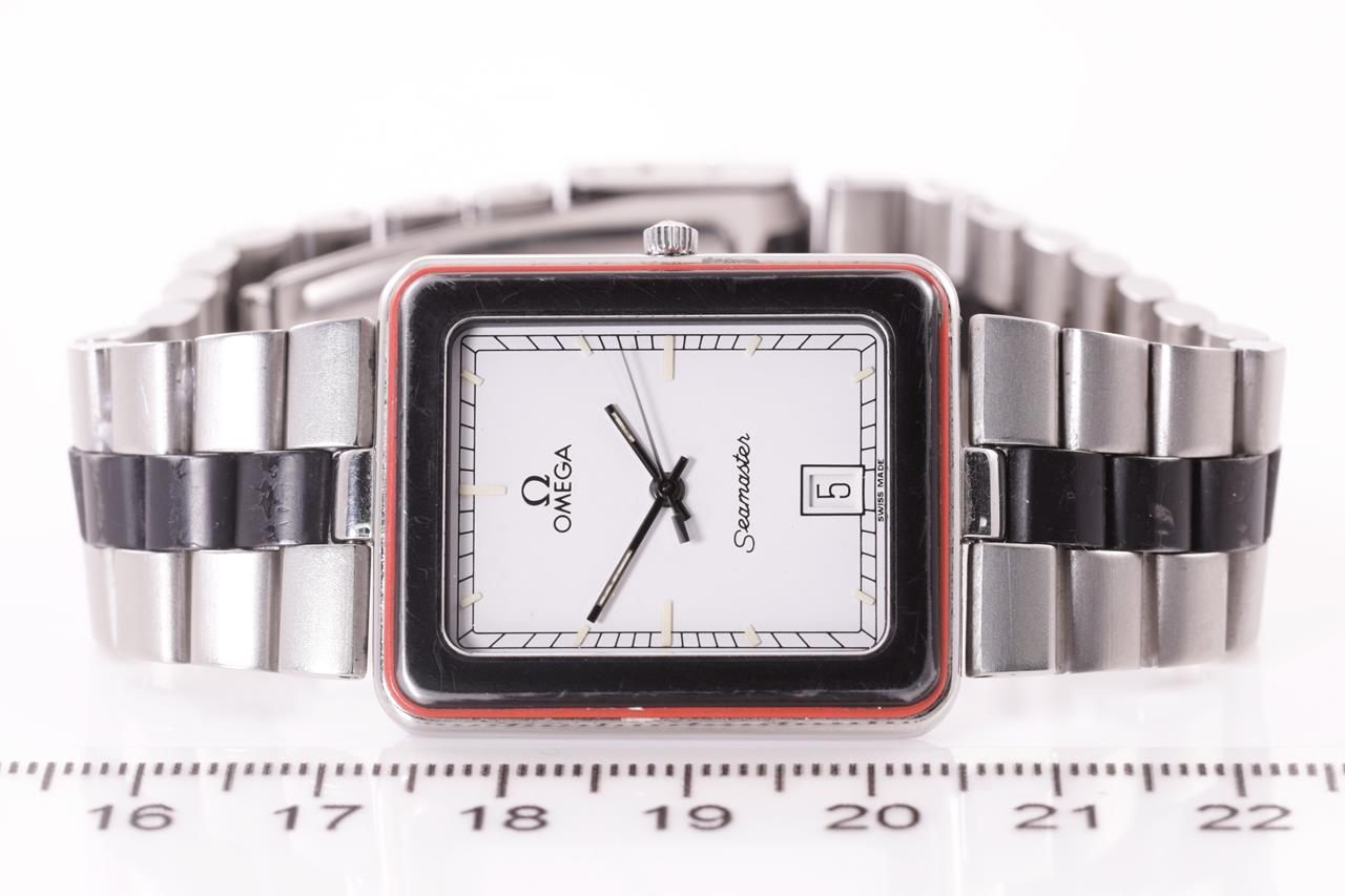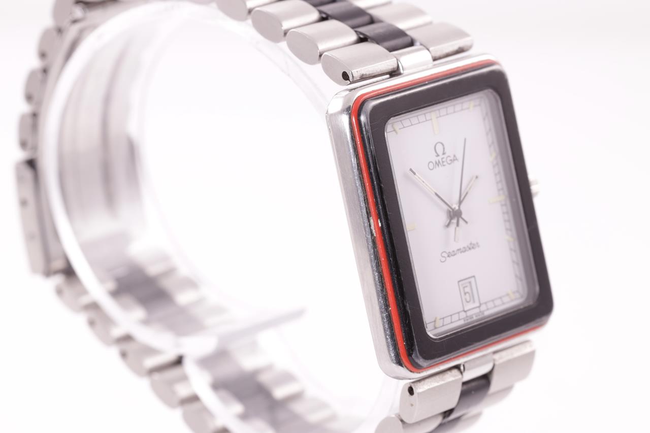 Omega Seamaster stainless steel quartz watch. White dial with date. Case diameter: 32mm x 26mm. Wrist size: 17cm. Swiss made. Ref# 396.1004. With Omega stainless steel with black inlay bracelet and clasp. 3 month FSA warranty. (Pre-owned)