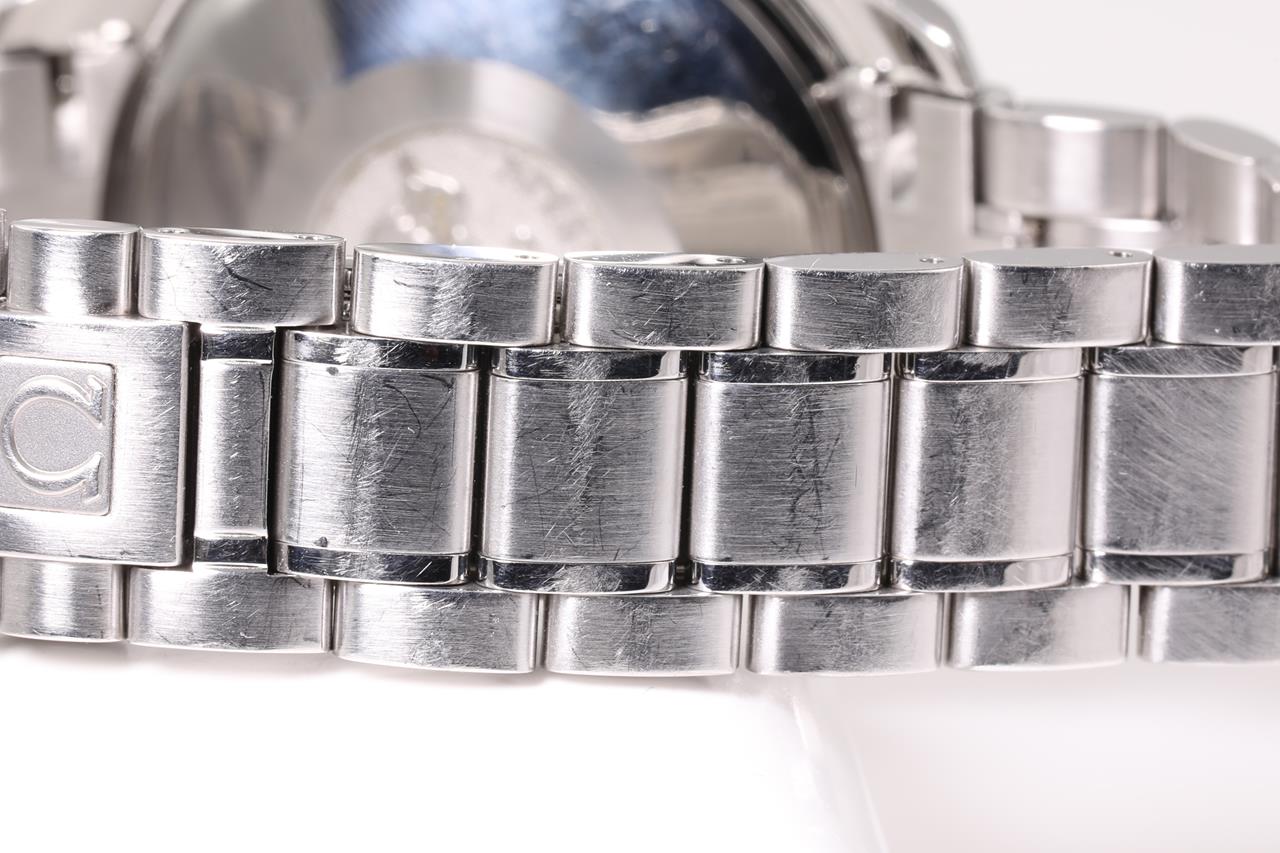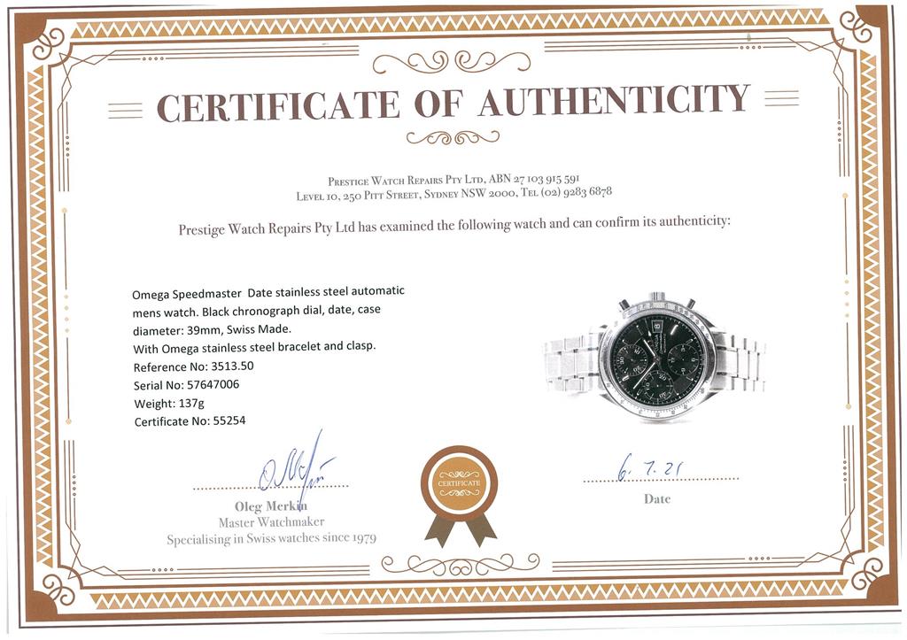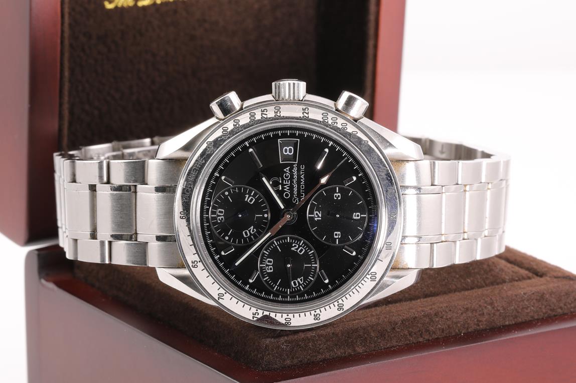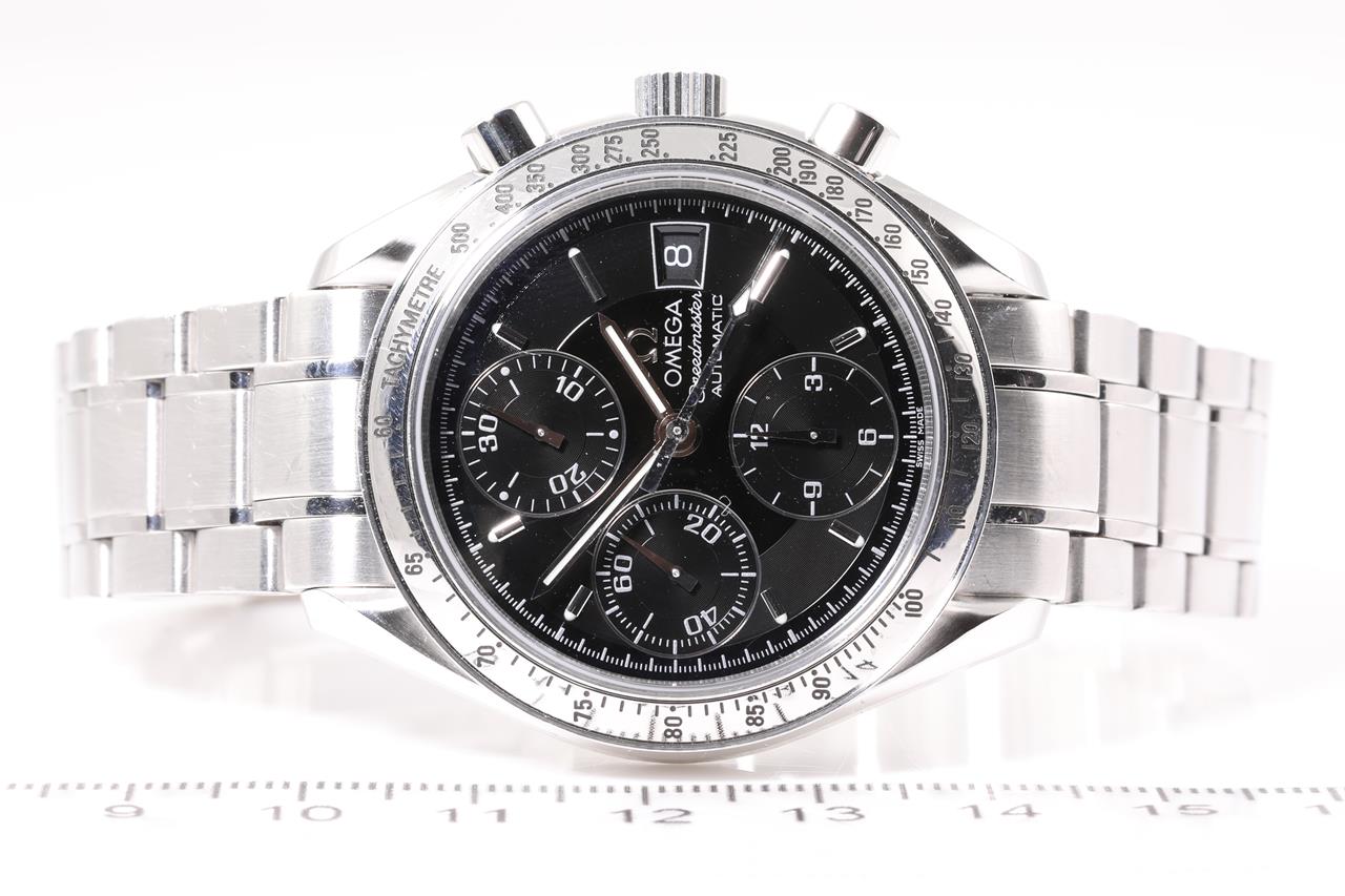 Omega Speedmaster Date stainless steel automatic mens watch. Black chronograph dial, date, case diameter: 39mm, wrist size: 20cm, Swiss made. Ref #3513.50. With Omega stainless steel bracelet and clasp. With Certificate of Authenticity, Omega International warranty card dated 20/11/2013 and Omega box. 3 month FSA warranty. (Pre-owned)