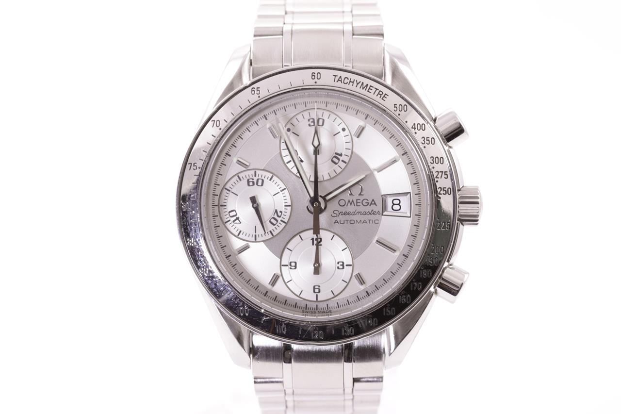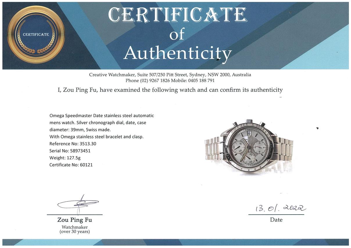 Omega Speedmaster Date stainless steel automatic mens watch. Silver chronograph dial, date, case diameter: 39mm, wrist size: 16cm, Swiss made. Ref# 3513.30. With Omega stainless steel bracelet and clasp. With Certificate of Authenticity and Omega box. 3 month FSA warranty. (Pre-owned)