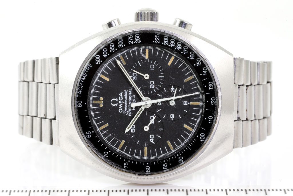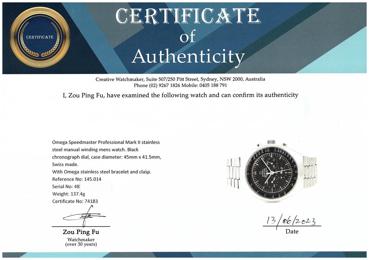 Omega Speedmaster Professional Mark II stainless steel manual winding mens watch. Black chronograph dial, case diameter: 45mm x 41.5mm, wrist size: 19cm, Swiss made. Ref# 145.014. With Omega stainless steel bracelet and clasp. With Certificate of Authenticity. 3 month FSA warranty (Pre-owned)