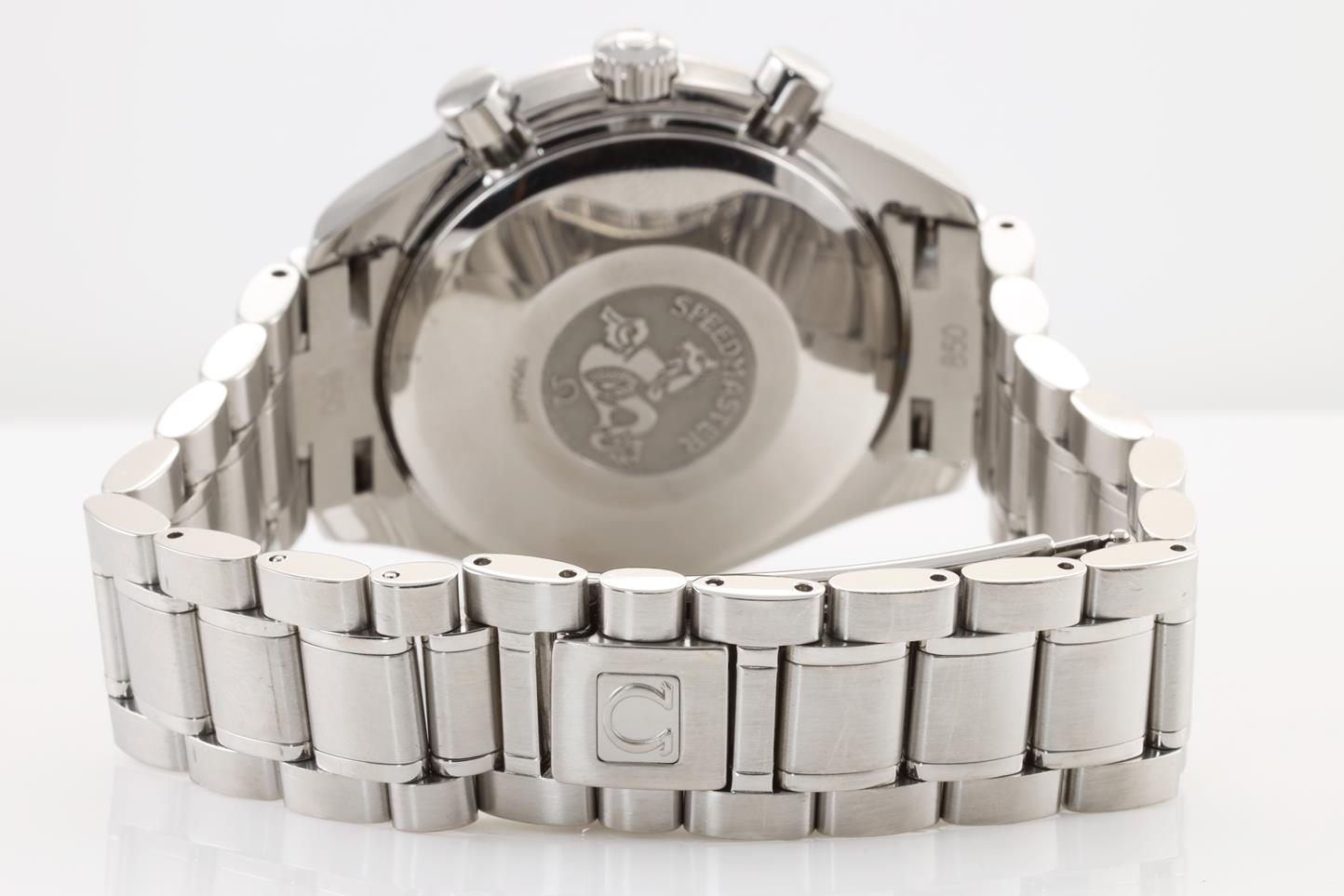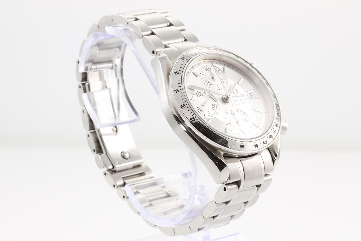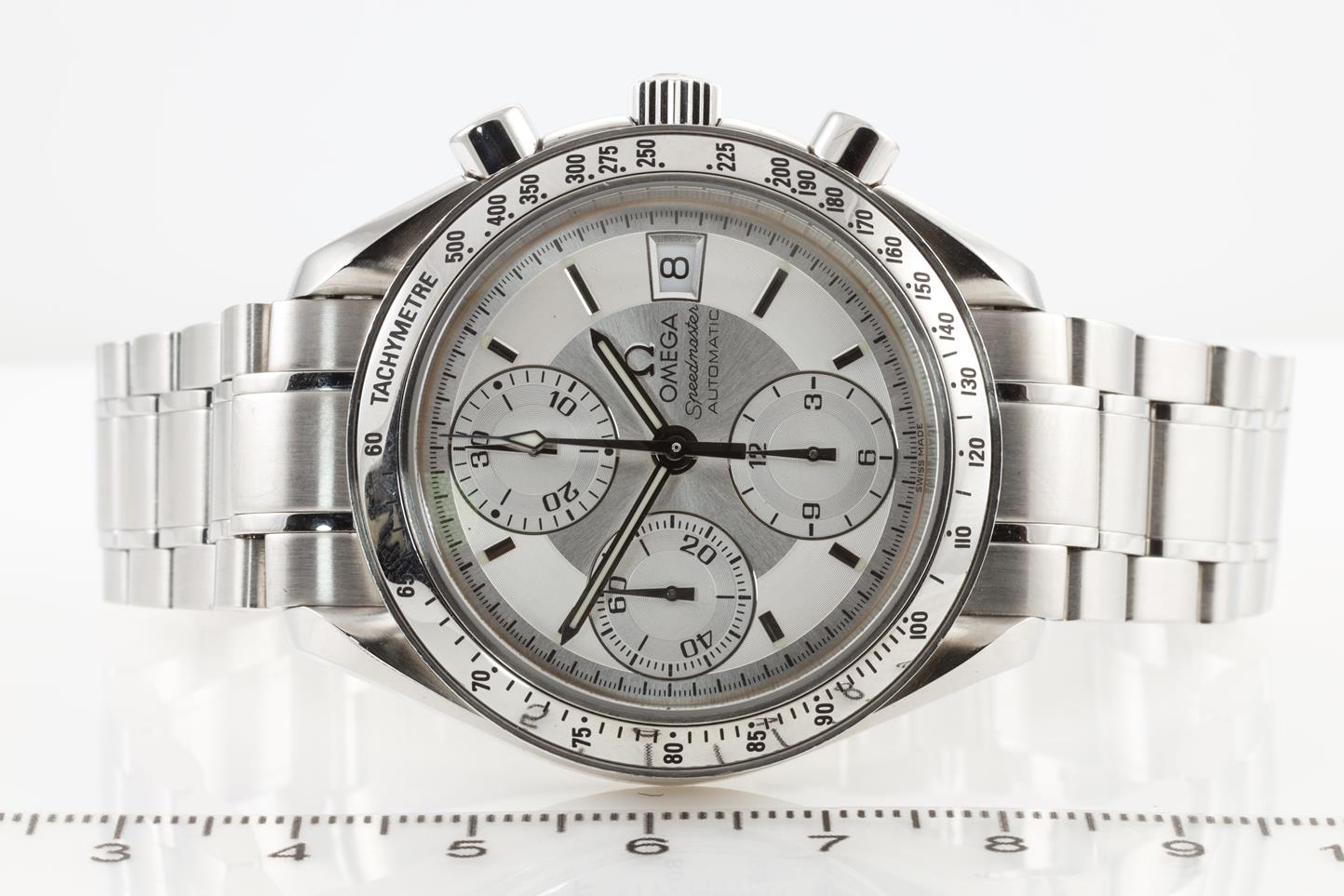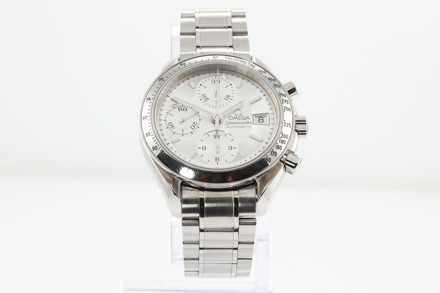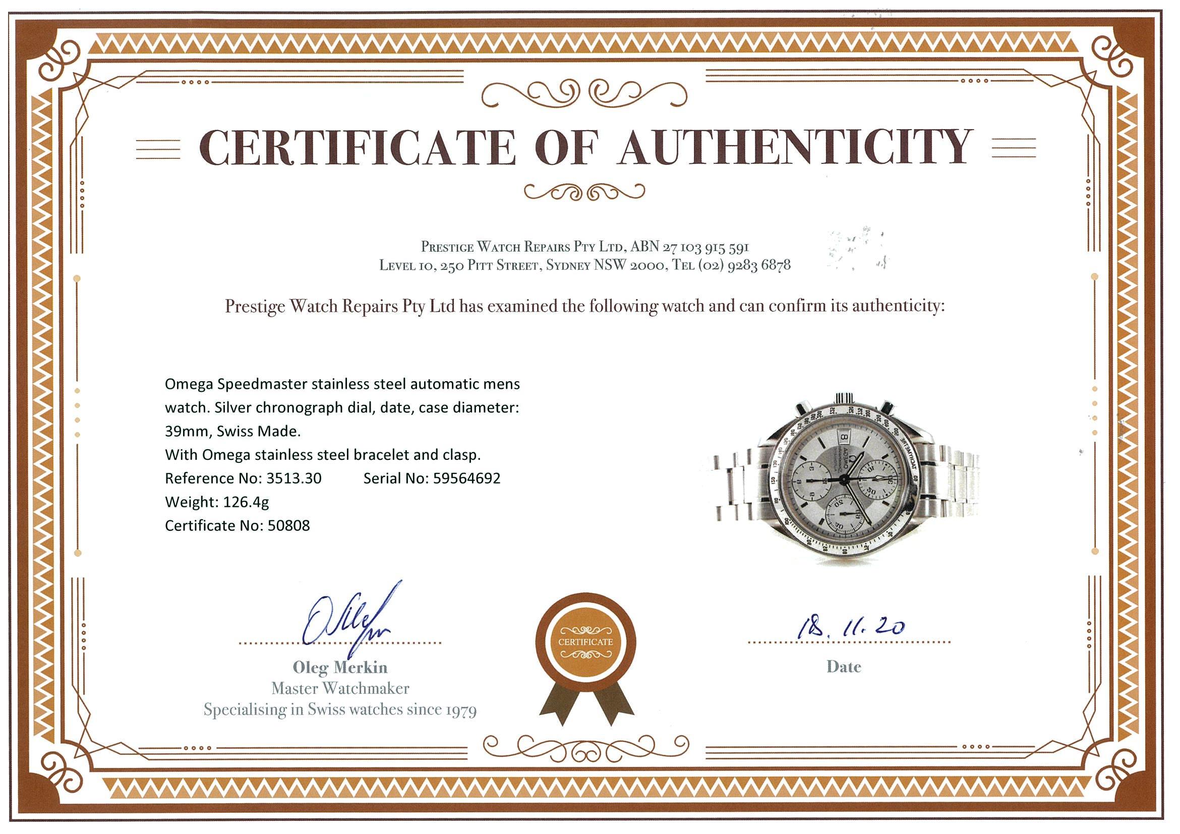 Omega Speedmaster stainless steel automatic mens watch. Silver chronograph dial, date, wrist size: 17.5cm, case diameter: 39mm, Swiss Made. Ref# 3513.30. With Omega stainless steel bracelet and clasp. With Certificate of Authenticity and International warranty card dated 28/04/06. 3 month FSA warranty. (Pre-owned)