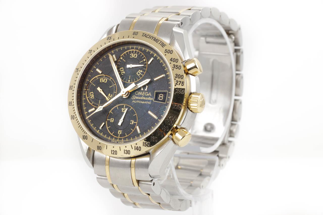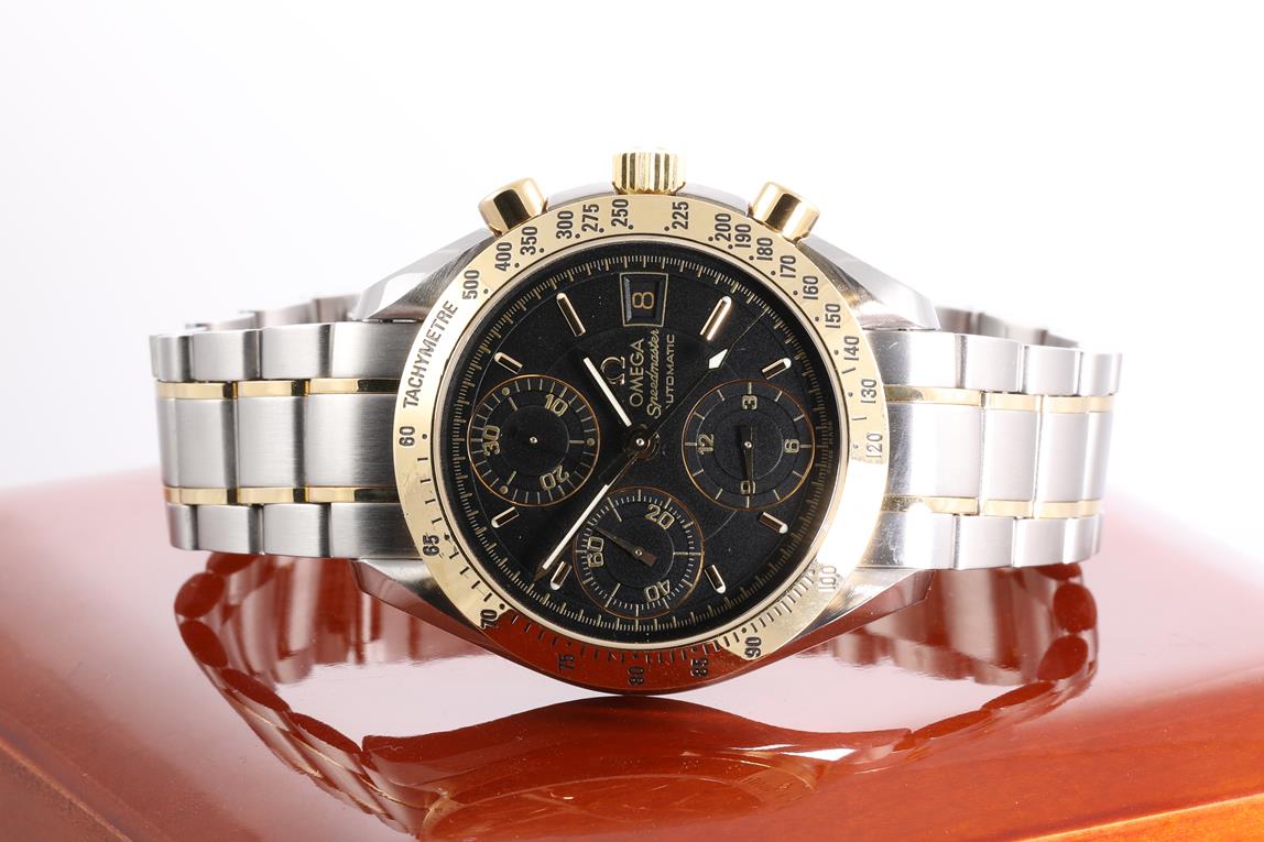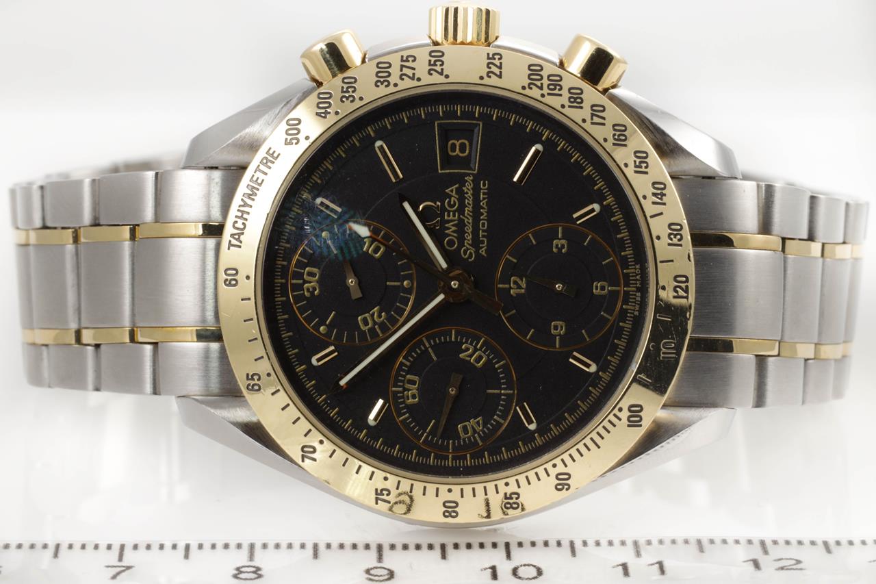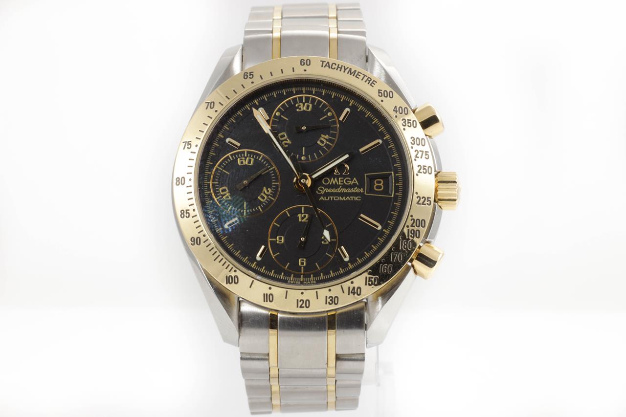 Omega Speedmaster 18ct yellow gold and stainless steel automatic mens watch. Black chronograph dial, date, case diameter: 39mm, wrist size: 18cm, Swiss made. Ref# 3313.50. With Omega two-tone stainless steel bracelet and clasp. With Certificate of Authenticity and Omega box. 3 month FSA warranty (Pre-owned)