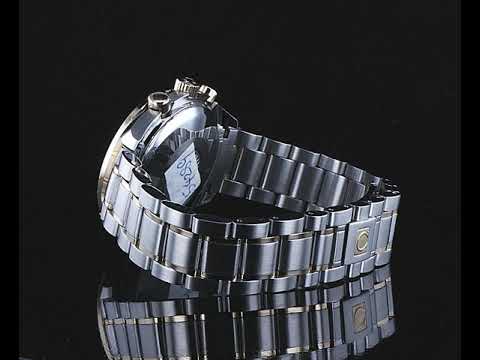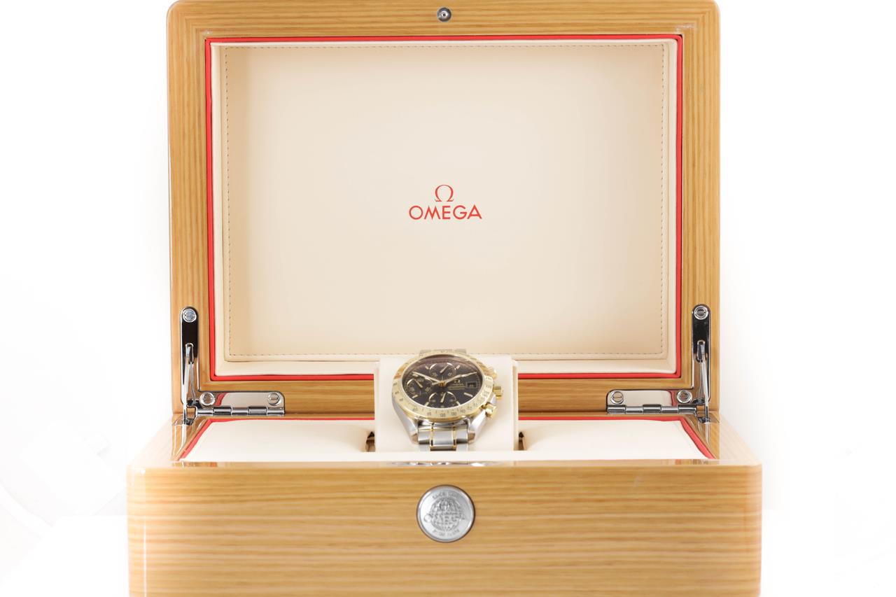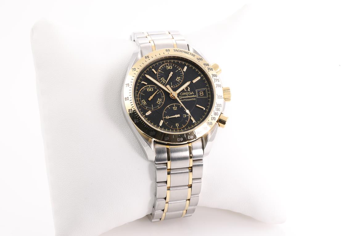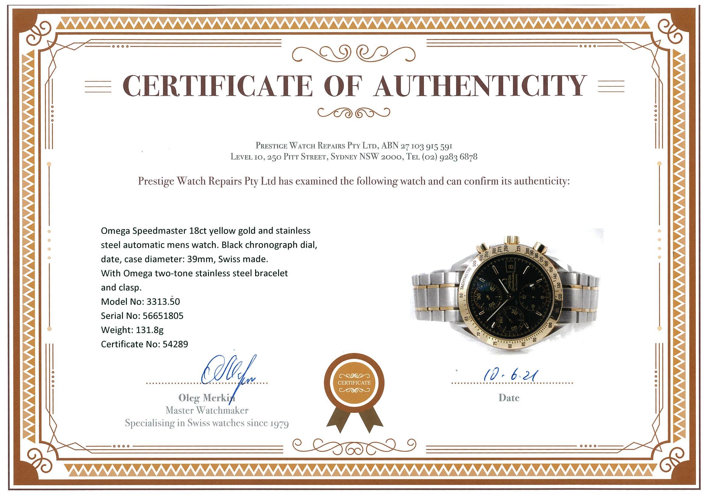 Omega Speedmaster 18ct yellow gold and stainless steel automatic mens watch. Black chronograph dial, date, case diameter: 39mm, wrist size: 18cm, Swiss made. Ref# 3313.50. With Omega two-tone stainless steel bracelet and clasp. With Certificate of Authenticity and Omega box. 3 month FSA warranty (Pre-owned)