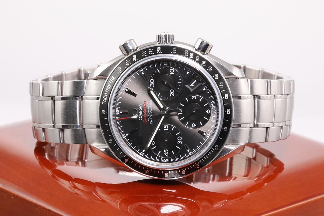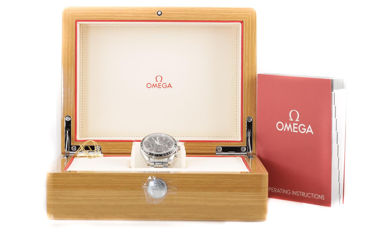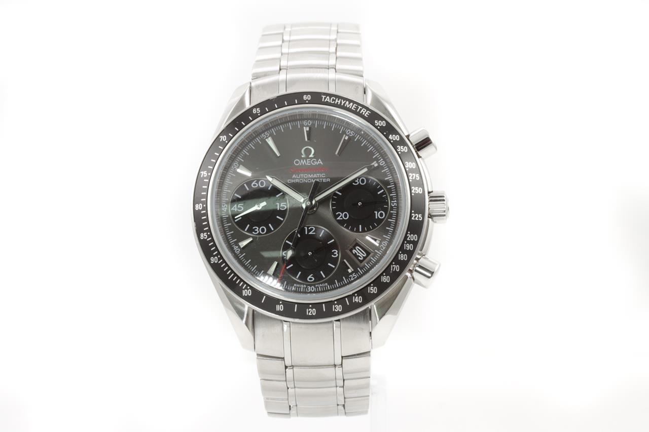 Omega Speedmaster stainless steel mens automatic watch. Dark grey chronograph dial, date, case diameter: 40mm, wrist size: 19cm, Swiss Made. Ref# 323.30.40.40.06.001. With Omega stainless steel bracelet & clasp. With Certificate of Authenticity, International warranty card dated 27/06/2018 and Omega Box. 3 month FSA warranty. (Pre-owned)
