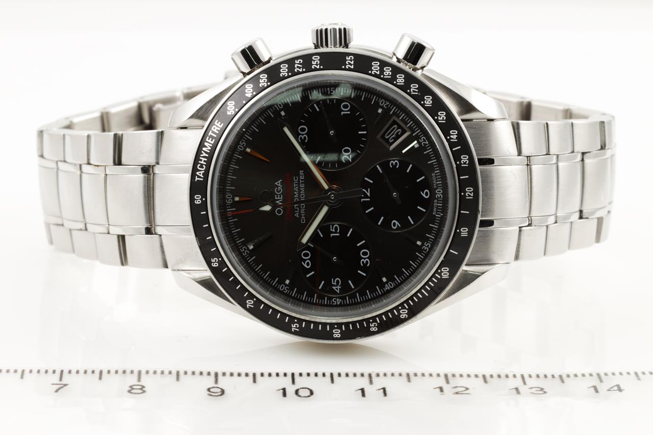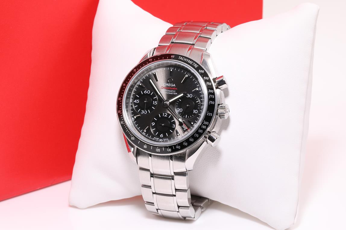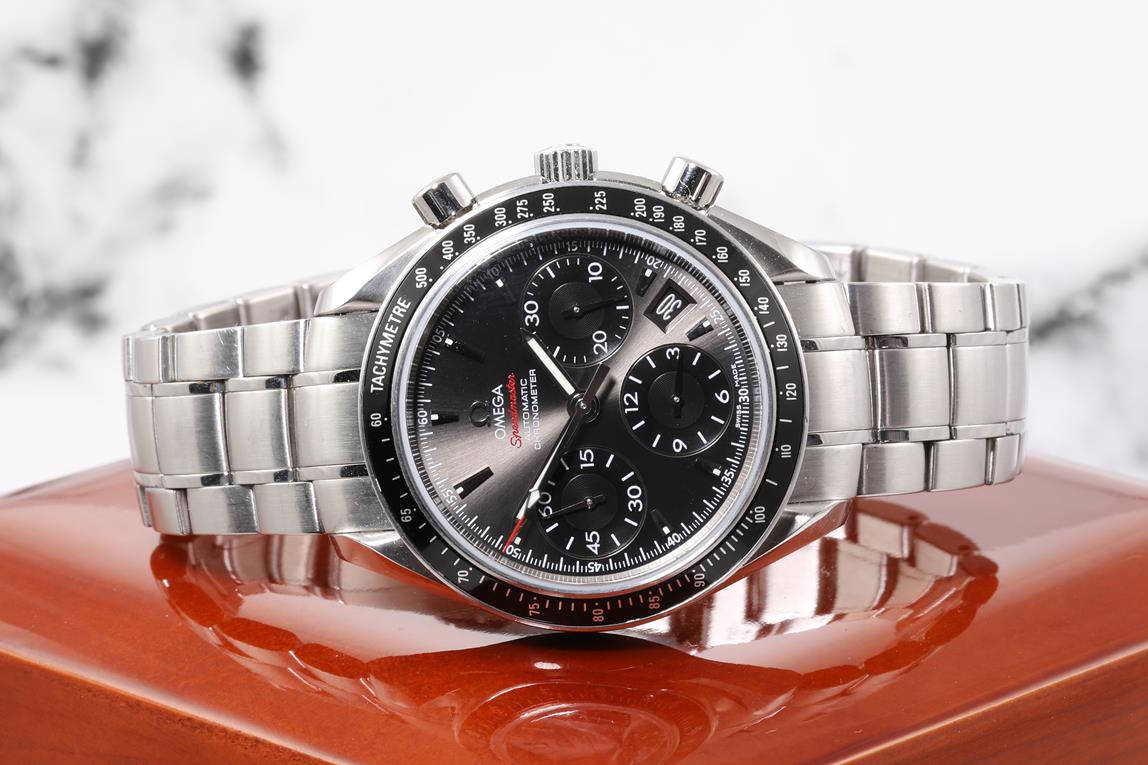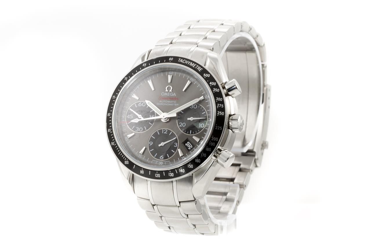 Omega Speedmaster stainless steel mens automatic watch. Dark grey chronograph dial, date, case diameter: 40mm, wrist size: 19cm, Swiss Made. Ref# 323.30.40.40.06.001. With Omega stainless steel bracelet & clasp. With Certificate of Authenticity, International warranty card dated 27/06/2018 and Omega Box. 3 month FSA warranty. (Pre-owned)