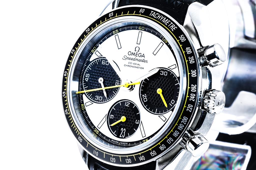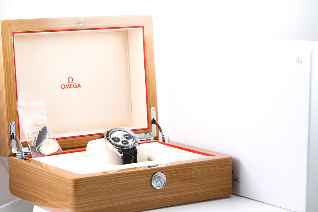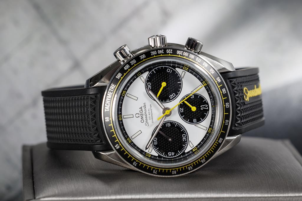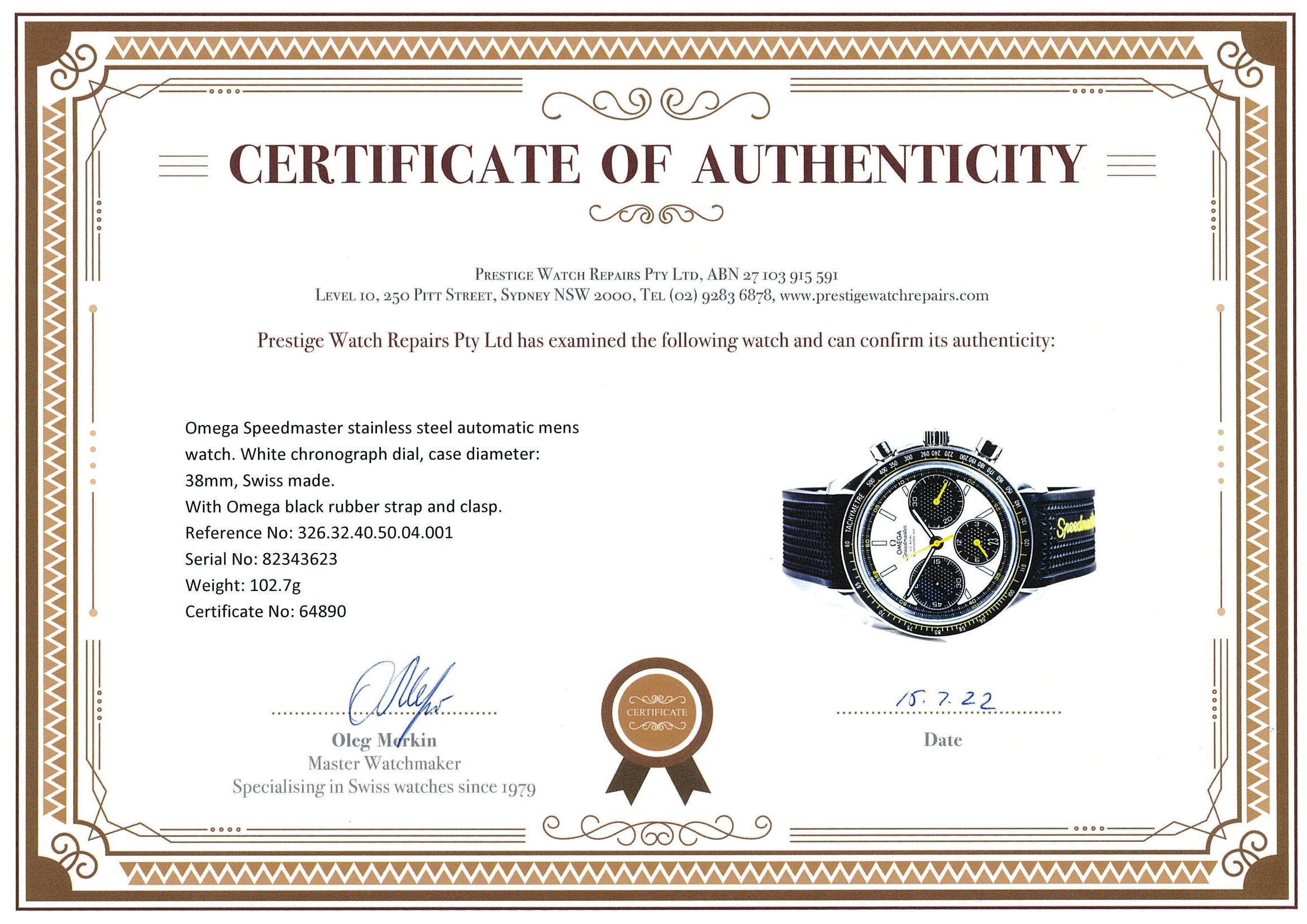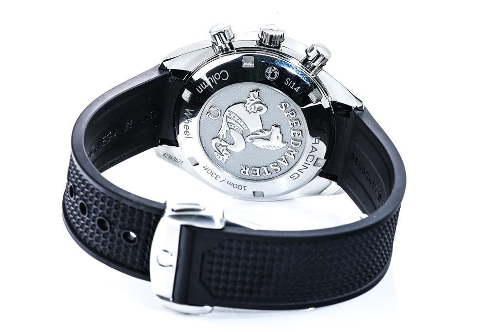 Omega Speedmaster stainless steel automatic mens watch. White chronograph dial, case diameter: 38mm, adjustable max wrist size: 17.5cm, Swiss made. Ref# 326.32.40.50.04.001. Circa: 2000. With Omega black rubber strap and clasp. With Certificate of Authenticity, Omega International warranty card dated 17/08/2020, pictograms, Omega key ring and Omega box. 3 month FSA warranty. (Pre-owned)