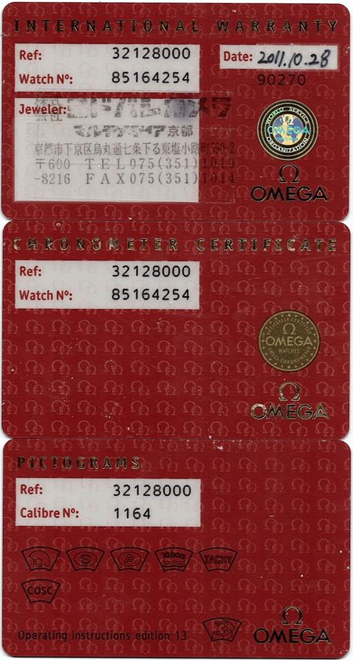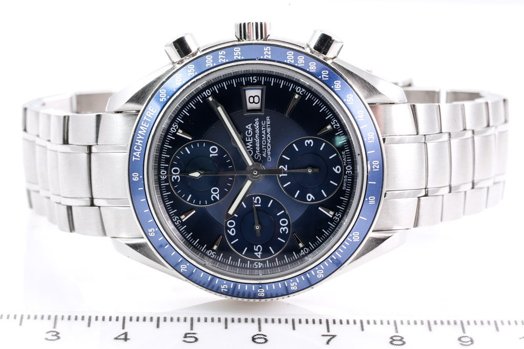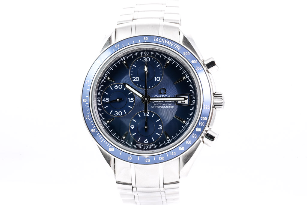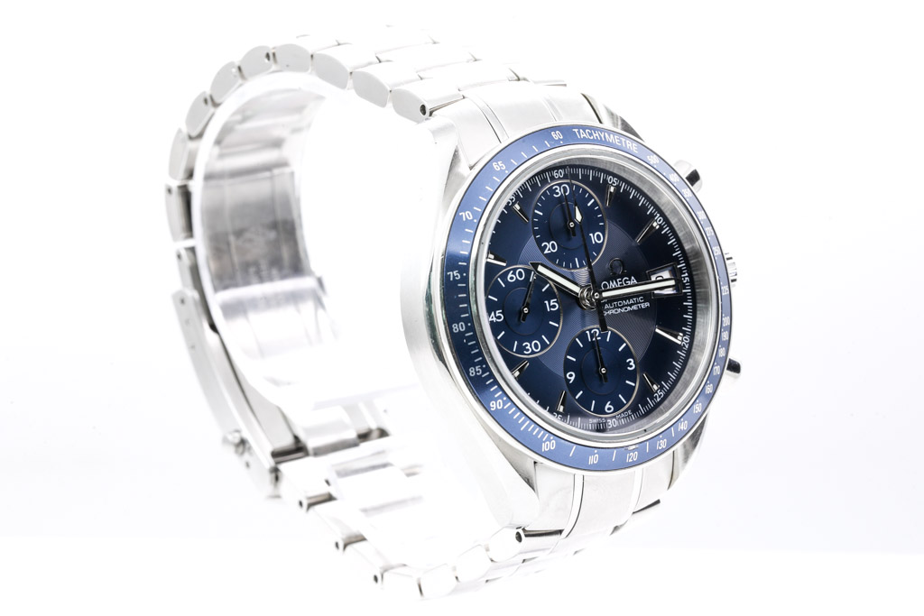 Omega Speedmaster stainless steel automatic mens watch. Blue chronograph dial, date, case diameter: 40mm, wrist size: 18.5cm, Swiss made. Ref# 3212.80. With Omega stainless steel bracelet and clasp. With Certificate of Authenticity, Omega International Warranty Card dated 28/10/2011, Chronometer Certificate Card, Pictograms Card and Omega box. 3 month FSA warranty. (Pre-owned)