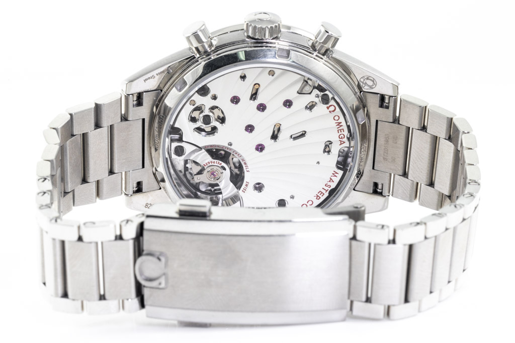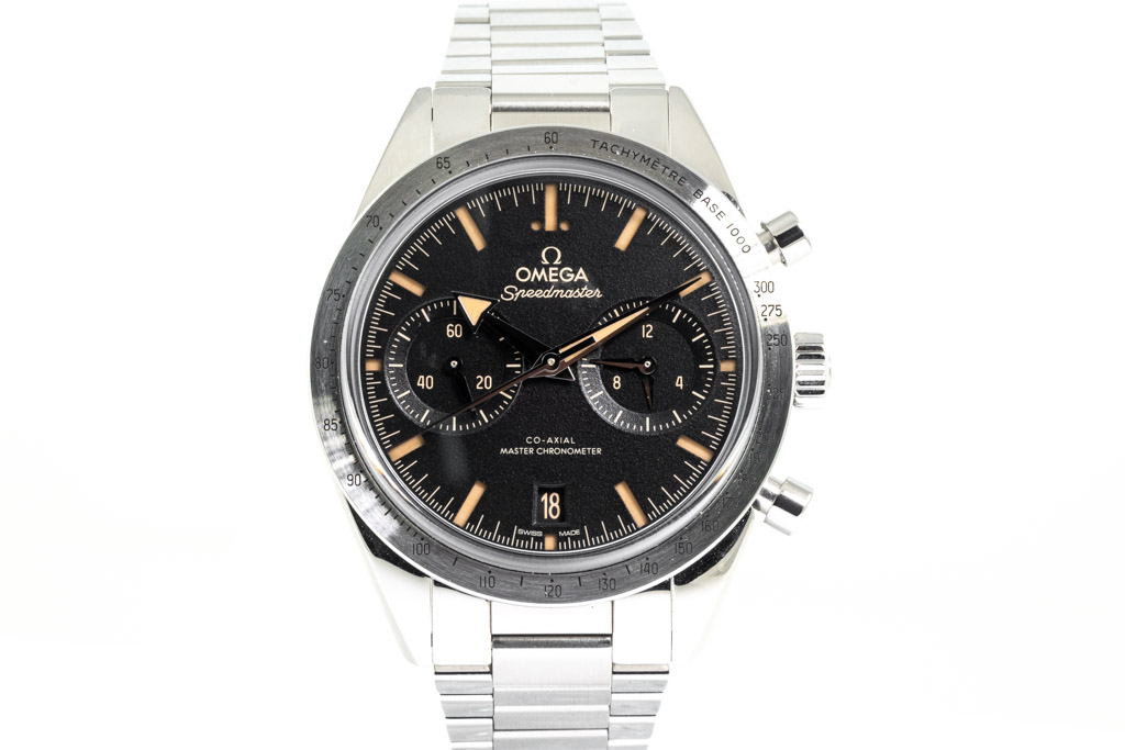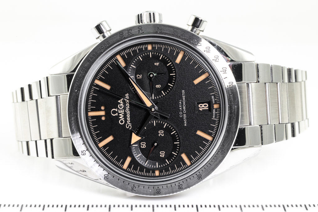 Omega Speedmaster stainless steel manual winding mens watch. Black chronograph dial, date, case diameter: 40.5mm, wrist size: 20cm, Swiss made. Ref# 332.10.41.51.01.001. With Omega stainless steel bracelet and clasp. With Certificate of Authenticity, Omega International Warranty Card dated 30/09/2022, Chronometer Certificate Card, Pictograms Card and Omega box. Balance of 5 year Omega manufacturer warranty applies. (Pre-owned)