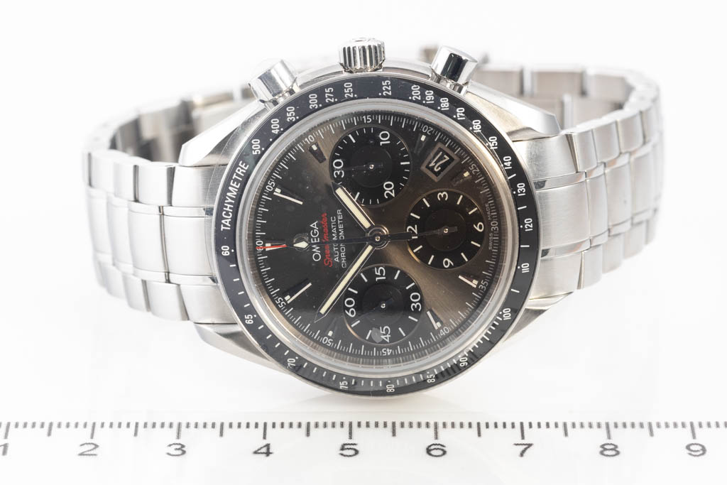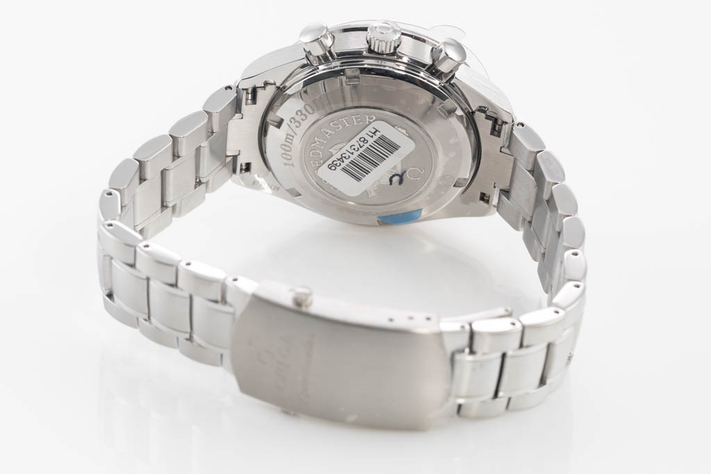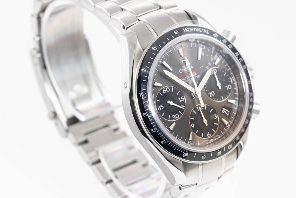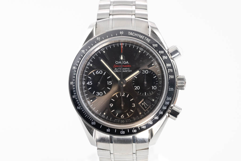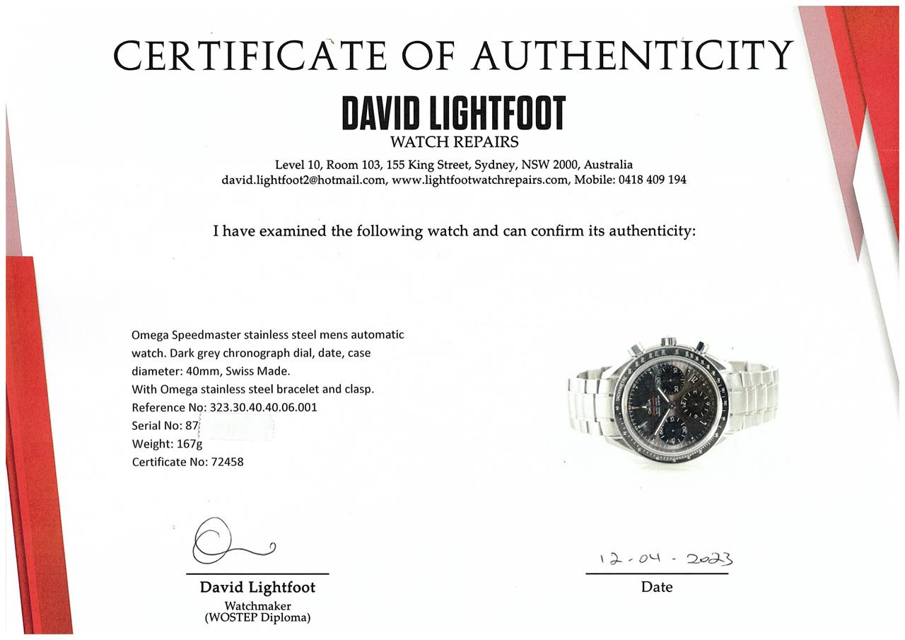 Omega Speedmaster stainless steel mens automatic watch. Dark grey chronograph dial, date, case diameter: 40mm, wrist size: 19cm, Swiss Made. Ref# 323.30.40.40.06.001. With Omega stainless steel bracelet and clasp. With Certificate of Authenticity, Omega International warranty card and Omega Box. 3 month FSA warranty. (Pre-owned)