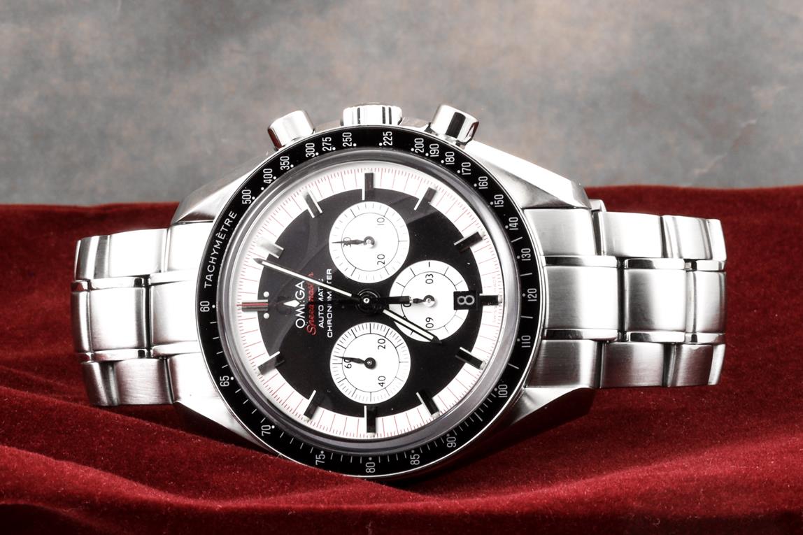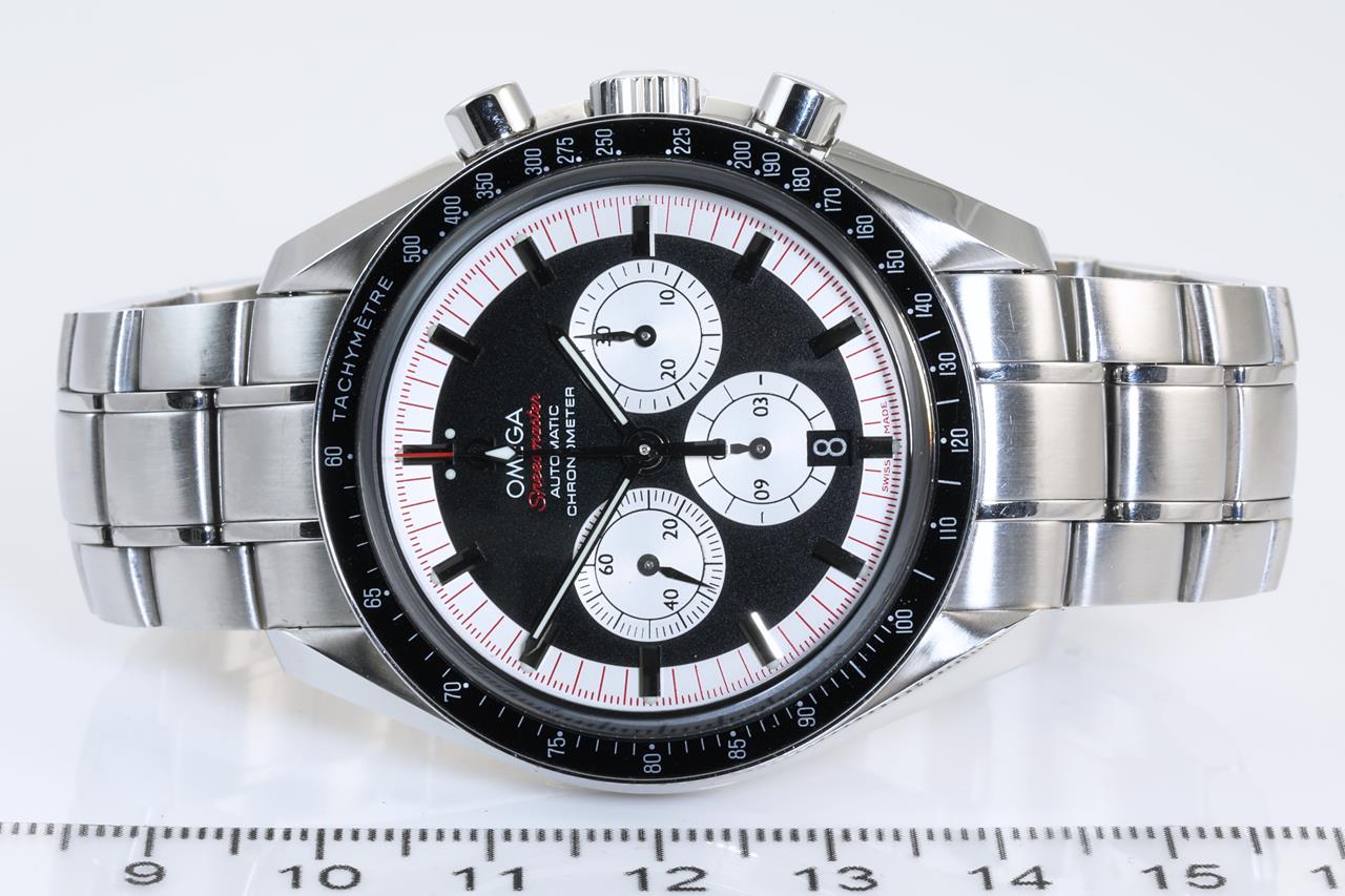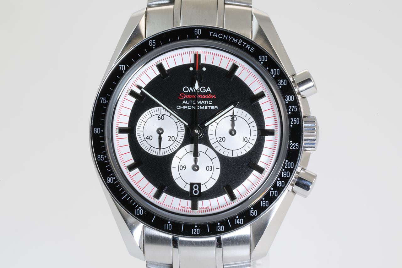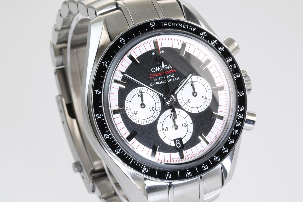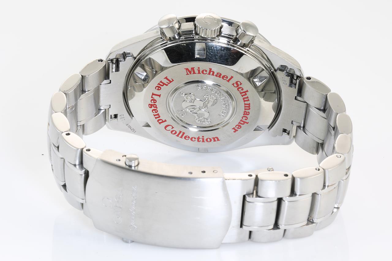 Omega Speedmaster Michael Schumacher The Legend Collection stainless steel automatic mens watch. Black/white chronograph dial, date, case diameter: 42mm, wrist size: 16.5cm, Swiss made. Ref #3507.51. With Omega stainless steel bracelet and clasp. With certificate of authenticity. 3 month FSA warranty. (Pre-owned)