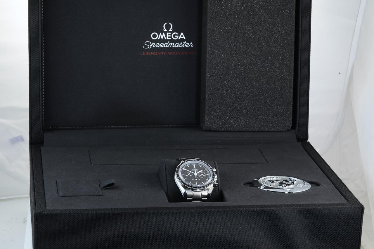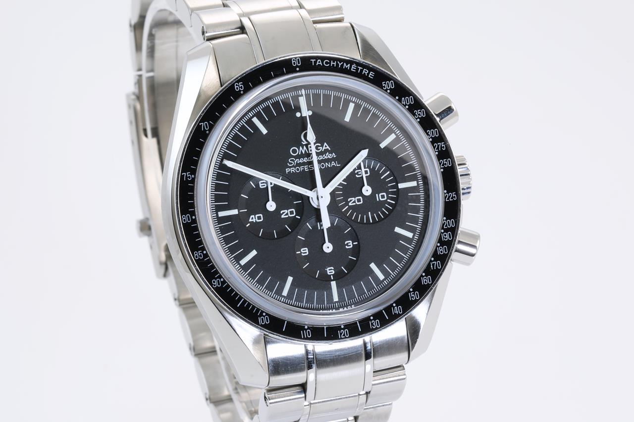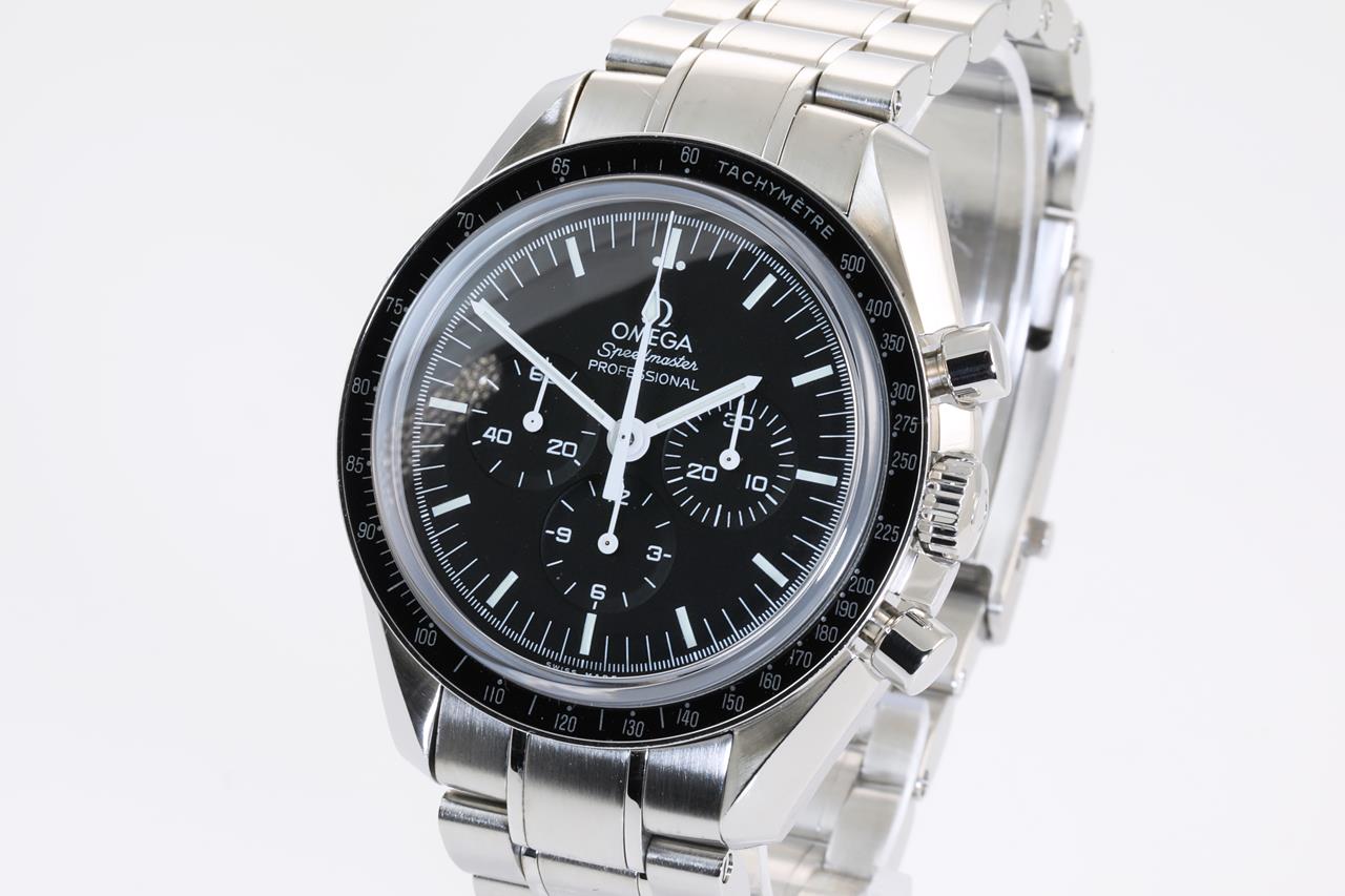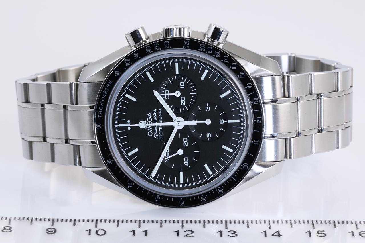 Omega Speedmaster Professional Moonwatch stainless steel manual winding mens watch. Black chronograph dial, case diameter: 42mm, wrist size: 19cm, Swiss made. Ref# 311.30.42.30.01.006. With Omega stainless steel bracelet and clasp. With Certificate of Authenticity. With Omega pictograms, international warranty card dated 18 Feb 2016, 2 spare black nato straps (polyamide and velcro strap), tool and loop inside Omega box. 3 month FSA warranty. (Pre-owned)