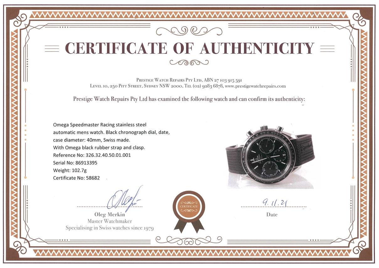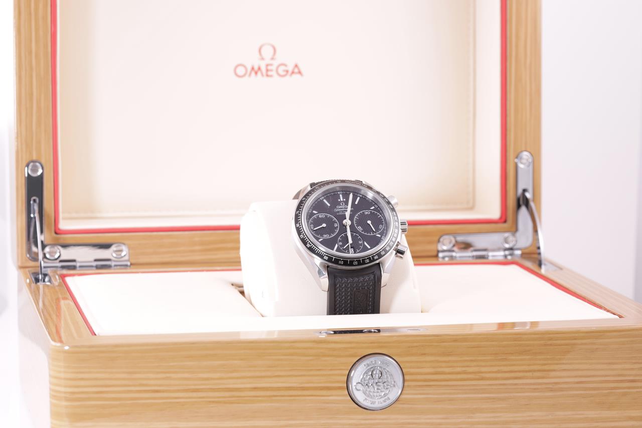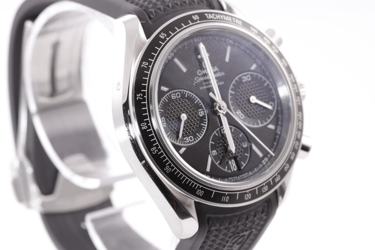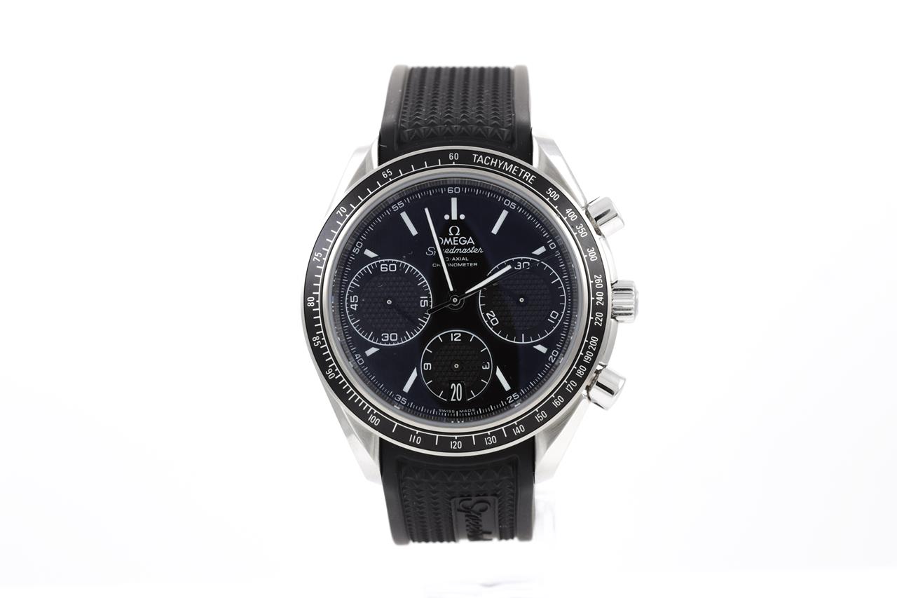 Omega Speedmaster Racing stainless steel automatic mens watch. Black chronograph dial, date, case diameter: 40mm, wrist size: 17.8, Swiss made. Ref# 326.32.40.50.01.001. With Omega black rubber strap and clasp. With Certificate of Authenticity, Omega guarantee card and box. 3 month FSA warranty. (pre-owned)