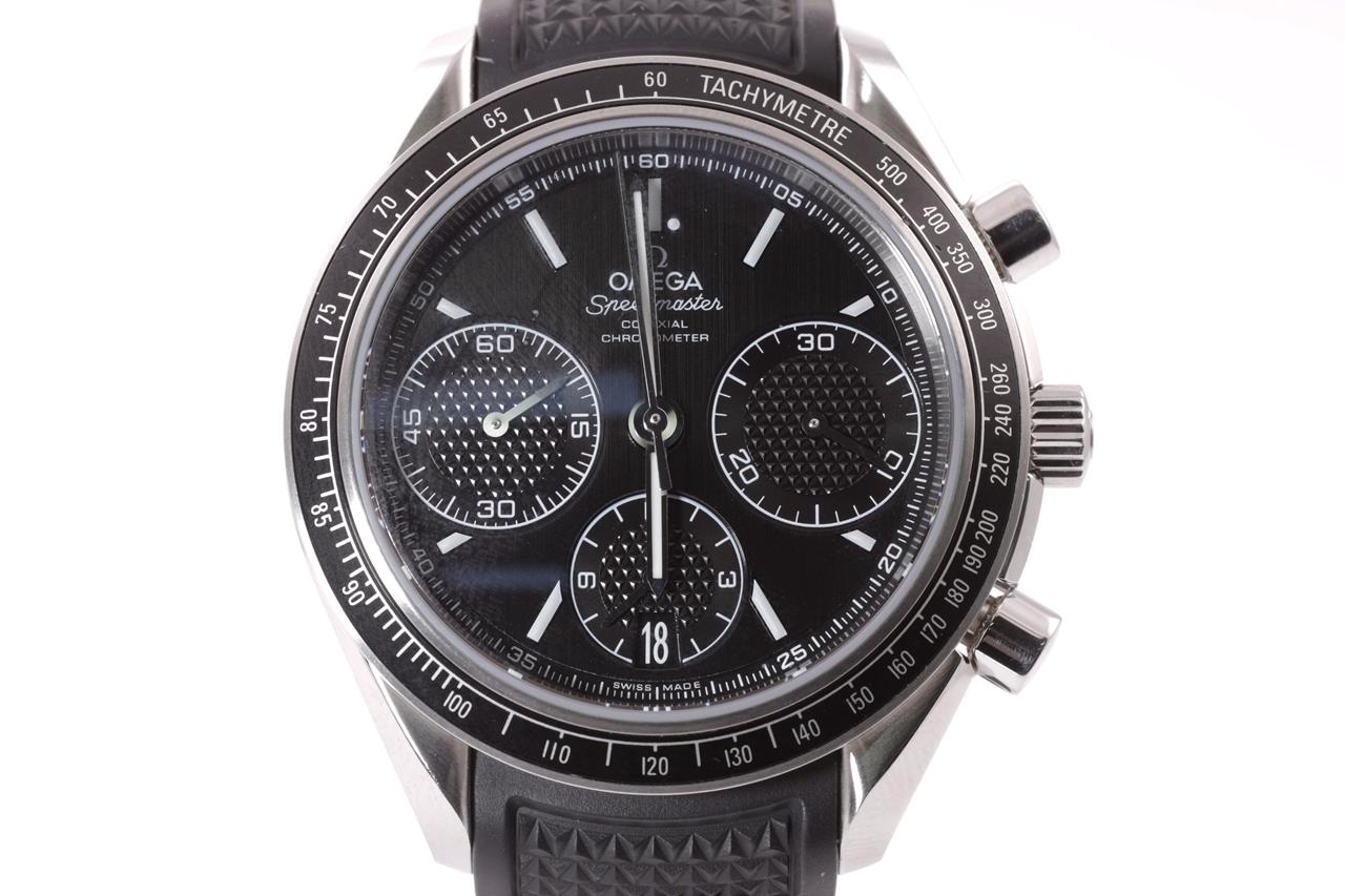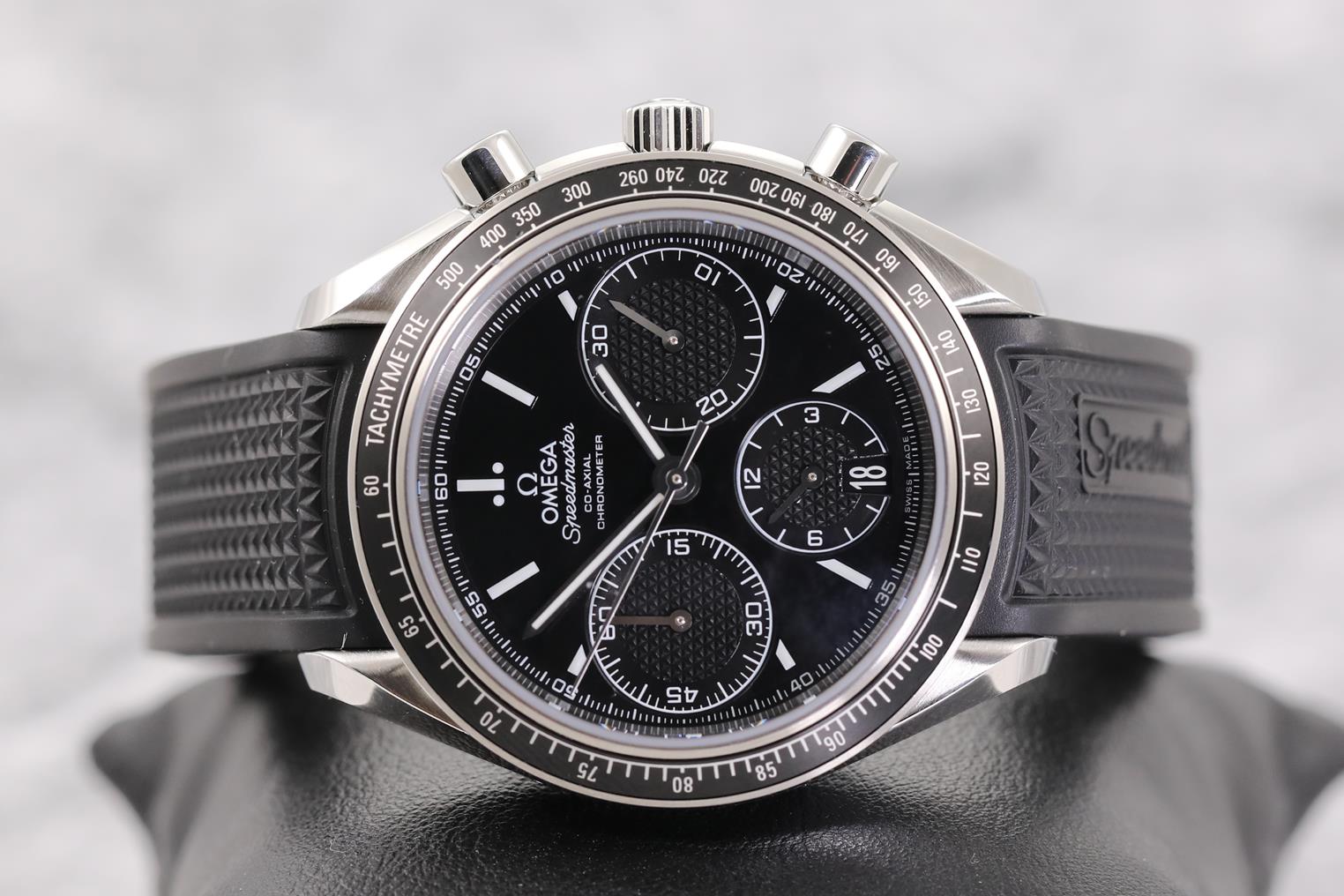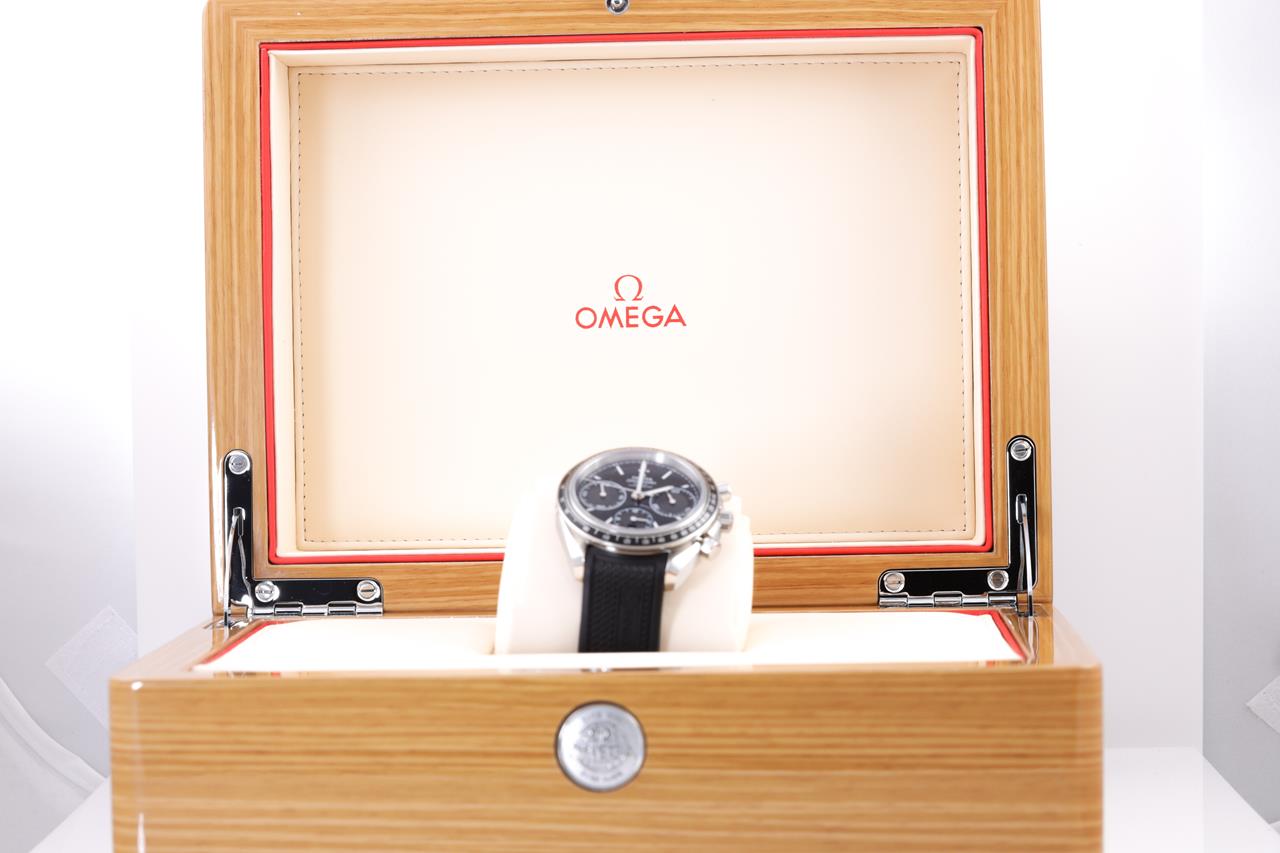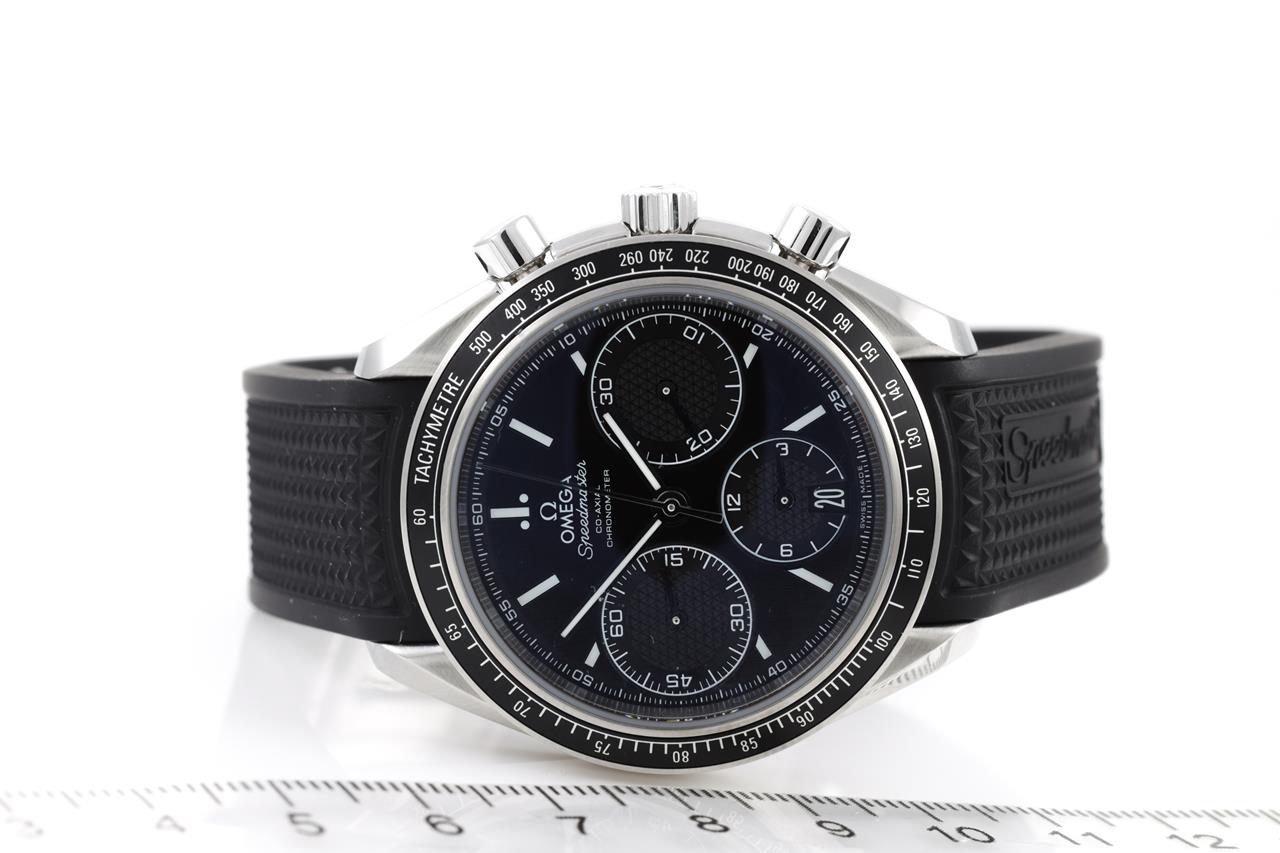 Omega Speedmaster Racing stainless steel automatic mens watch. Black chronograph dial, date, case diameter: 40mm, wrist size: 17.8, Swiss made. Ref# 326.32.40.50.01.001. With Omega black rubber strap and clasp. With Certificate of Authenticity, Omega guarantee card and box. 3 month FSA warranty. (pre-owned)