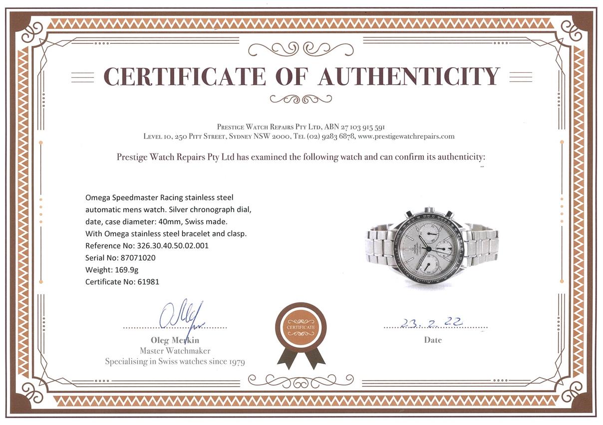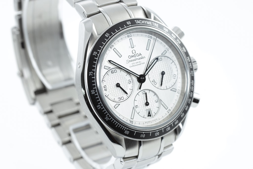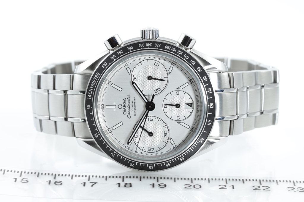 Omega Speedmaster Racing stainless steel automatic mens watch. Silver chronograph dial, date, case diameter: 40mm, wrist size: 20cm, Swiss made. Ref# 326.30.40.50.02.001. With Omega stainless steel bracelet and clasp. With Certificate of Authenticity, Omega International Warranty Card, Pictograms Card and Omega box. and 3 month FSA warranty. (Pre-owned)