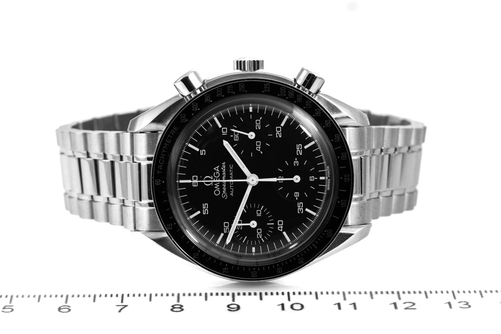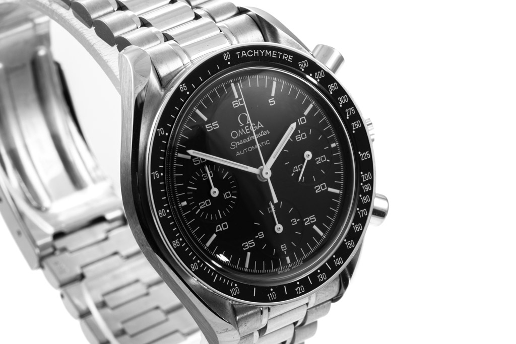 Omega Speedmaster Reduce stainless steel automatic mens watch. Black chronograph dial, case diameter, 39mm, wrist size: 18.5cm, Swiss made. Ref# 3510.50. With Omega stainless steel bracelet and clasp. With Certificate of Authenticity, Omega International Warranty card dated 25/09/2005 and Omega Pictograms card. 3 month FSA warranty (Pre-owned)