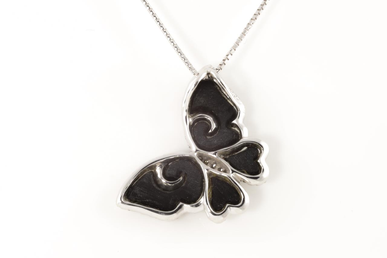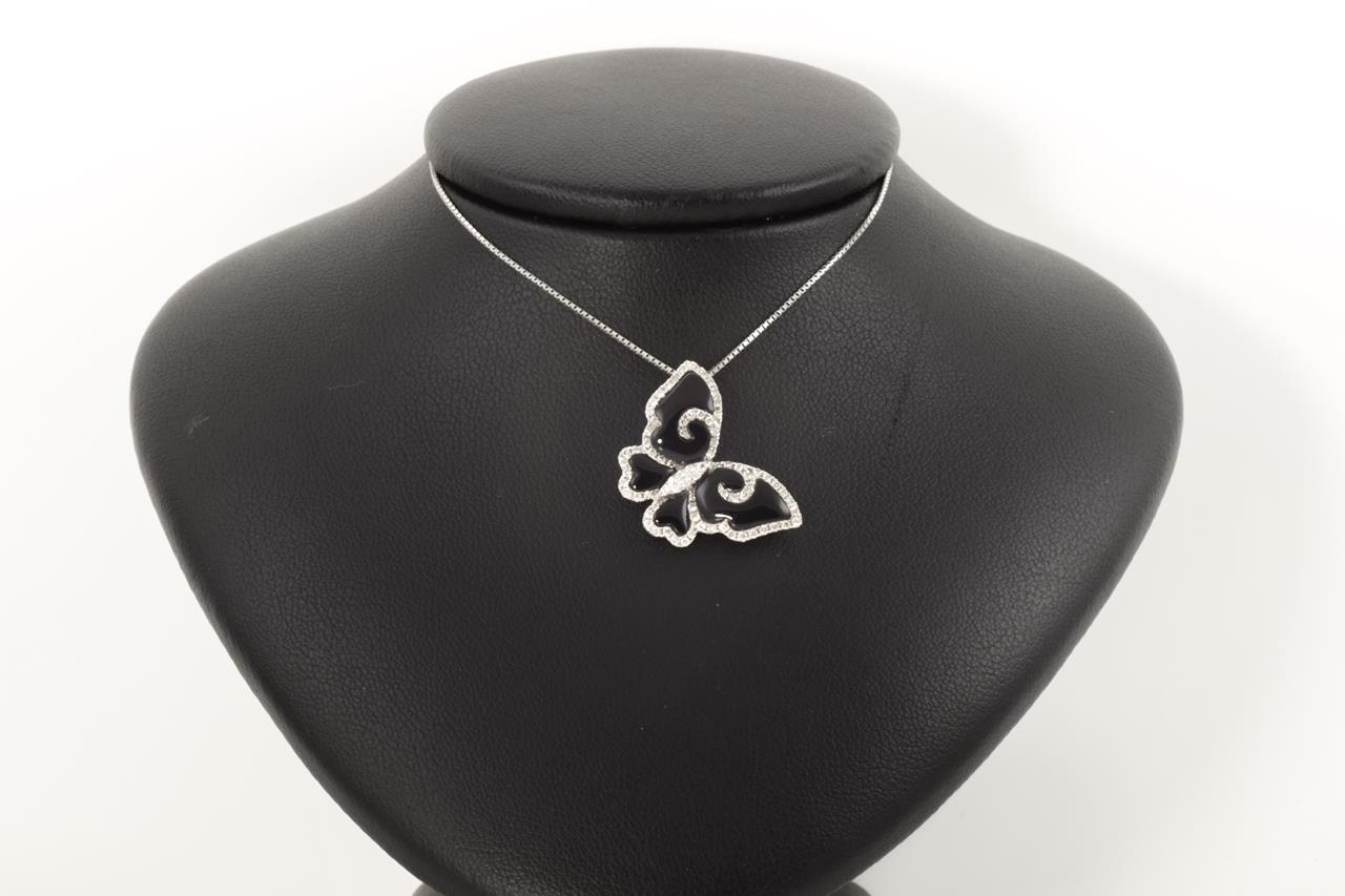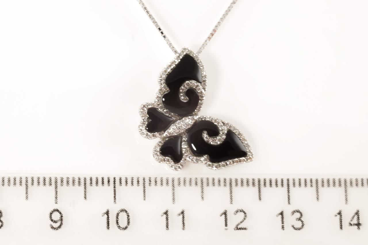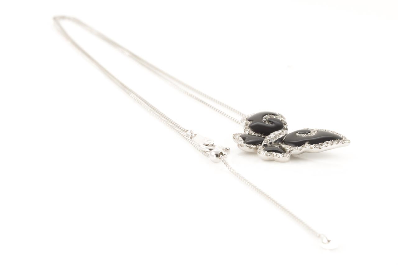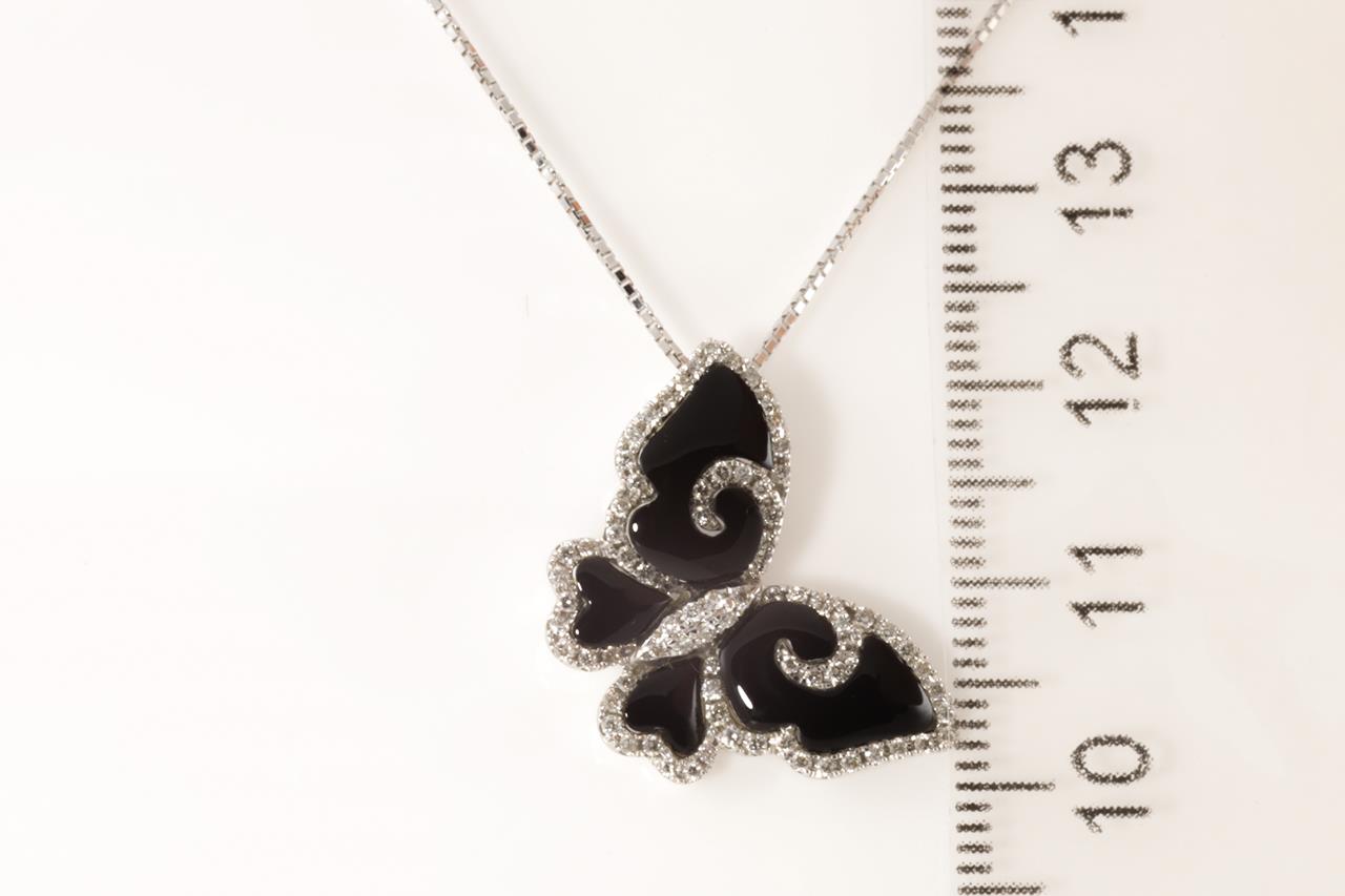Onyx and Diamond butterfly design pendant with Onyx totalling 1.90cts and Diamonds totalling 0.32cts (Estimated grading: H SI). 18ct white gold with 44cm adjustable chain. Weight: 4.1g (Pre-owned)