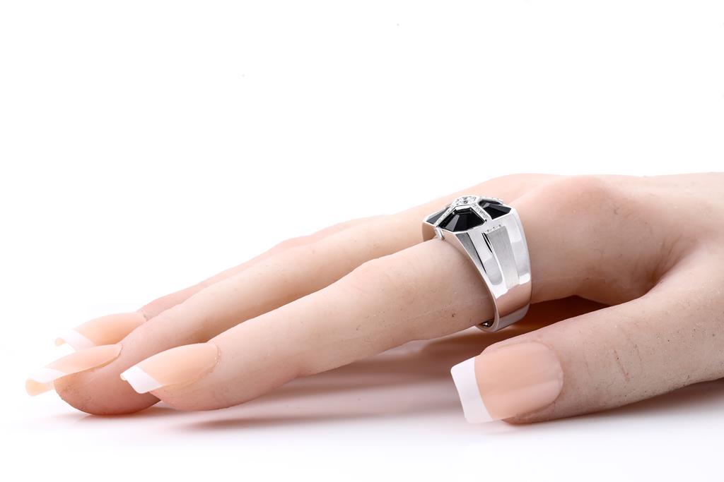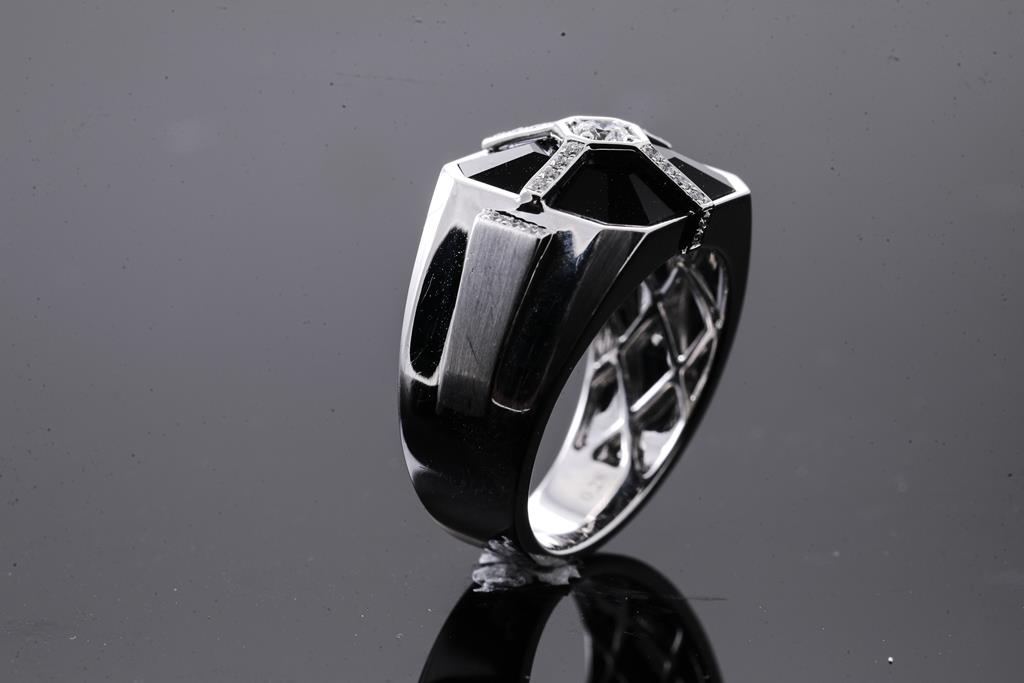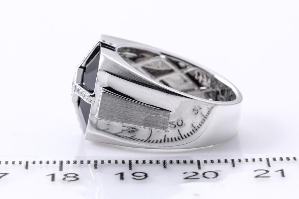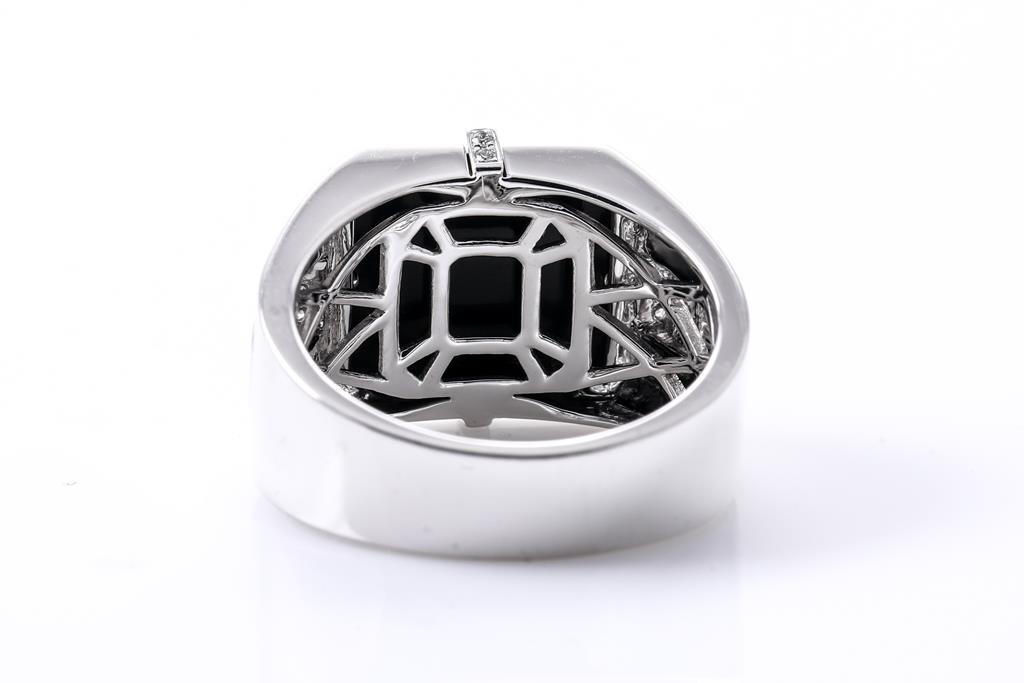 Onyx and Diamond mens ring with fancy cut Onyx and round Diamonds totalling 0.28cts. Platinum. Ring size R - ring resizing is not recommended. Weight: 16.6g. (Pre-owned)