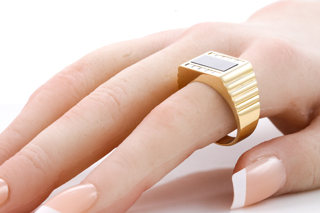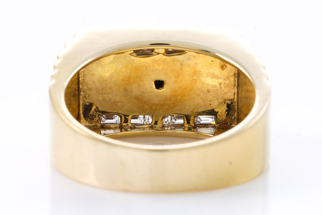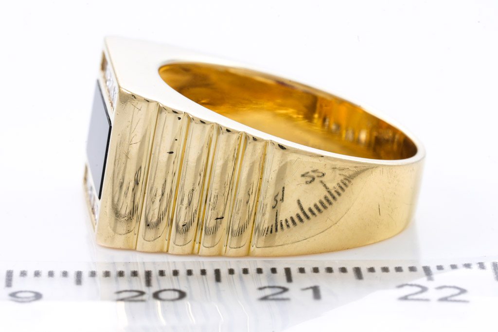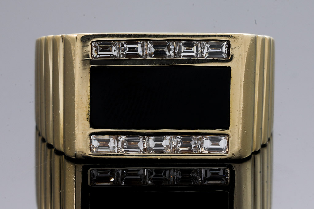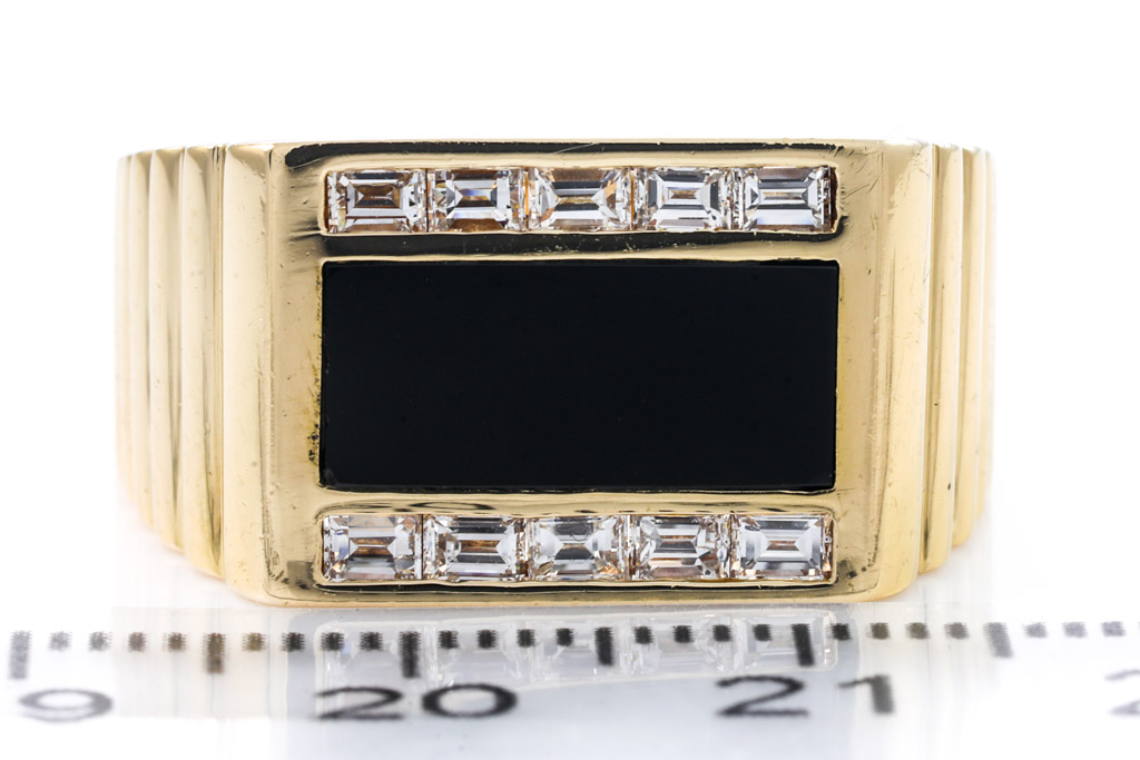 Onyx and Diamond mens ring with Onyx and baguette cut Diamonds totalling 0.70cts (Estimated grading: H SI). 18ct yellow gold. Ring size: U - ring resizing is not recommended. Weight: 13g. (Pre-owned)