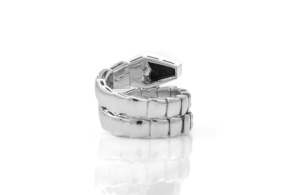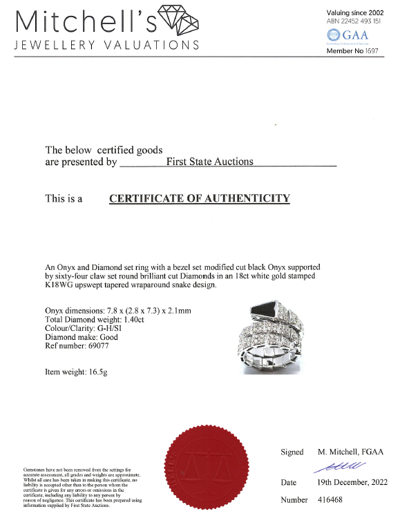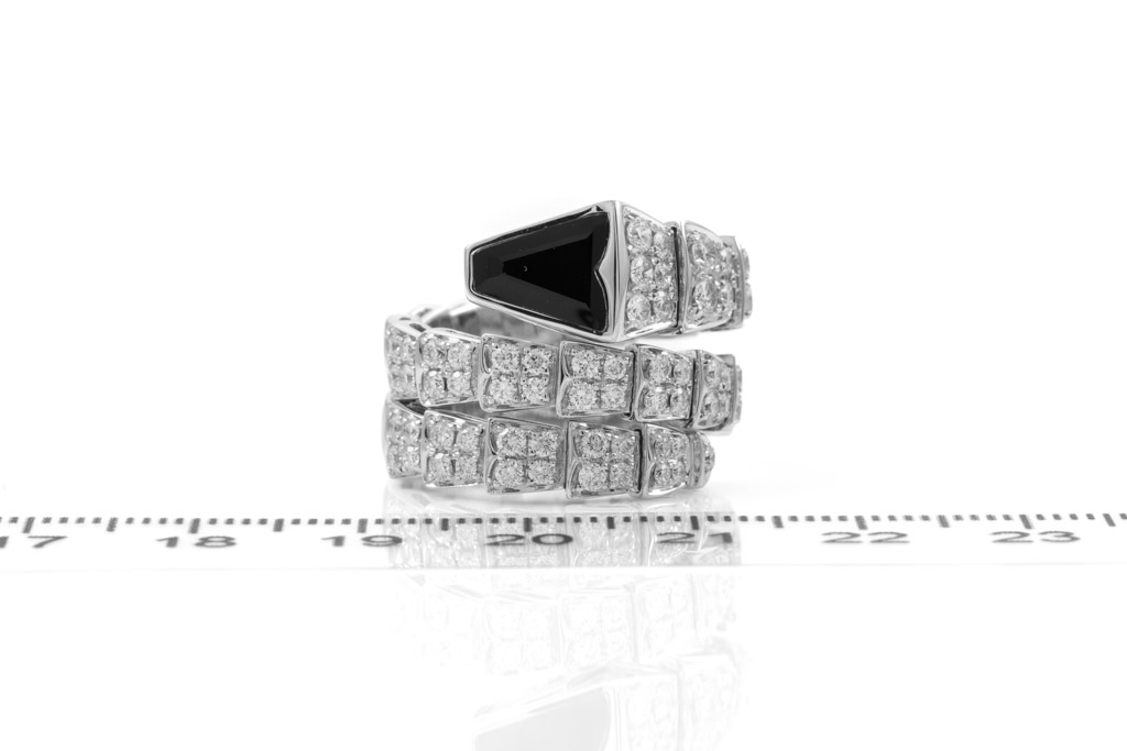 Onyx and Diamond snake design wrap-around ring with fancy cut Onyx and round Diamonds totalling 1.40cts (Estimated grading: G-H SI). 18ct white gold. Flexible ring size N - ring resizing is not recommended. Weight: 16.5g. With certificate #416468. (Pre-owned)