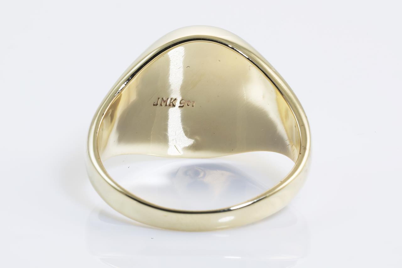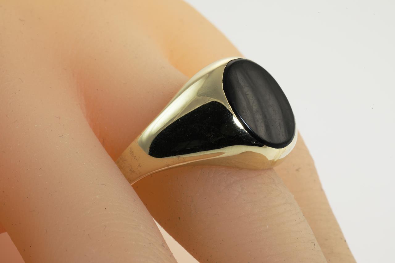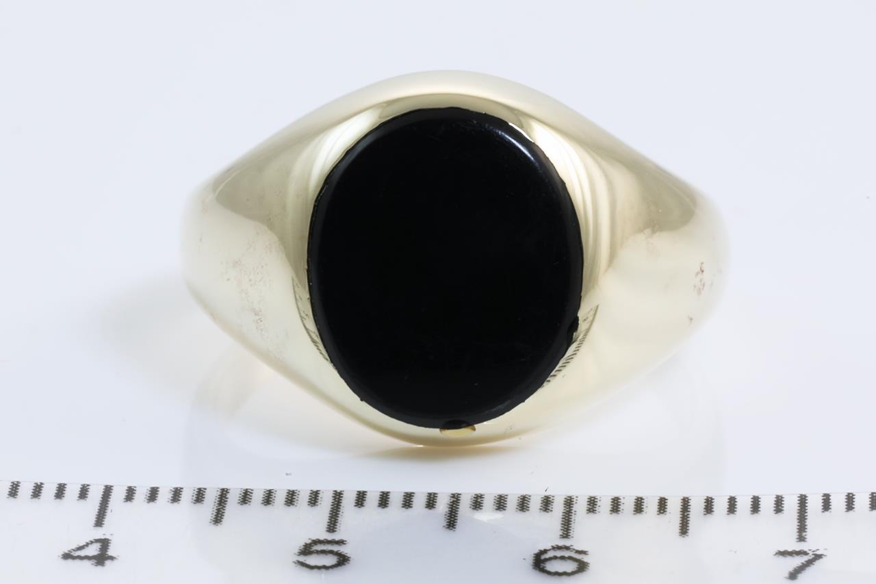 Mens ring with an oval Onyx of 14mm x 12mm. 9ct yellow gold. Ring size Y. Weight: 7.2g. (Pre-owned)