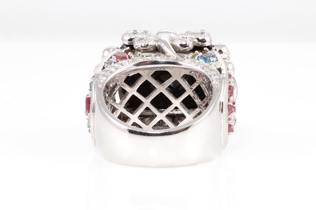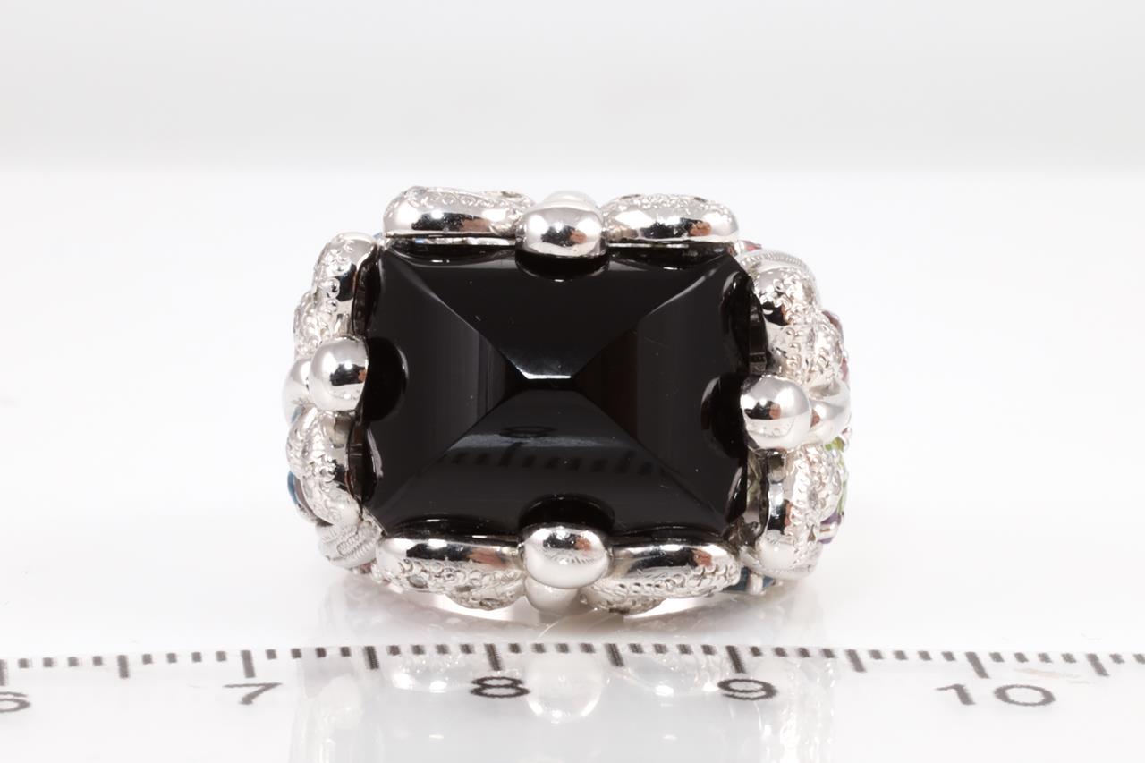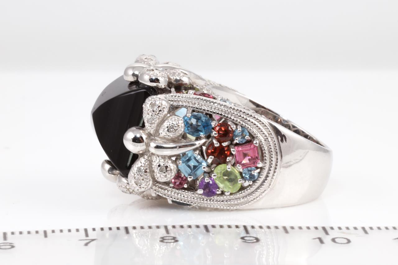 Onyx, mixed gemstone and Diamond ring with Onyx of 12.80ct, Diamonds totalling 0.50cts (Estimated grading: H P2-3) & Garnet, Topaz, Peridot (one chipped) & Tourmaline. 18ct white gold. Ring size L - ring resizing is not recommended. Weight: 21.0g (Pre-owned)