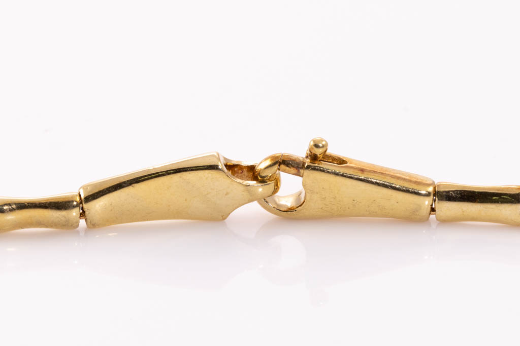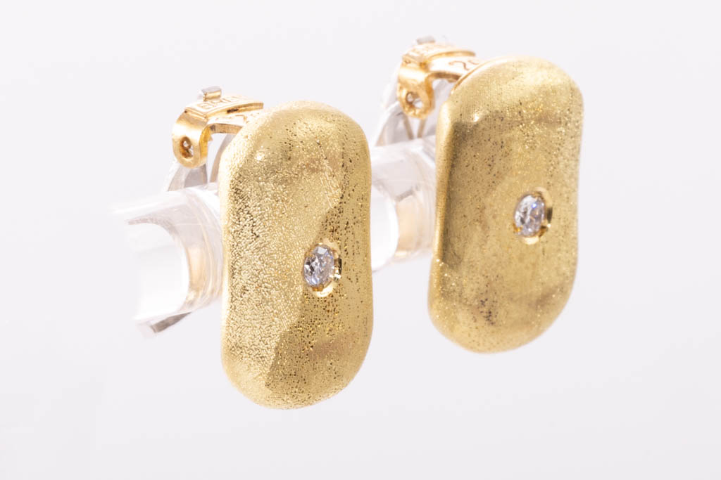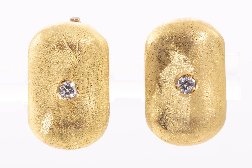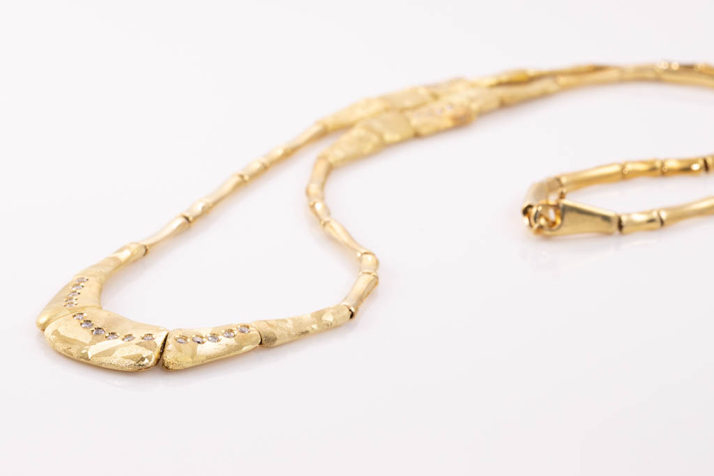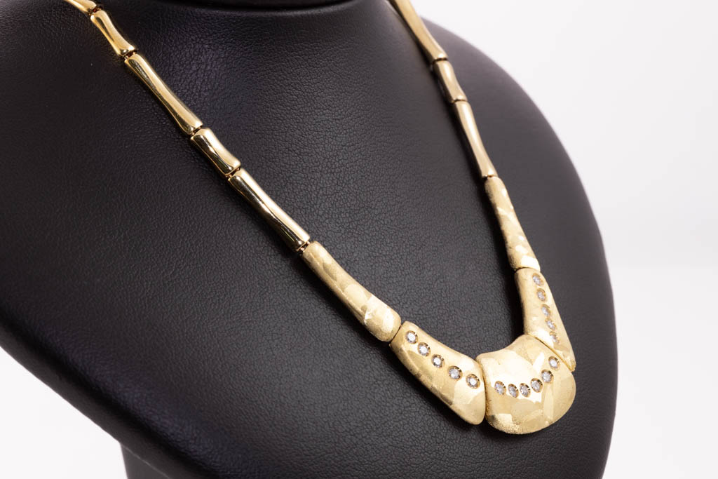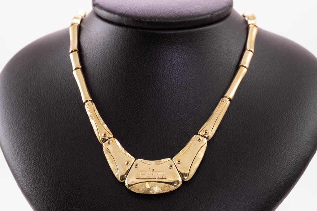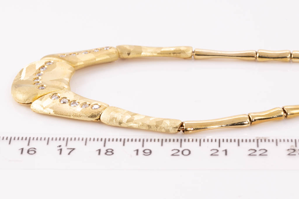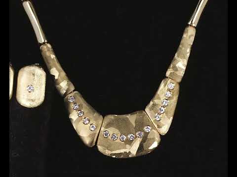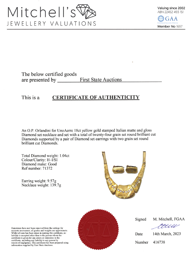 O.P. Orlanandini for UnoAerre 18ct gold Necklace and Earring set. Italian solid 18ct yellow gold necklace with matte and gloss finish, set with 24 Diamonds totalling 0.96cts (Estimated grading: H SI). Weight: 139.7g. Together with matching clip-on earrings (no posts), 18ct yellow gold gloss and matte finish, set with 2 Diamonds totalling 0.06cts (Estimated grading: H SI). Weight: 9.6g. With Certificate #416738. (Pre-owned)