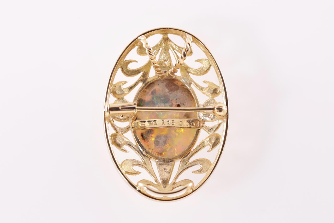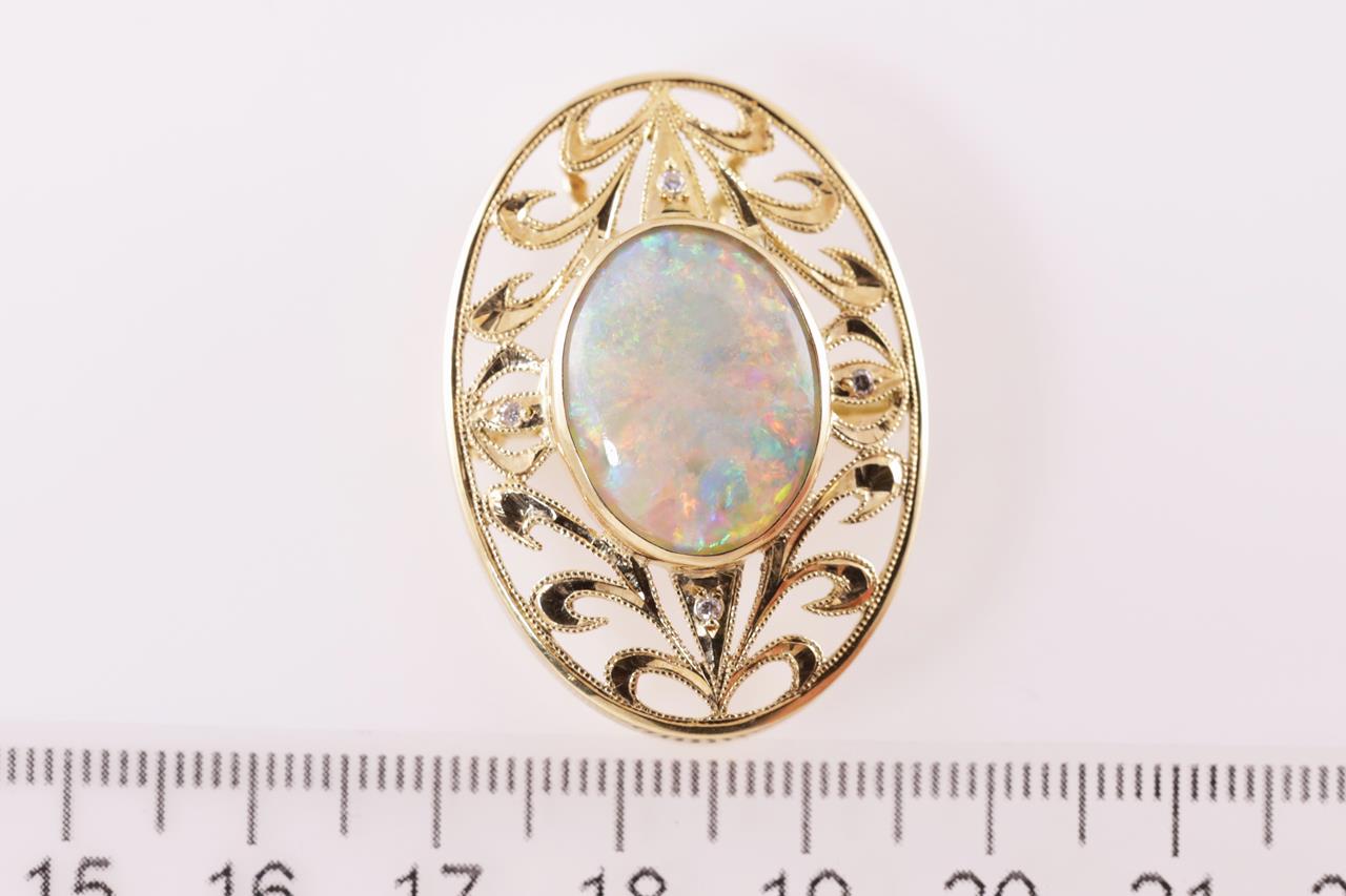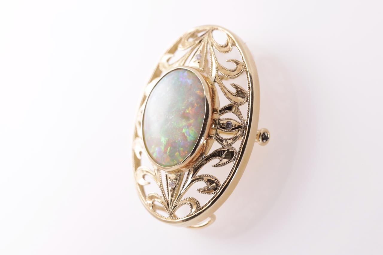 Opal and Diamond brooch/pendant with oval cabochon cut white Opal of 7.96ct and Diamonds totalling 0.04cts. 18ct yellow gold. Weight: 10.8g. (Pre-owned)