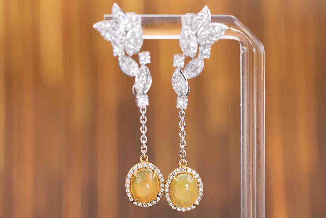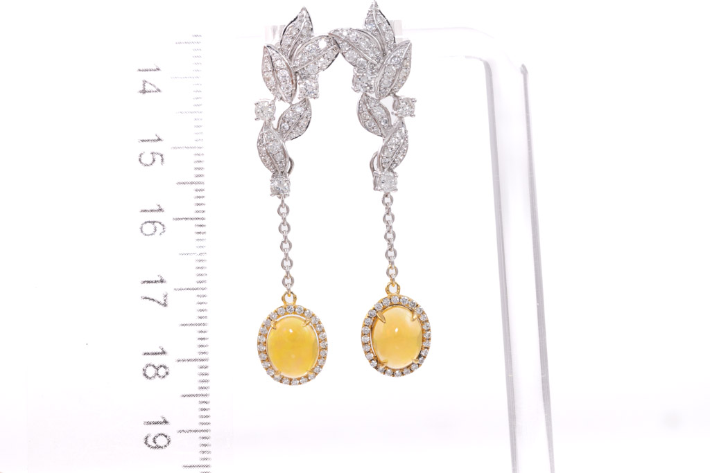 Opal and Diamond dangle earrings with oval cabochon cut solid yellow Crystal Opal totalling 2.00cts and round Diamonds totalling approximately 0.70cts (H-I SI-P1). 18ct white and yellow gold. Weight 7.3g. (Pre-owned)