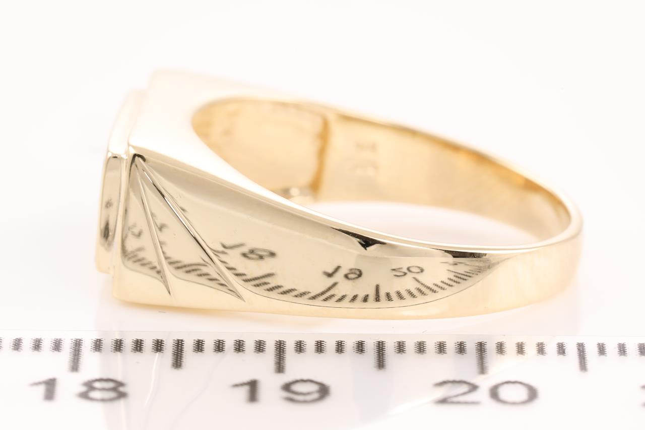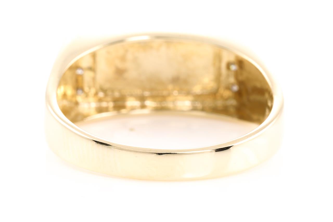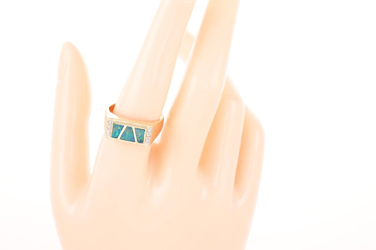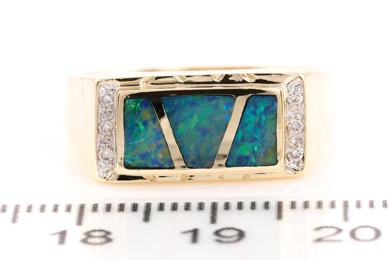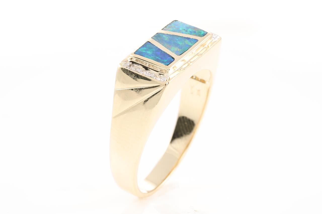 Opal and Diamond mens ring with three fancy cut Opals and six round cut Diamonds totalling approximately 0.06ct. 14ct yellow gold. Ring size S 1/2. Weight 6.4g. (Pre-owned)