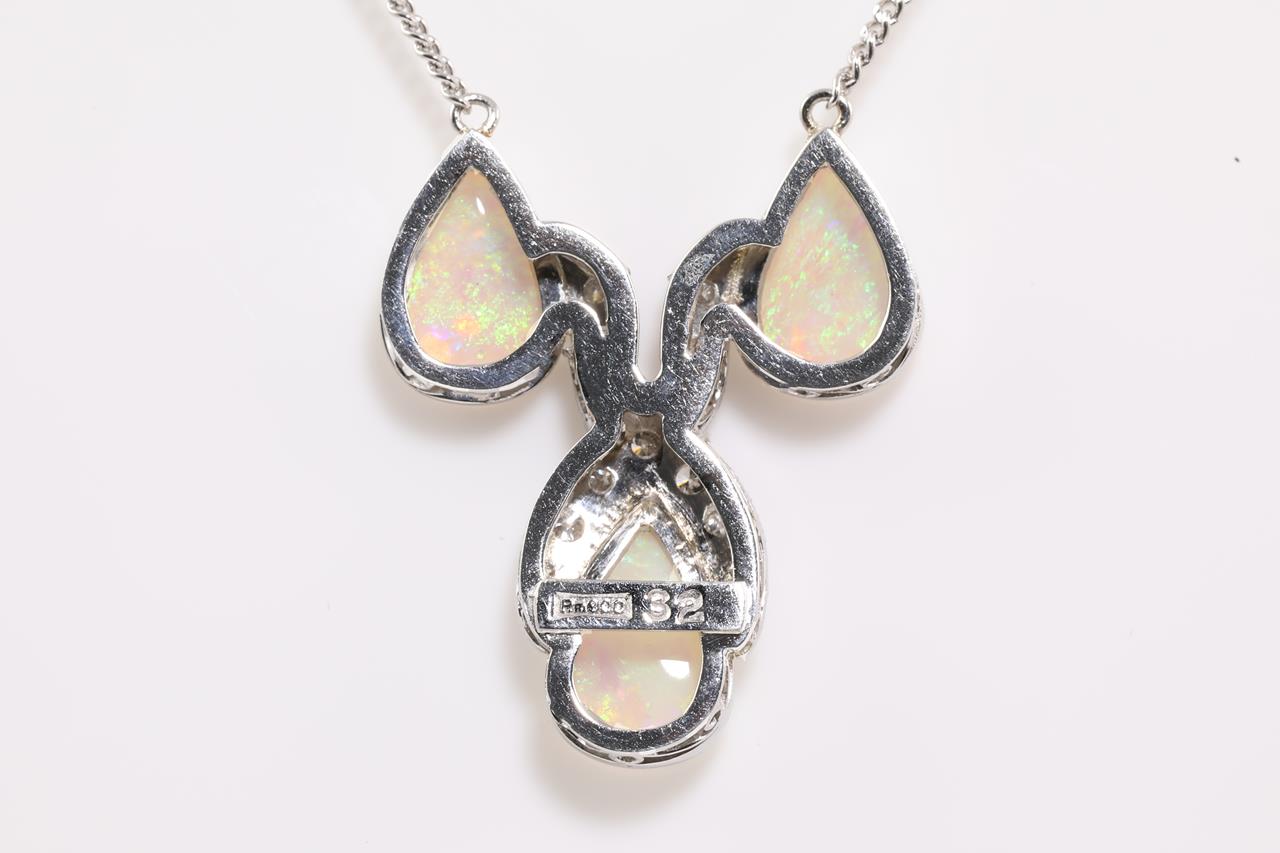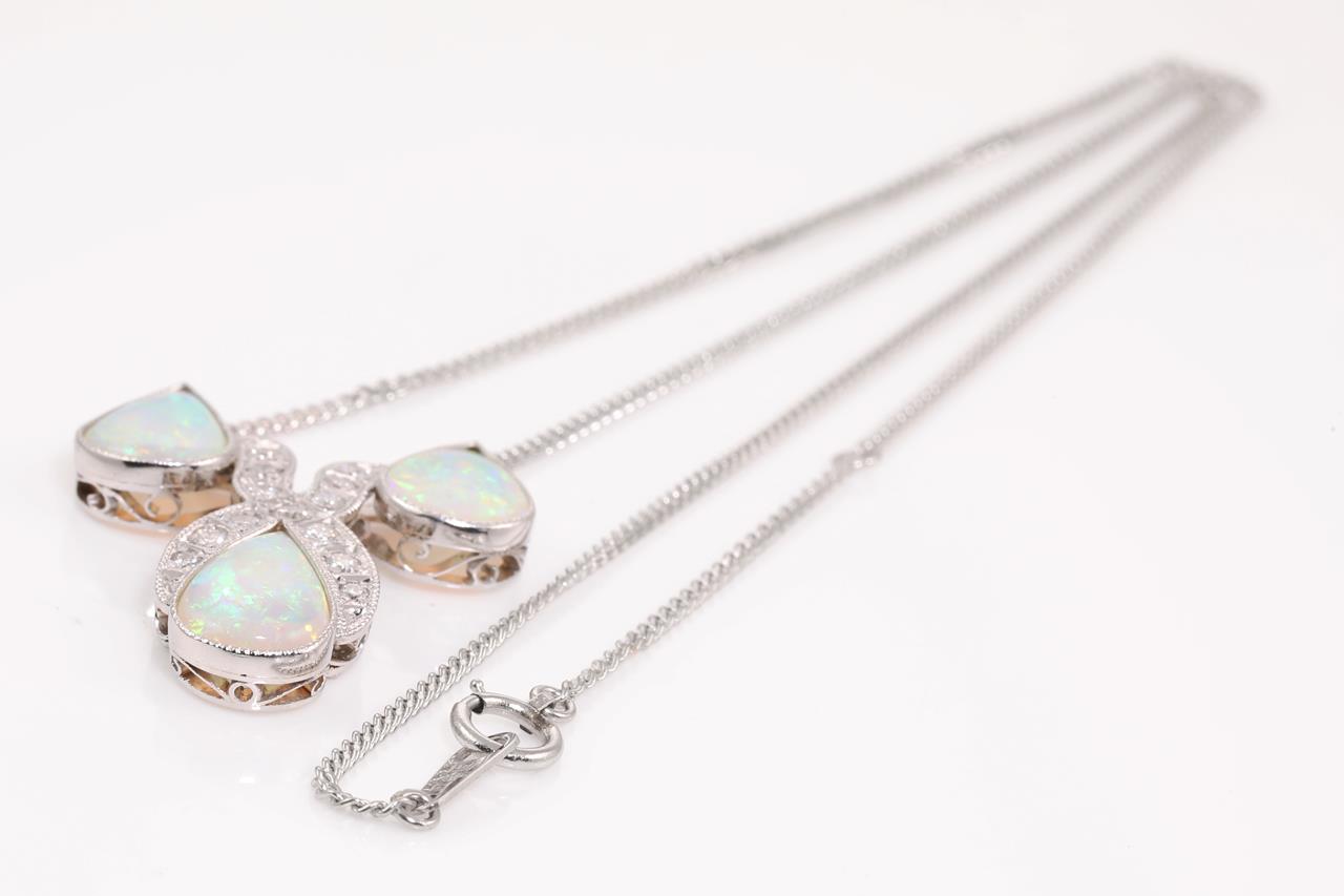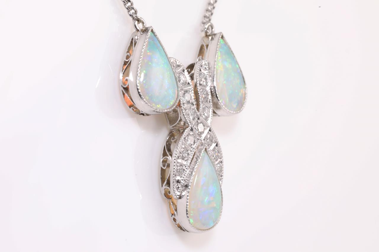 Opal and Diamond necklace with 3 pear shape Light Opal and round Diamonds totalling 0.32cts (Estimated grading: H VS-SI). Platinum with attached chain. Length: 42cm. Weight: 9.2g. (Pre-owned)