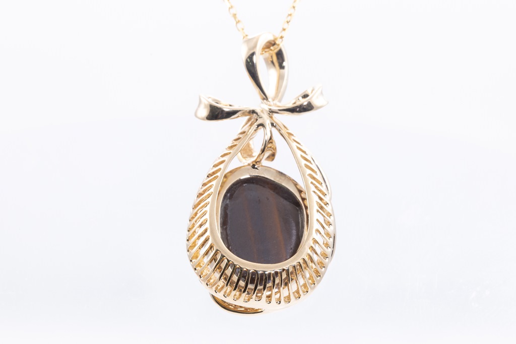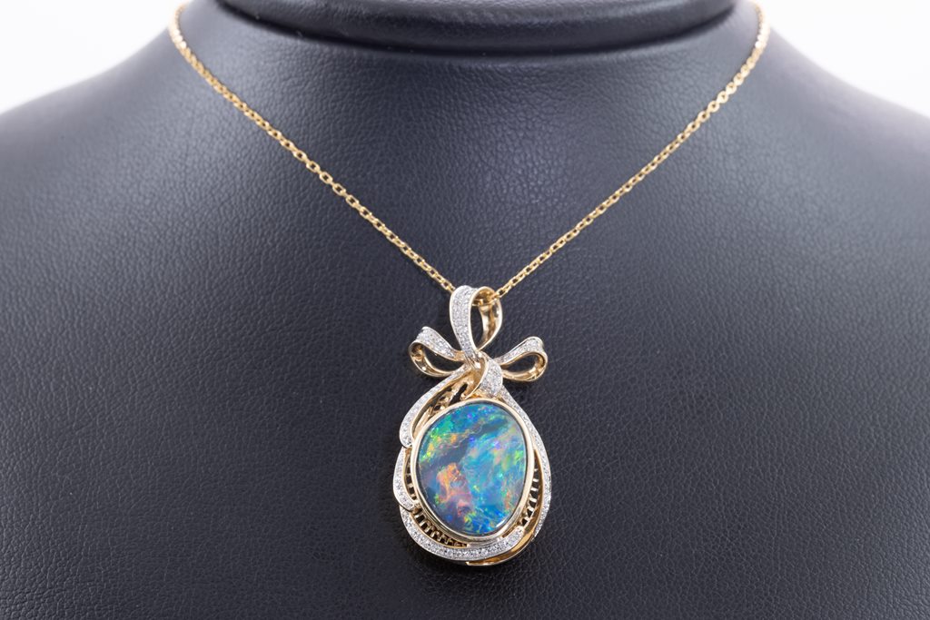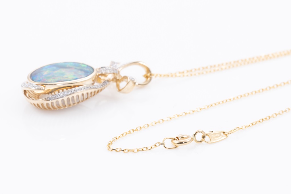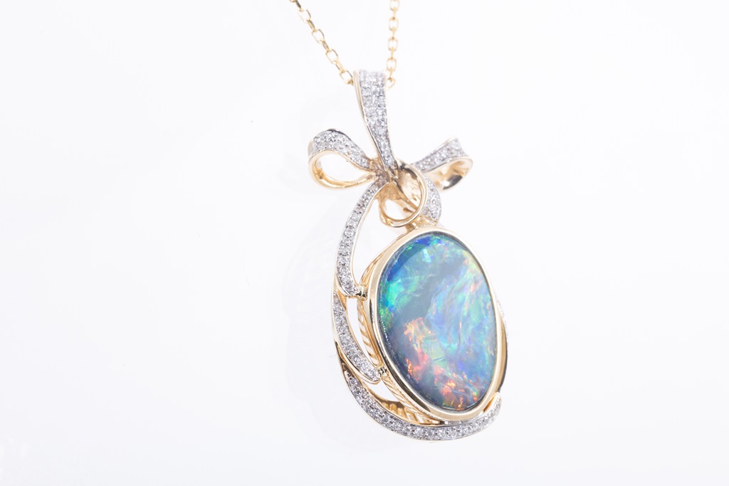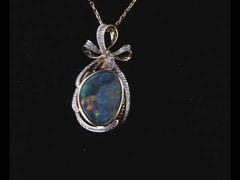 1840/ 124: Opal and Diamond Pendant with boulder Opal of 4.57ct and round Diamonds totalling approximately 0.18ct. 14ct yellow gold pendant with 18ct yellow gold 45cm chain. Weight 7.2g. (As New)