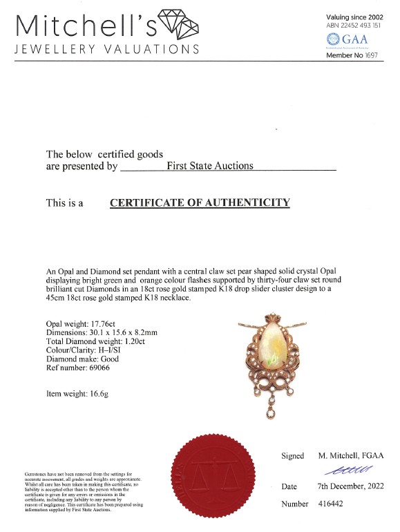 Opal and Diamond pendant with pear shape solid Crystal Opal of 17.76ct and round Diamonds totalling 1.20cts (Estimated gradign: H-I SI). 18ct yellow gold with adjustable 45cm chain. Weight: 16.6g. With Certificate #416442. (Pre-owned)