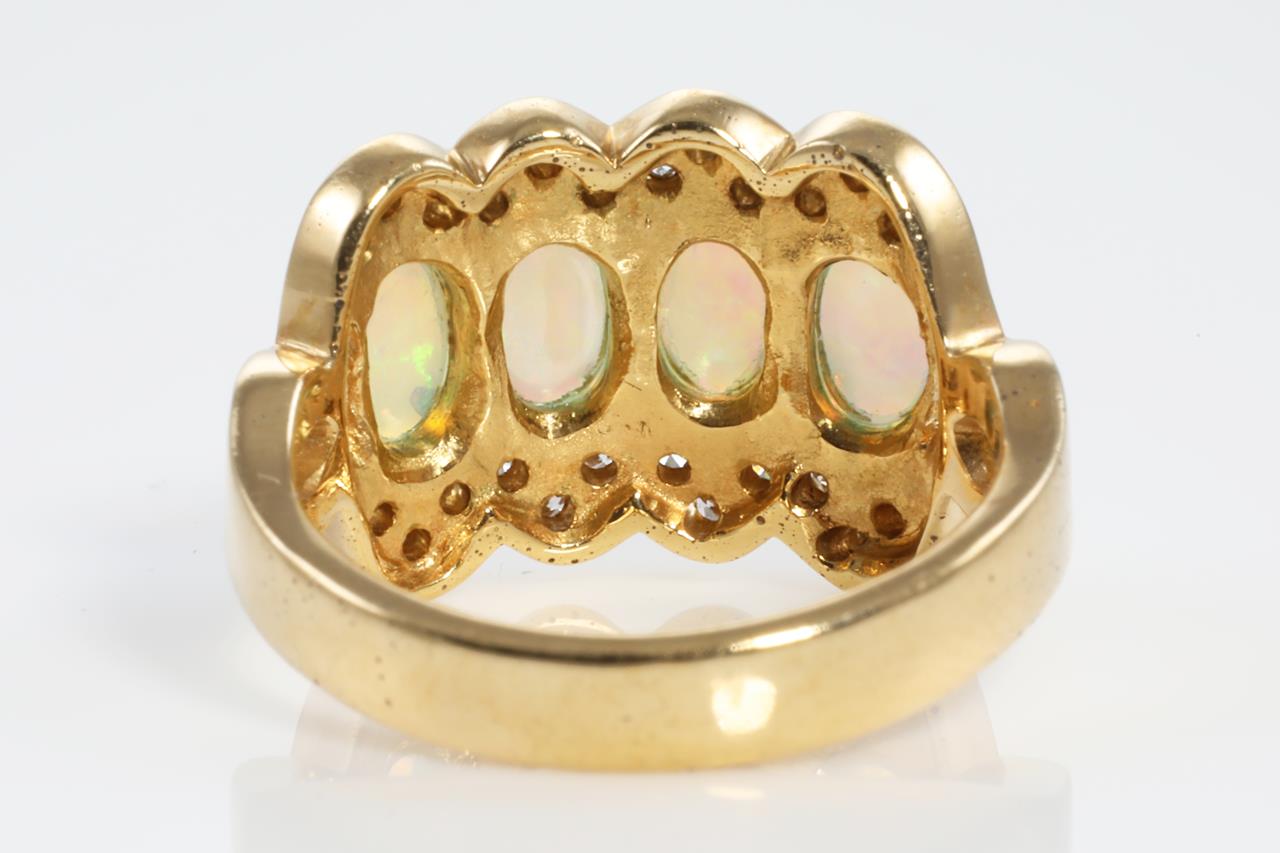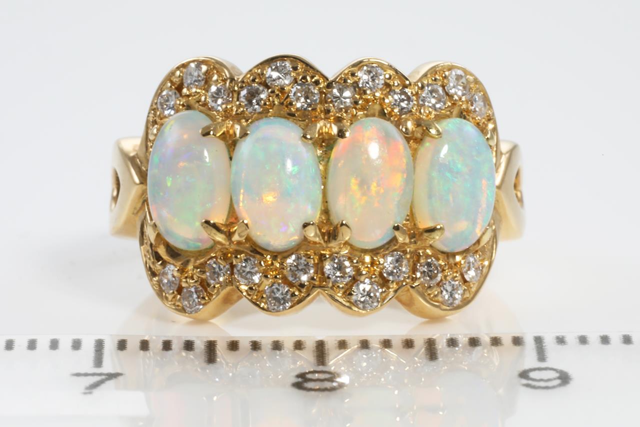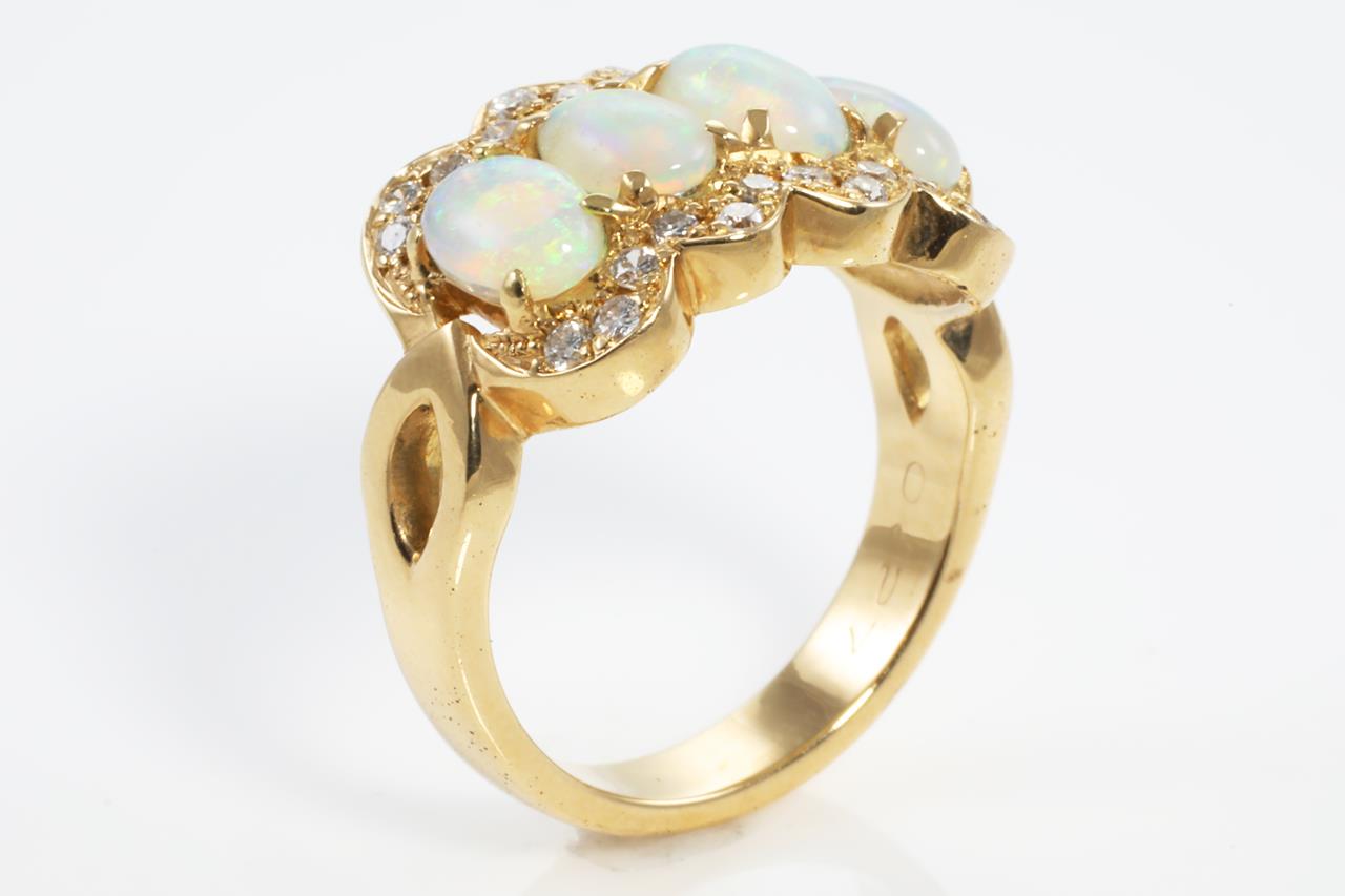 Opal and Diamond ring with 4 oval white Opals and round Diamonds totalling 0.27cts. 18ct yellow gold. Ring size K. Weight: 6.6g (pre-owned)