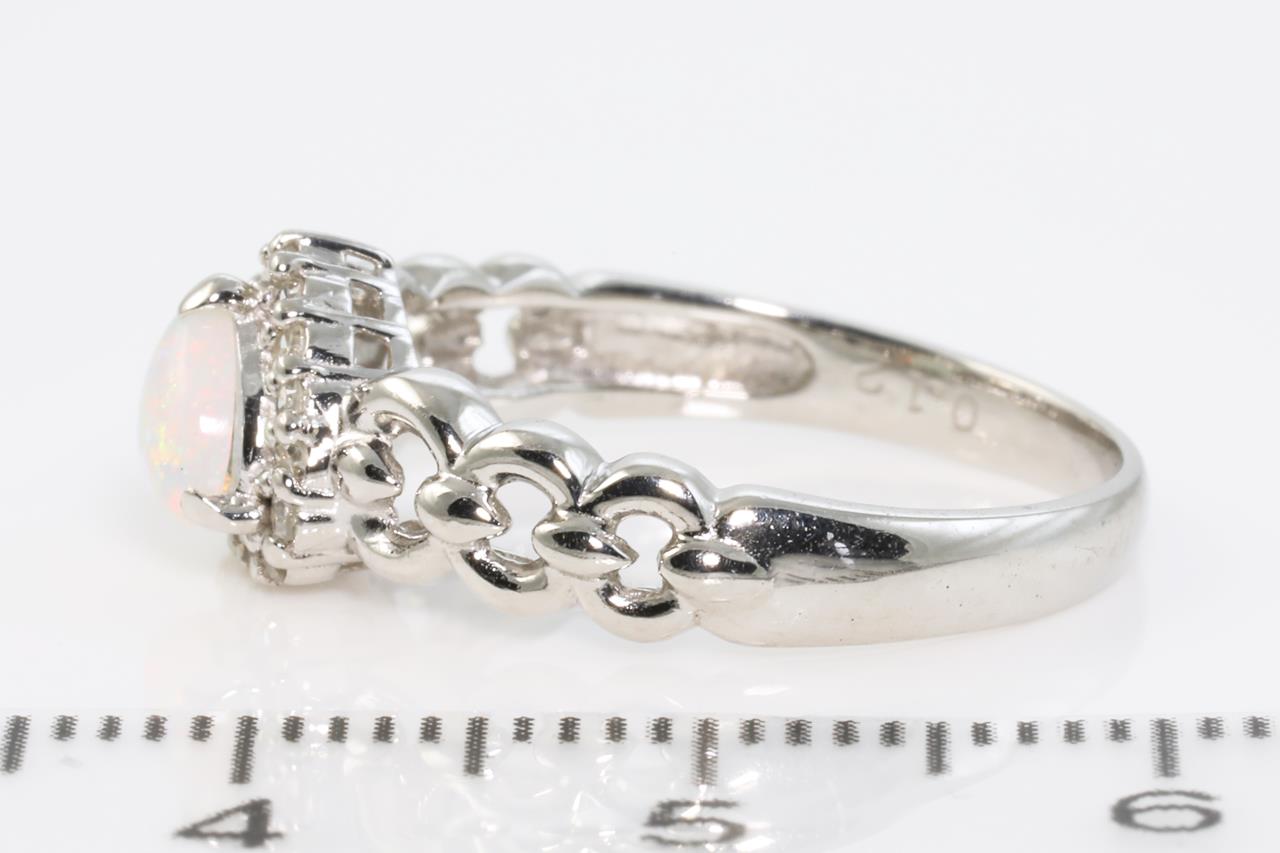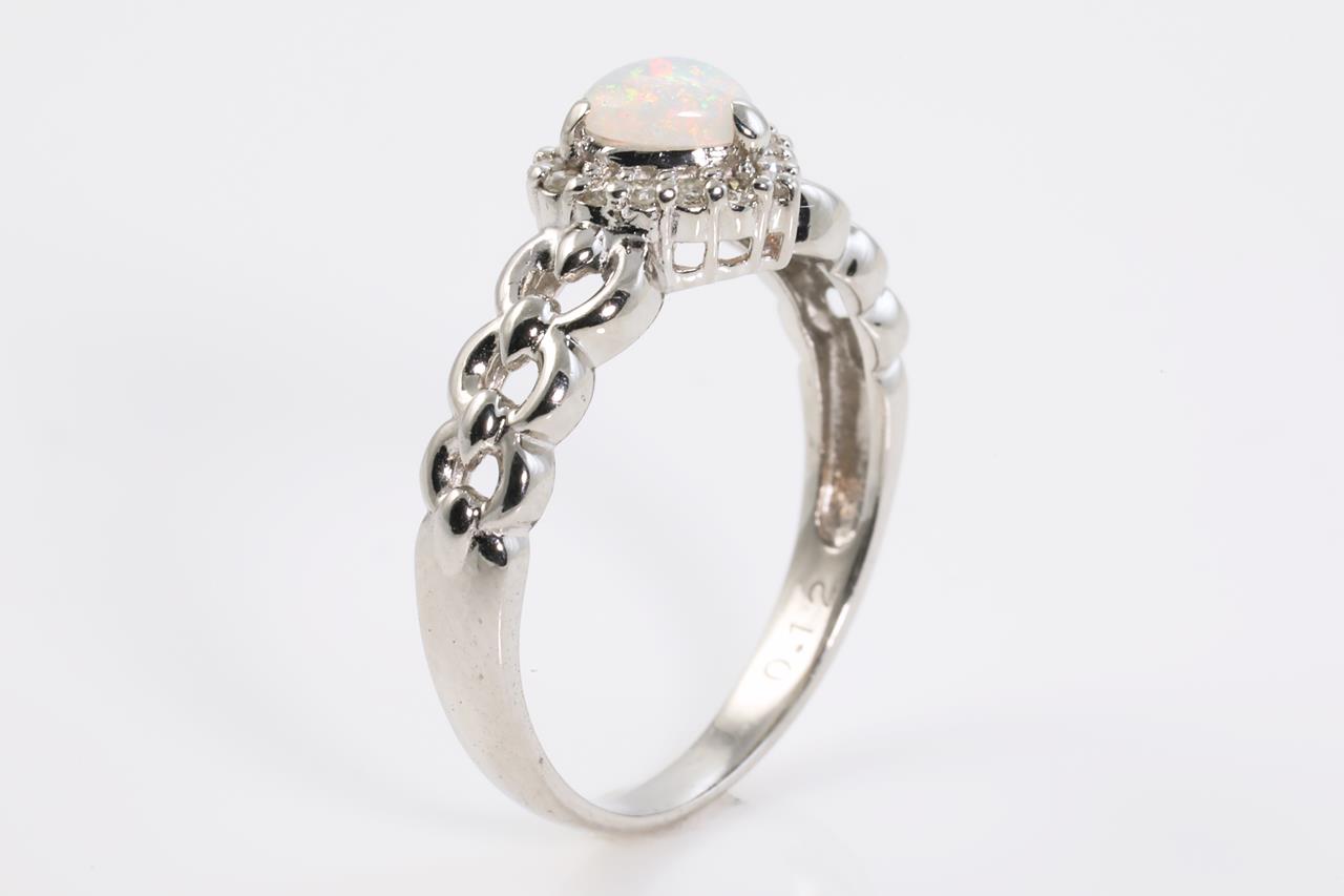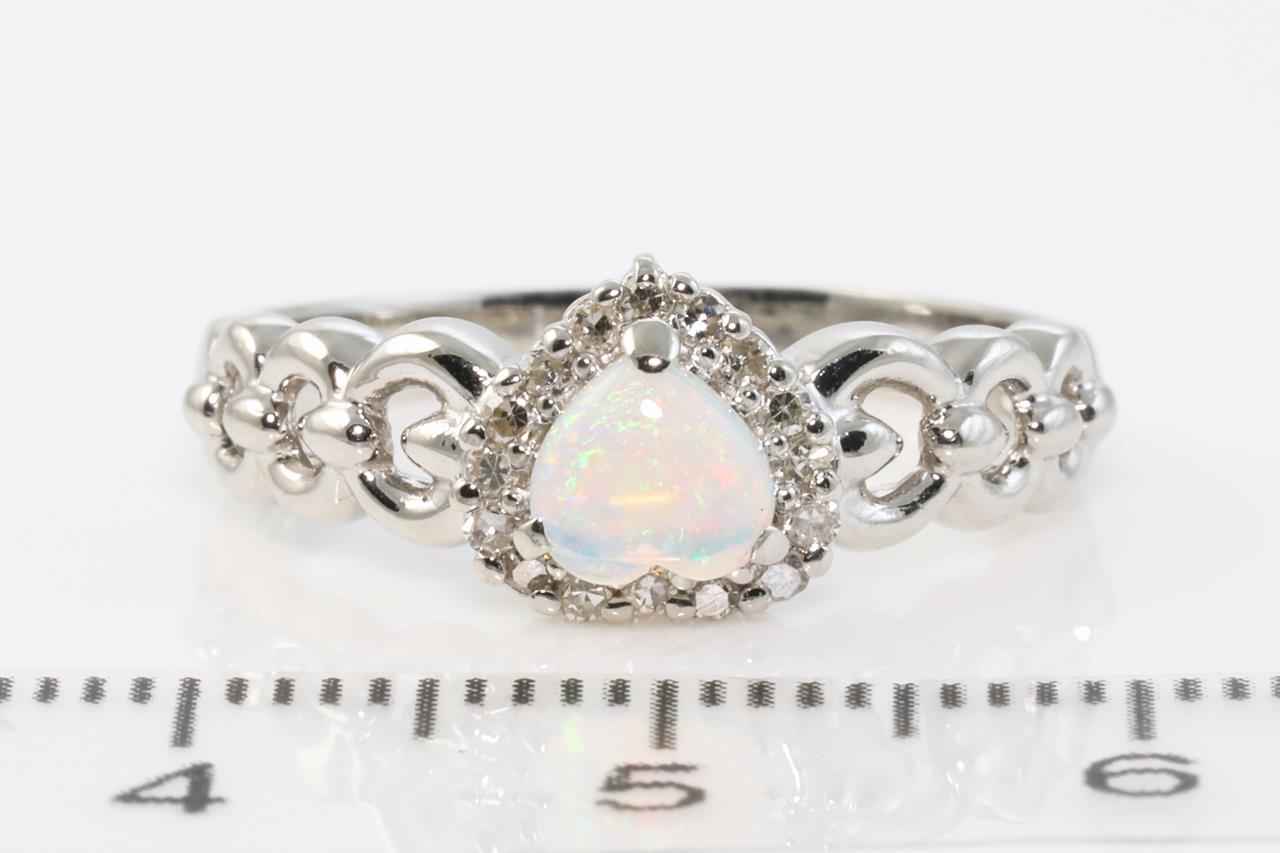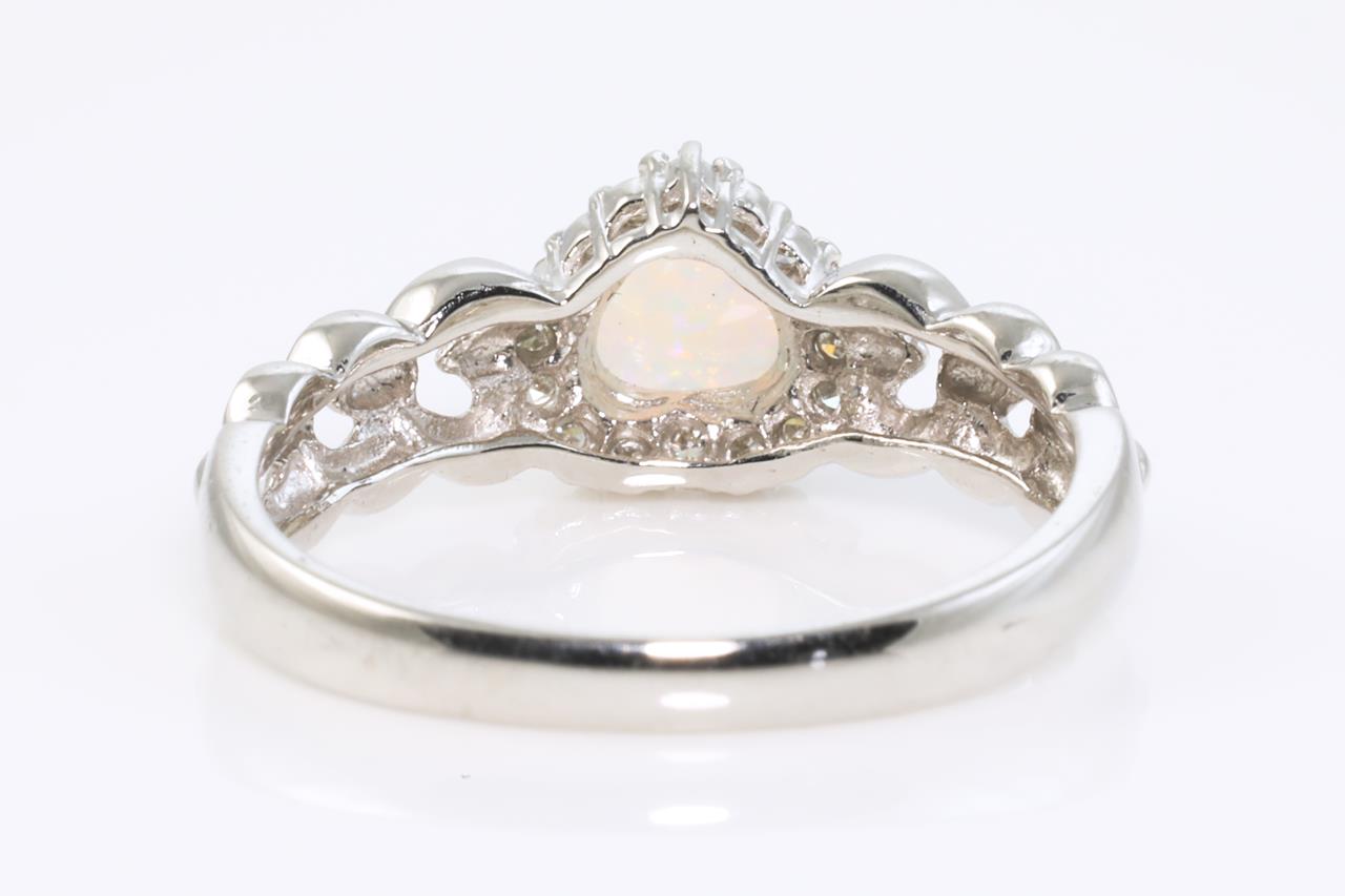 Opal and Diamond ring with heart shaped white Opal and round Diamonds totalling 0.12cts. Platinum. Ring size M1/2. Weight: 3.7g (pre-owned)