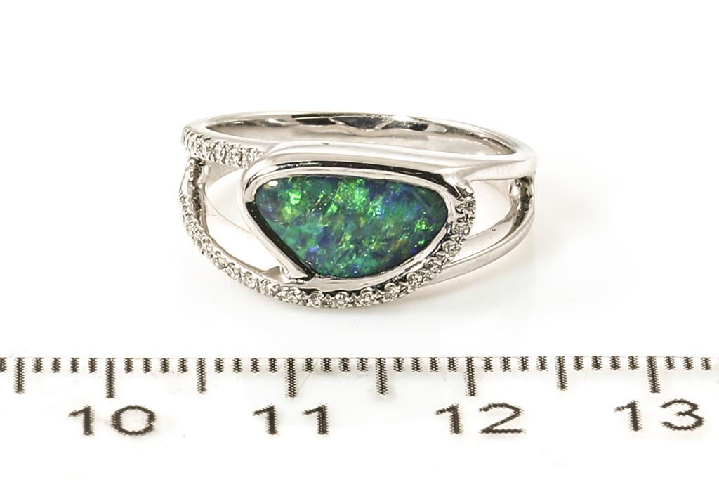 1840/ 87: Opal and Diamond Ring with 1.89ct boulder opal and round Diamonds totalling approximately 0.08ct. 18ct white gold. Ring size N. Weight 5.15g. (As New)