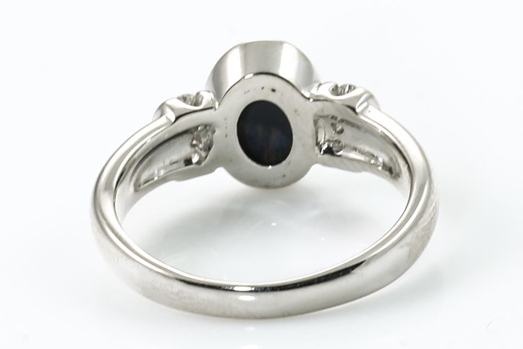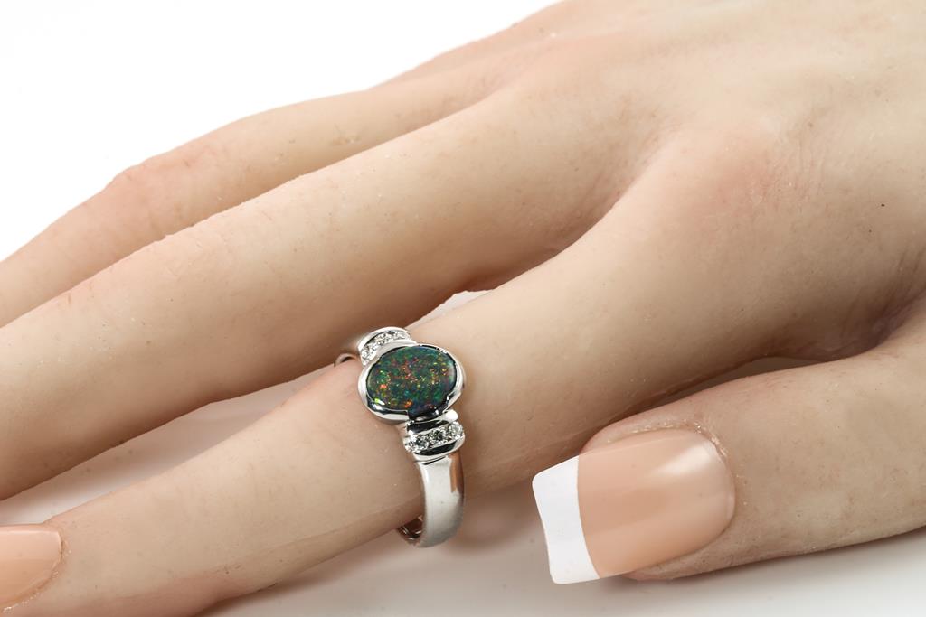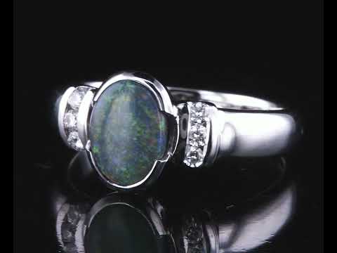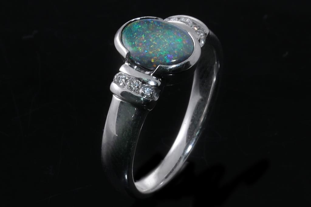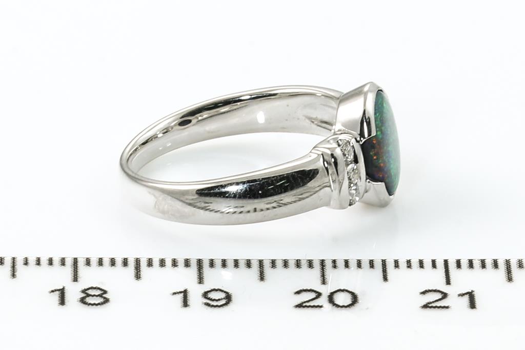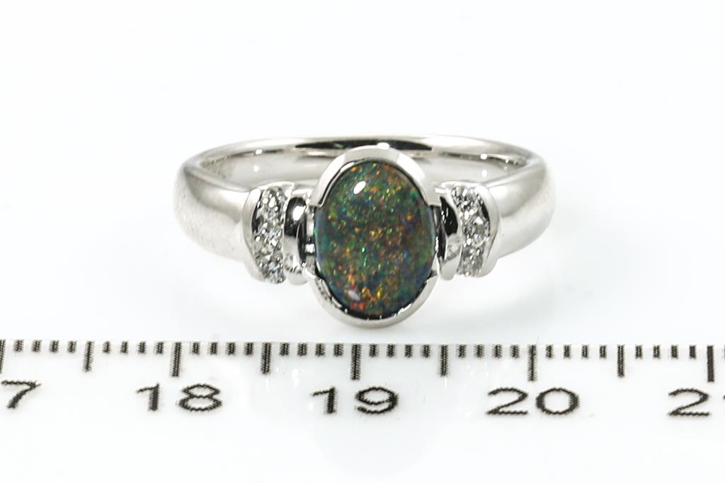 1840/ 221: Opal and Diamond Ring with cabochon cut boulder opal of 1.00ct and round Diamonds totalling approximately 0.12cts. 18ct white gold. Ring size P 1/2. Weight 6.0g. (As New)