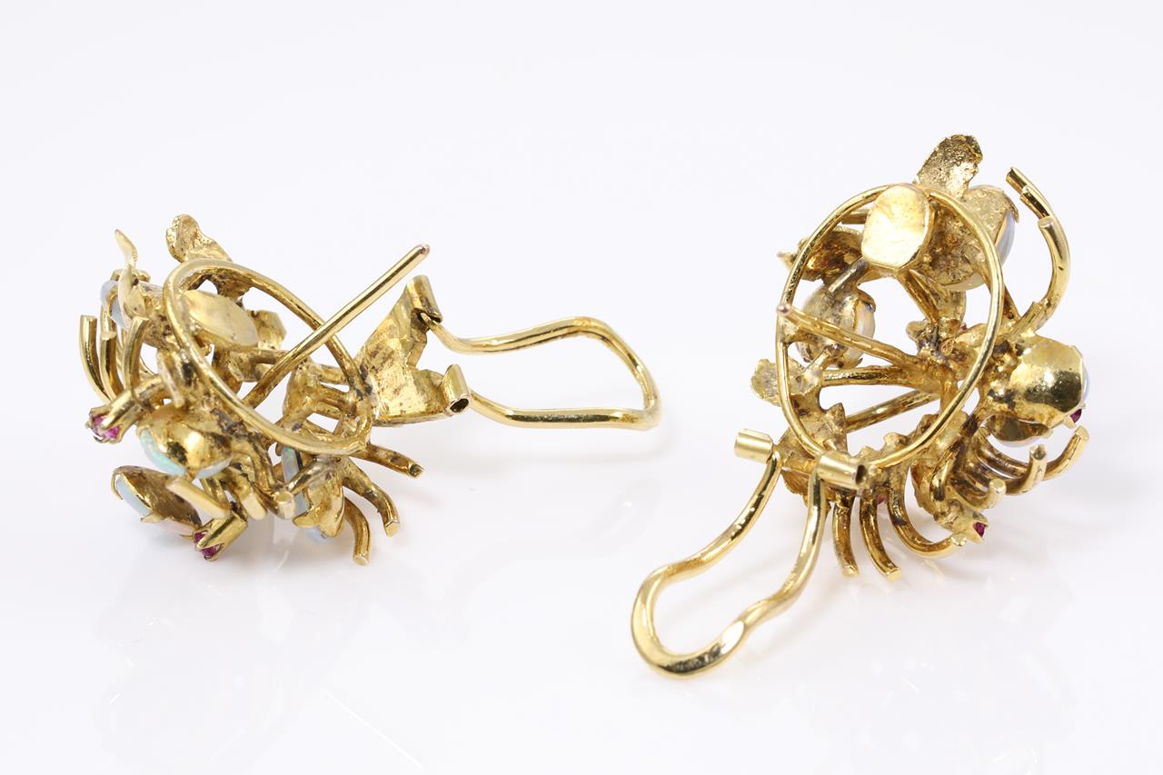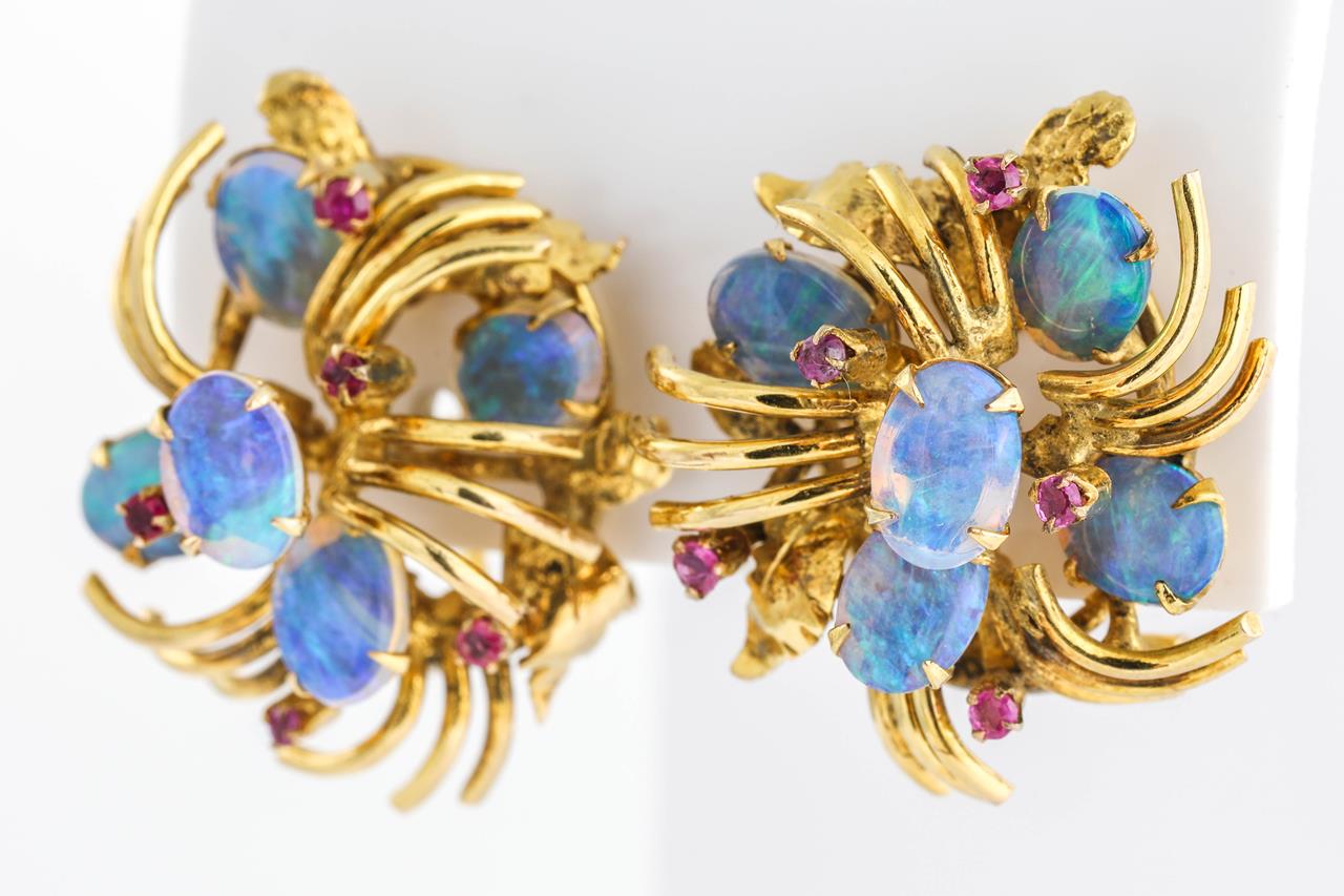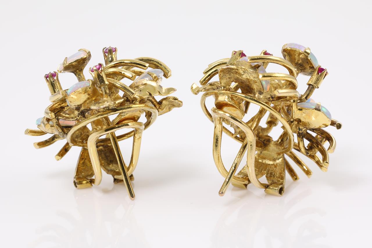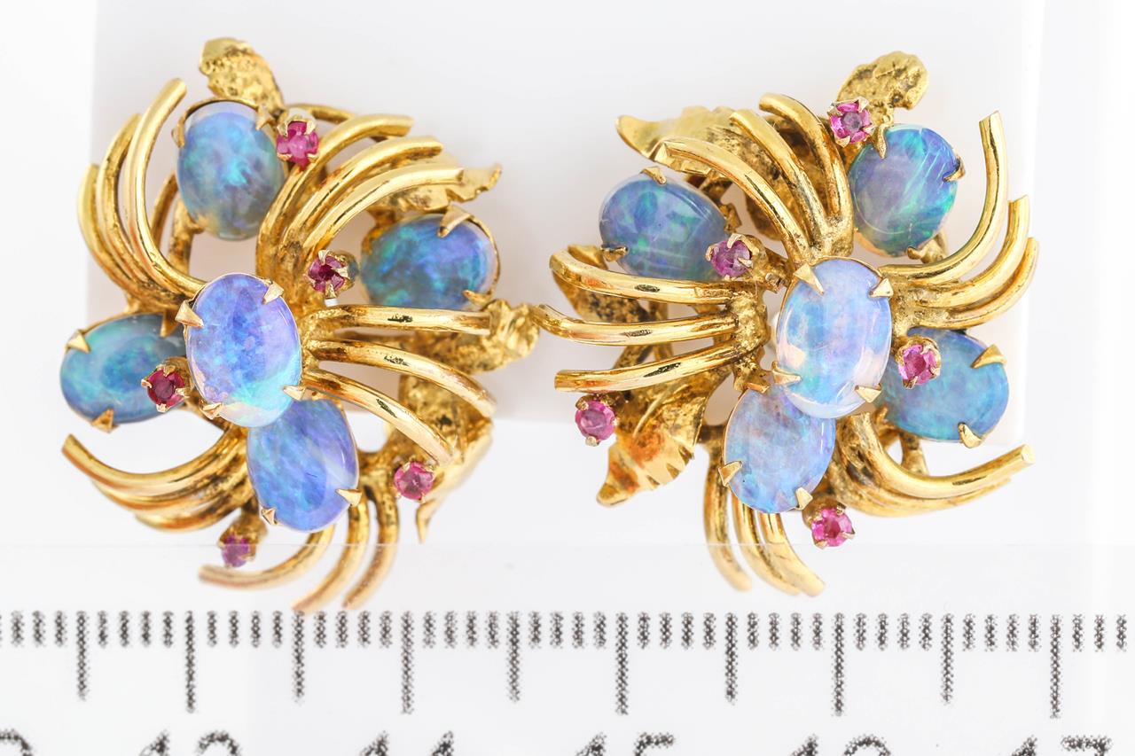 Opal and Ruby Clip-on earrings with cabochon cut solid Opals totalling approximately 2.00cts and 10 round Rubies. 9ct yellow gold. Weight 12.3g. (As New)
