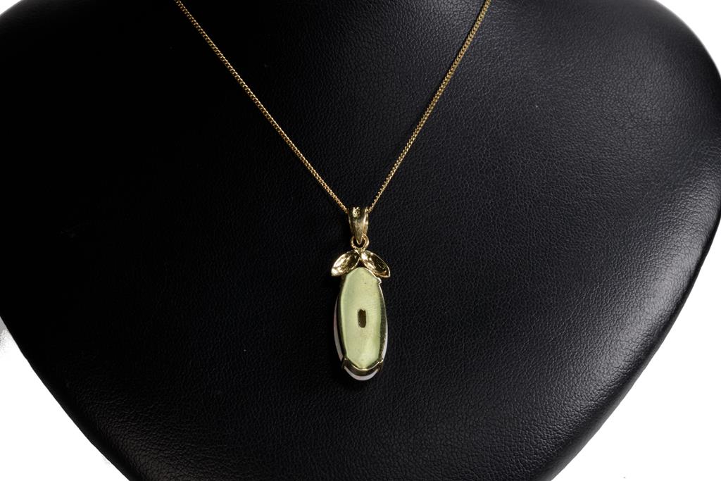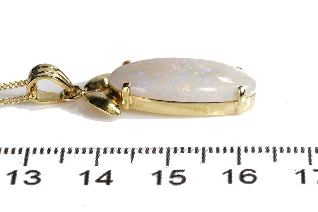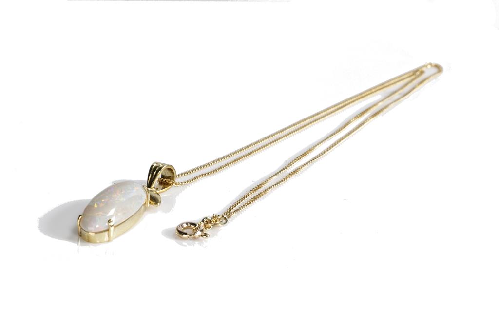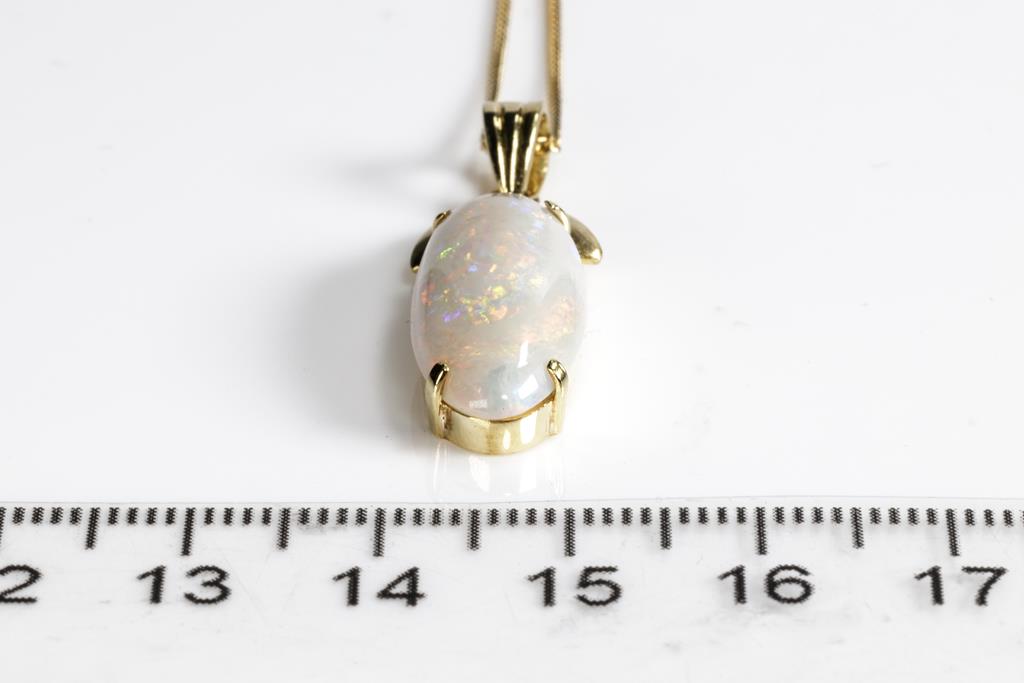 Opal Pendant with oval cabochon cut white Opal of approximately 3.5ct (22.1 x 9.7 x 2.9mm), 18ct yellow gold with 14ct yellow gold 44cm chain. Combined weight 5.5g. (Pre-owned)