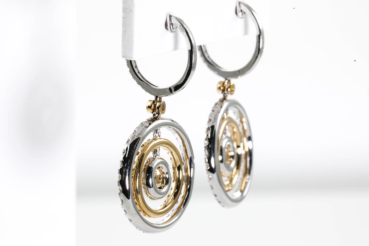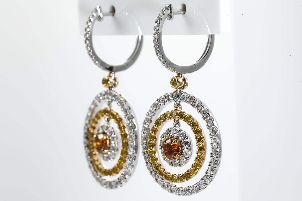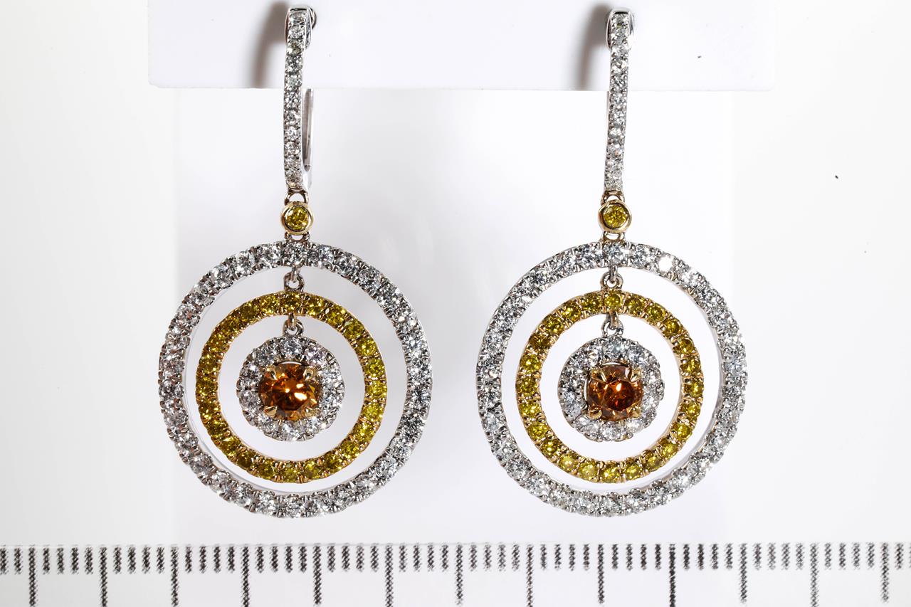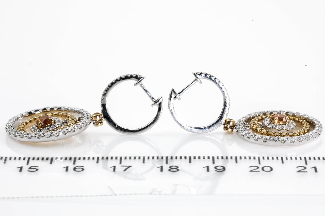 Diamond earrings with 2 round central Diamonds totalling 0.53cts (Estimated grading: Fancy Orange SI) and remaining Diamonds totalling 2.23cts (Estimated grading: Fancy Yellow, G-H SI). 14ct Yellow and White gold. Weight: 8.6g. With Certificate #414704. (As new)