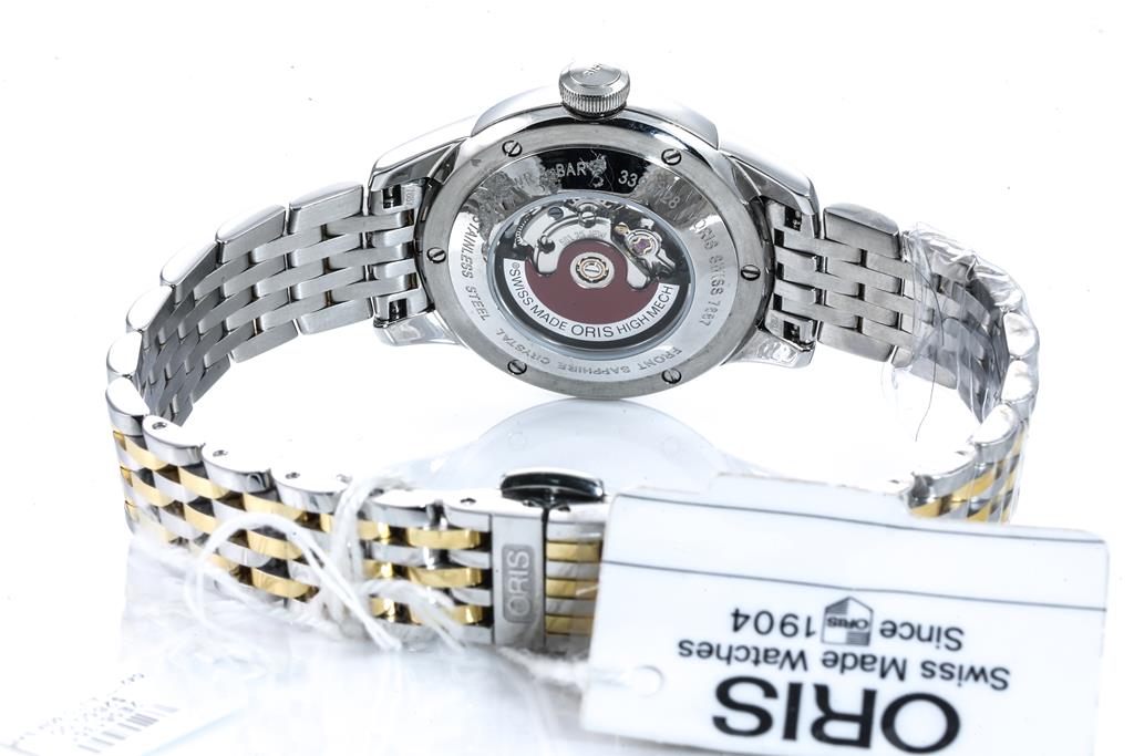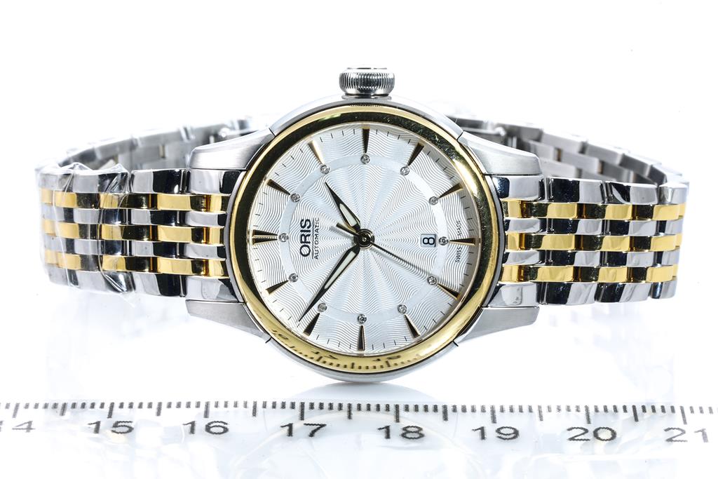 Oris Artelier stainless steel and gold plated automatic ladies watch. Silver dial, date, Diamond indicators, case diameter: 31mm, wrist size: 17cm, Swiss made. Ref# 561 7687 4351MB. With Oris two tone bracelet and clasp. With Oris warranty card (not stamped) and Precious Stones Certificate Card. No box provided. (As New, Note: minor scratches on case and bracelet)