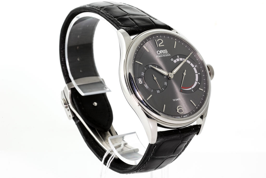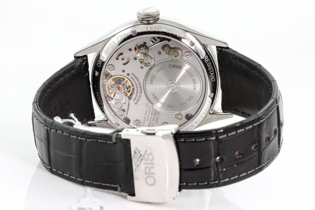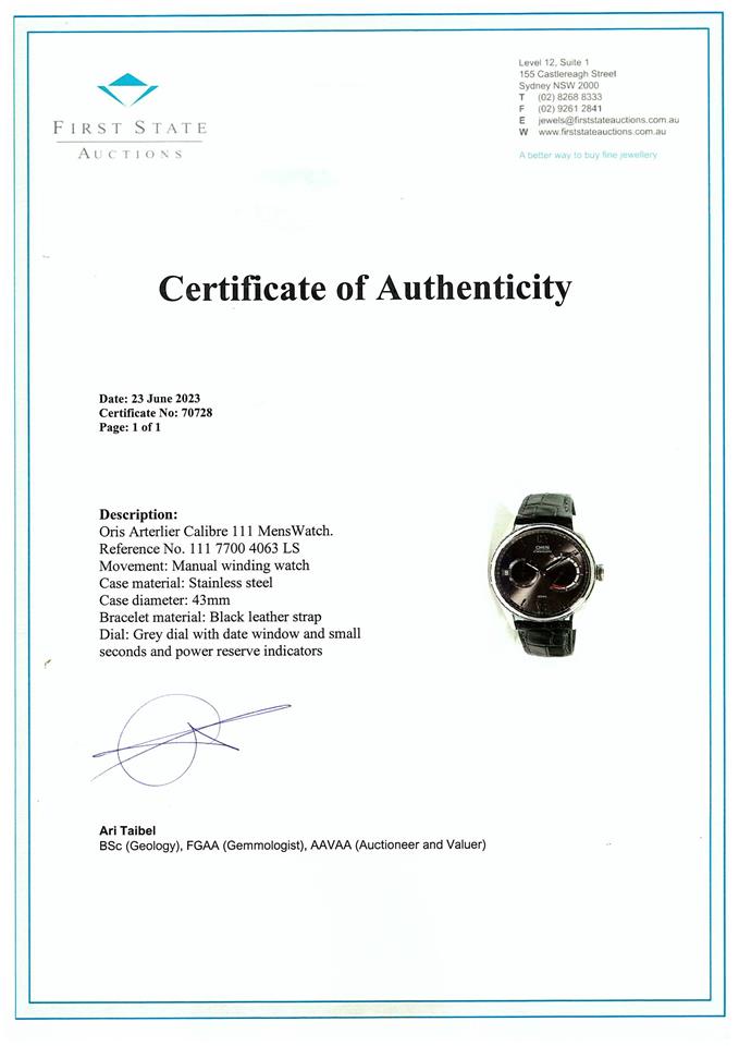 Oris Arterlier Calibre 111 stainless steel manual winding mens watch. Grey dial, date, case diameter: 43mm, adjustable max wrist size: 20cm, Swiss made. Ref# 111 7700 4063 LS. With Oris black leather strap and clasp. With FSA Certificate of Authenticity and Oris box. 3 month FSA warranty. (As New, Note: minor scratches on case and wear on strap due to being display stock)