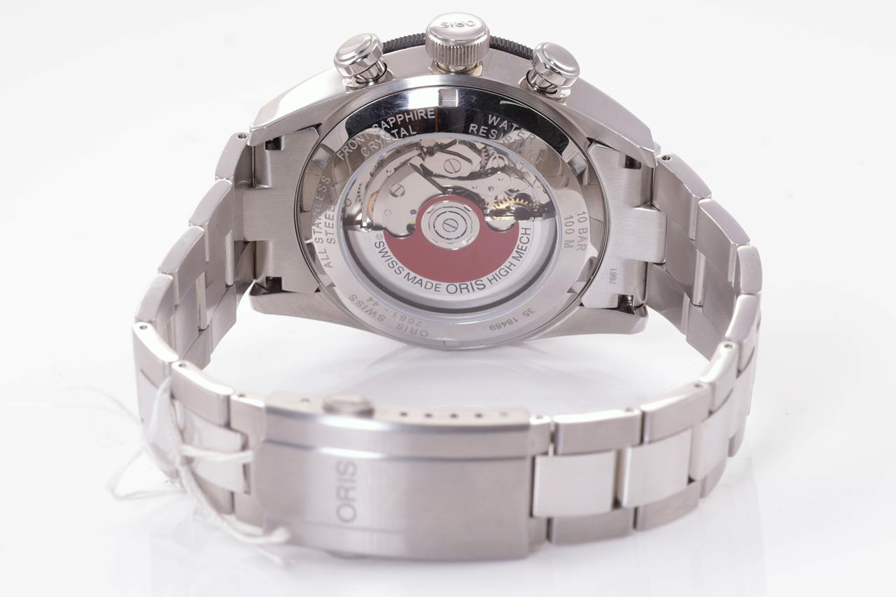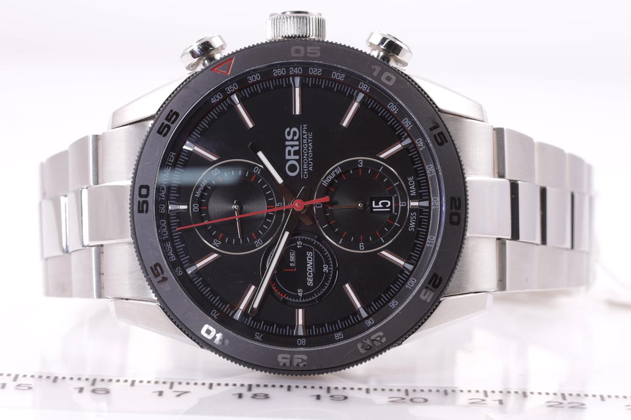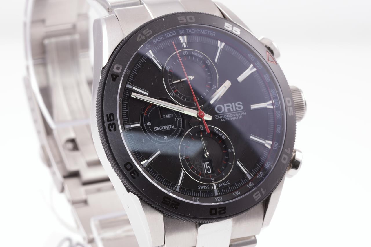 Oris Artix GT stainless steel automatic mens watch. Black chronograph dial, date, case diameter: 44mm, wrist size: 20cm, Swiss made. Ref# 774 7661 4424 MB. With Oris stainless steel bracelet and clasp. Note: minor scratches on case and bracelet due to being display stock. With Oris Warranty Card (not stamped). No box provided. 3 month FSA warranty. (As New)