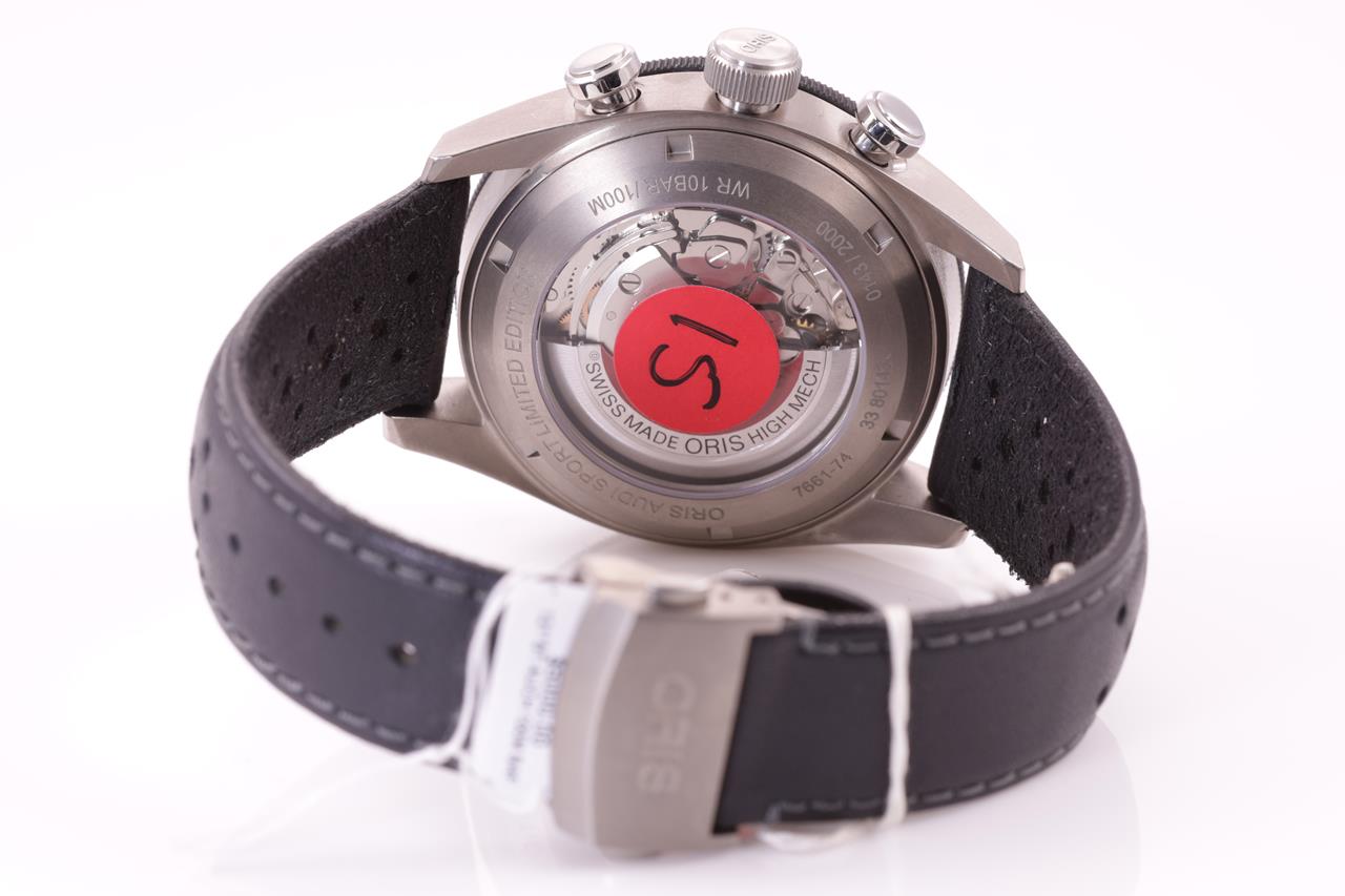 Oris Audi Sport Limited Edition of 2000 titanium automatic mens watch. Grey dial, date, case diameter: 44mm, wrist size: 19cm, Swiss made. Ref# 774 7661 7481 LS. With Oris black leather strap and clasp. Note: scratches on case and light wear on strap due to being display stock. With Oris Warranty Card (not stamped). No box provided. 3 month FSA warranty. (As New)