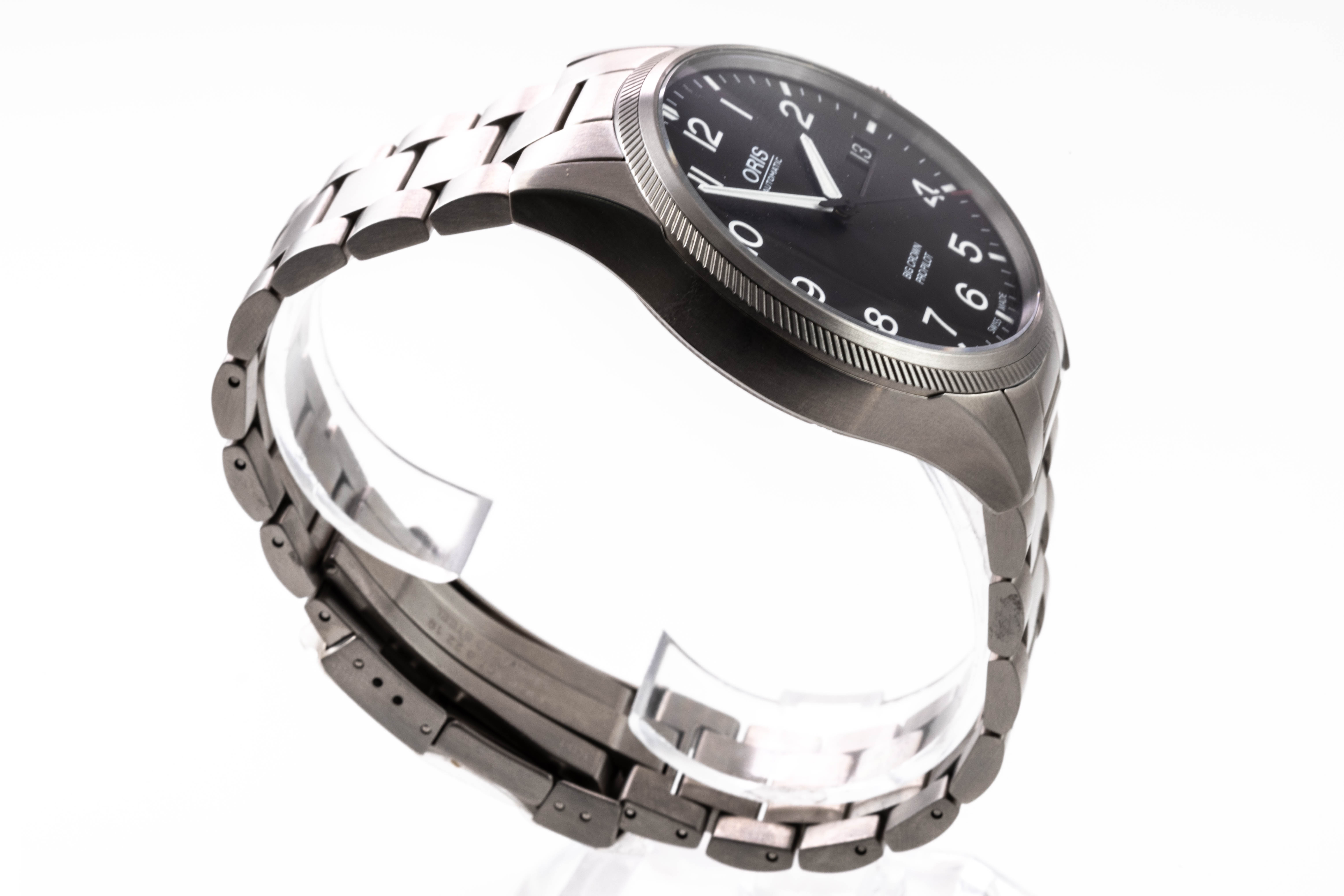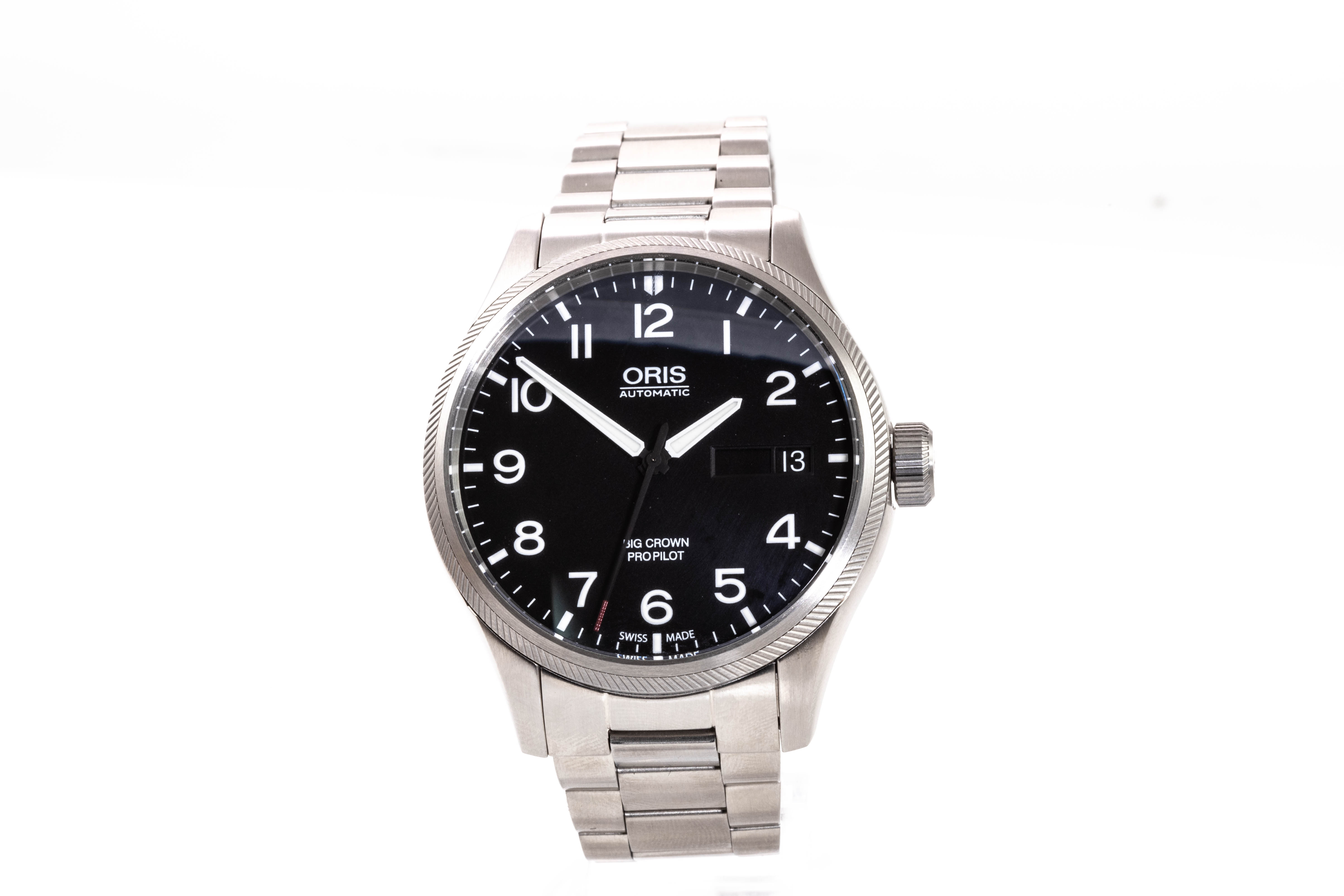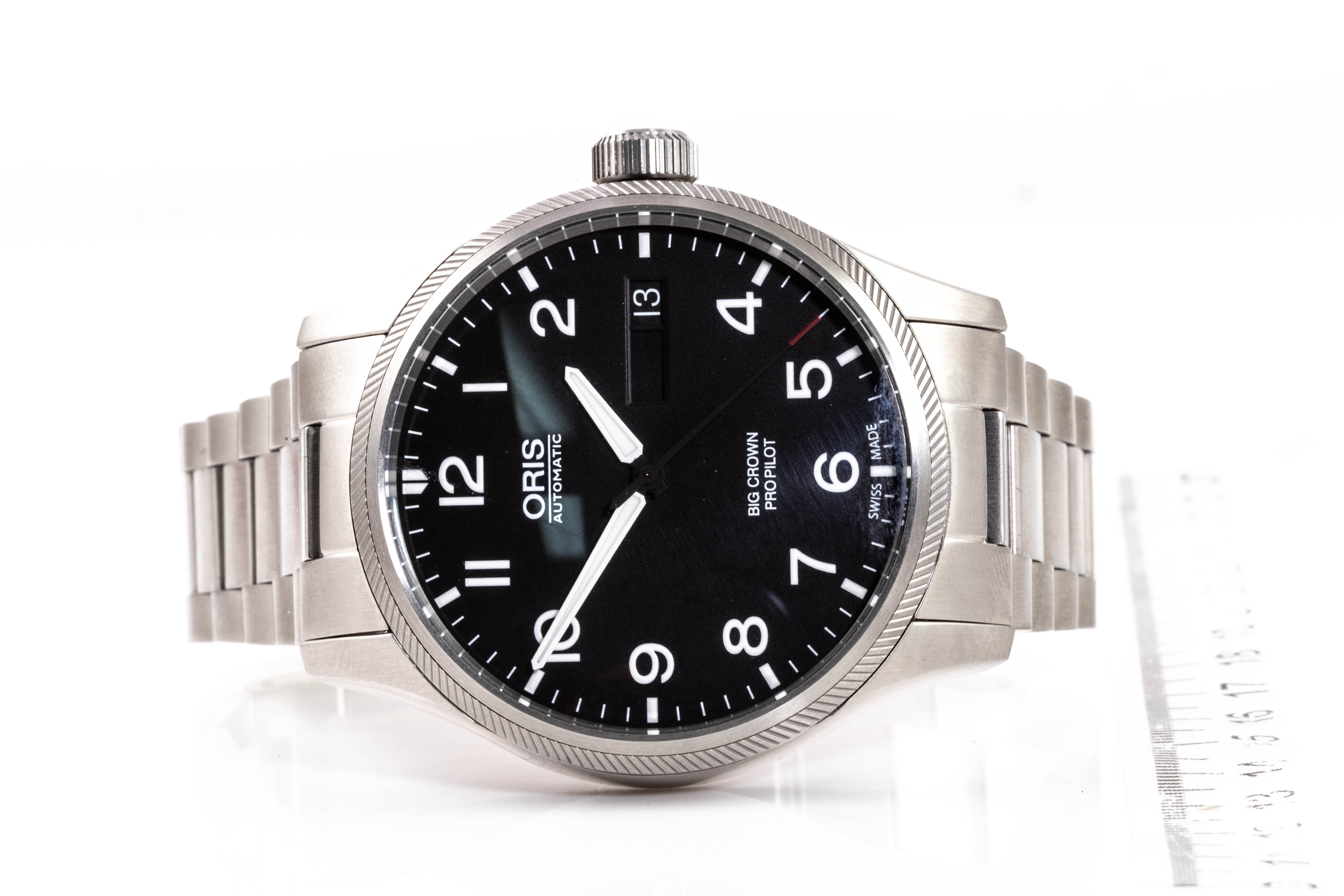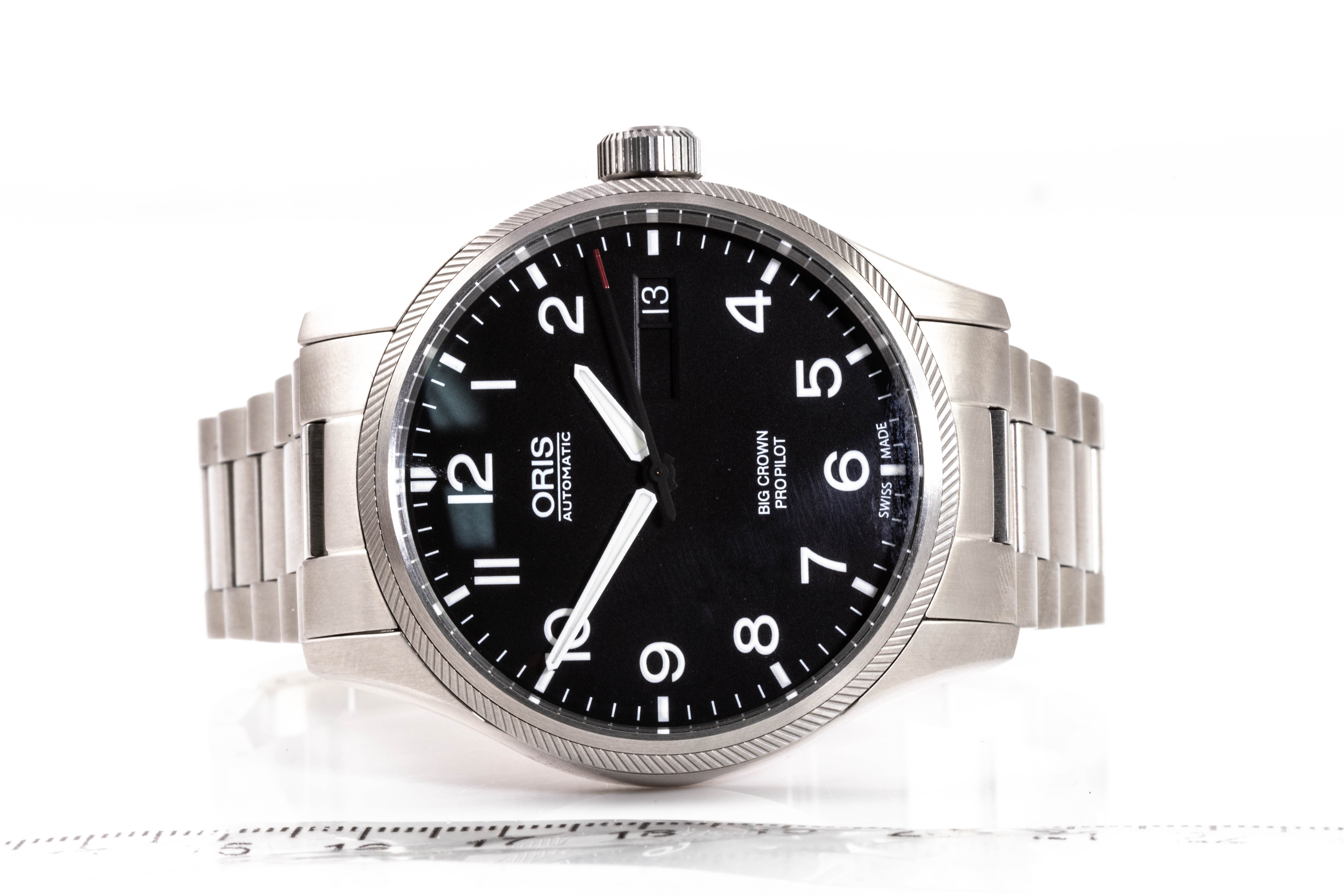 Oris Big Crown ProPilot Big Day Date stainless steel automatic men's watch. Black dial, day & date, case diameter: 45mm, wrist size: 20cm, Swiss made. Ref# 752 7698 4164 MB. With Oris stainless steel bracelet and clasp. With FSA Oris Warranty Card - the card is not stamped so the Oris warranty will not apply. 3 month FSA warranty. No box provided. (As New, Note: minor scratches on case and bracelet due to being display stock)